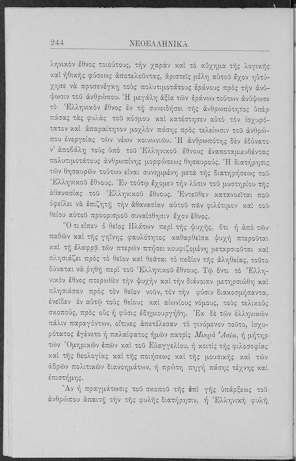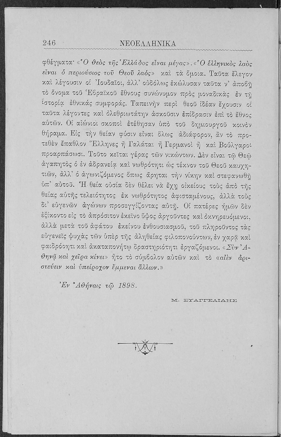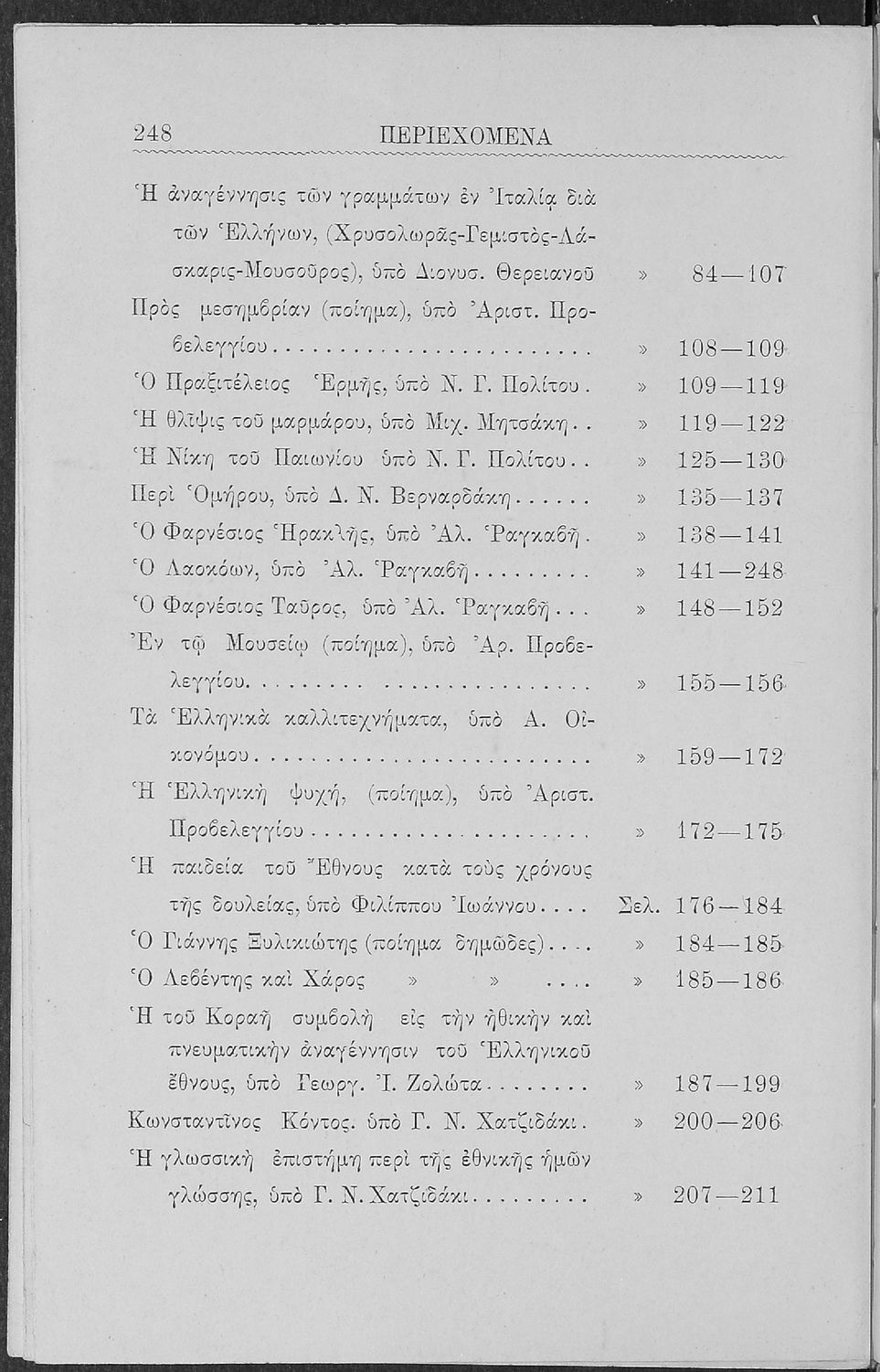 Σχολικό εγχειρίδιο Νέων Ελληνικών του 1889. Περιέχει πεζά και ποιήματα Ελλήνων λογοτεχνών εμπνευσμένα από την καθημερινή και ιστορική ζωή του τόπου. Έχει την έγκριση του Υπουργείου Δημόσιας Εκπαίδευσης.