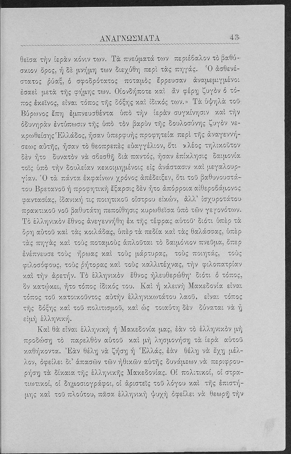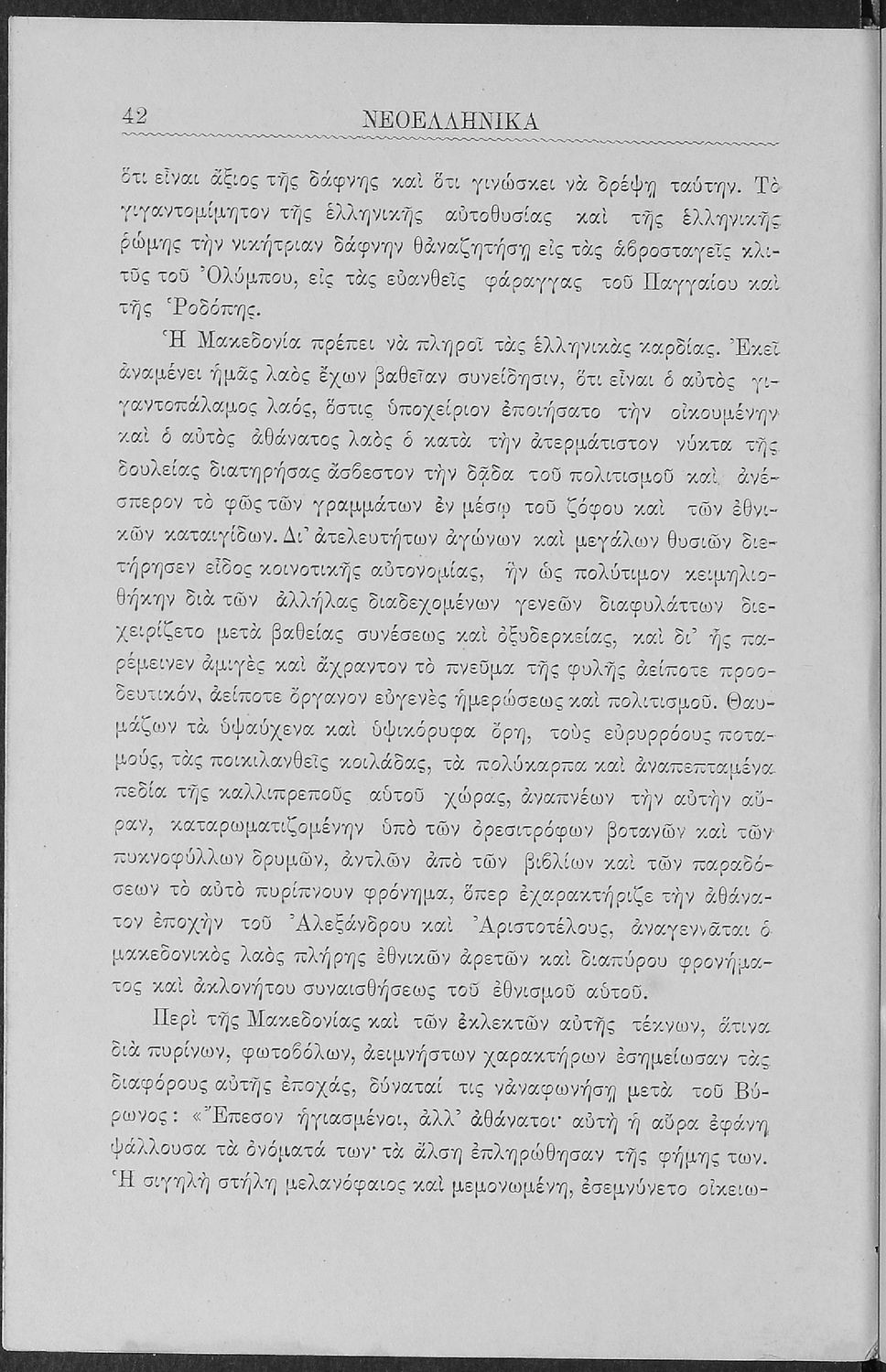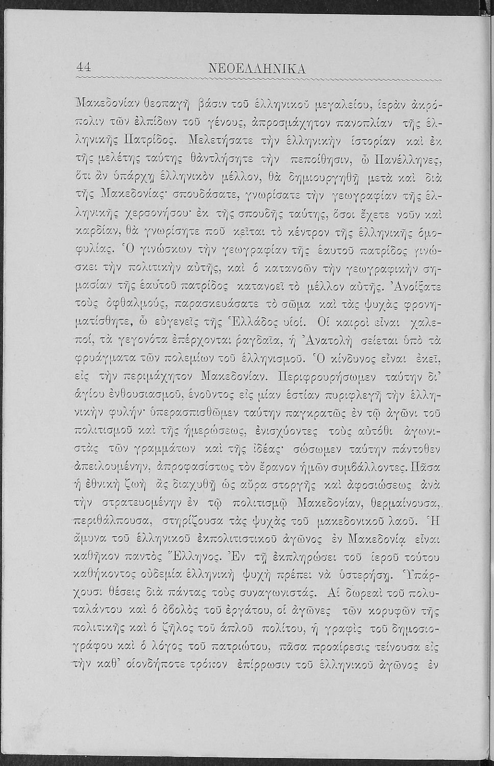 Παρουσίαση περιεχομένου: Σχολικό εγχειρίδιο Νέων Ελληνικών για όλες τις τάξεις του Γυμνασίου με πεζά και ποιήματα Ελλήνων λογοτεχνών και ποιητών. Η θεματολογία του από την αρχαιότητα και την ιστορική ζωή του τόπου. Το βιβλίο είχε εγκριθεί για μια τετραετία από το 1909-1913.