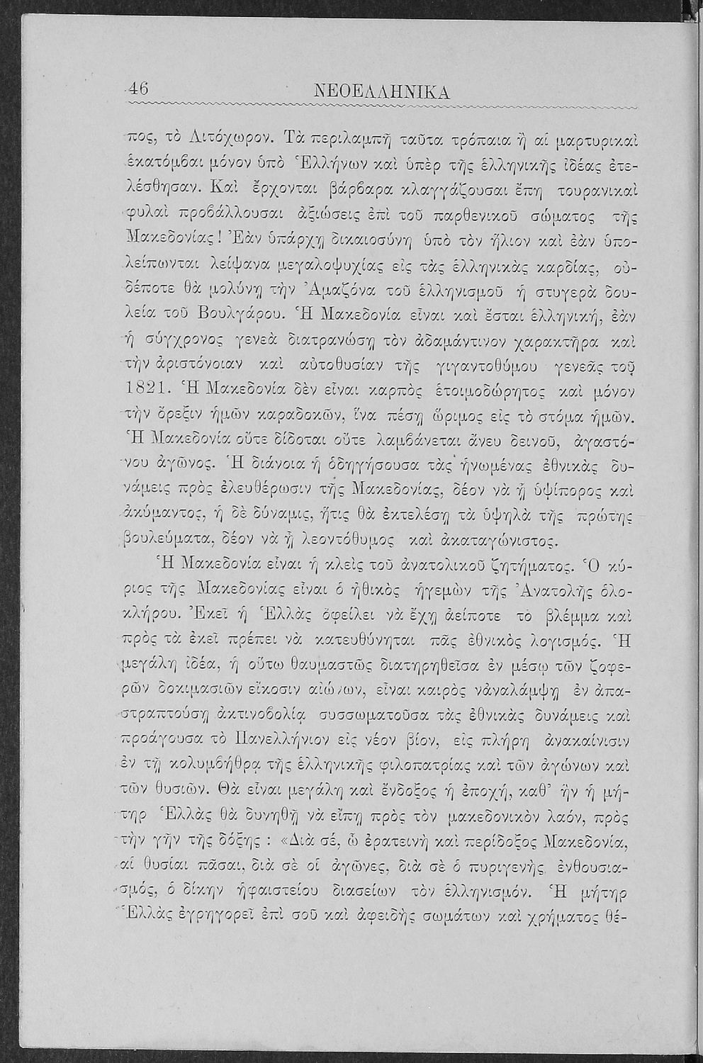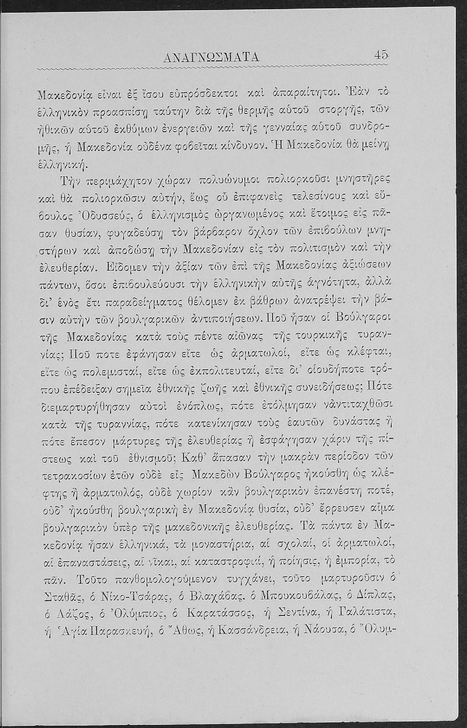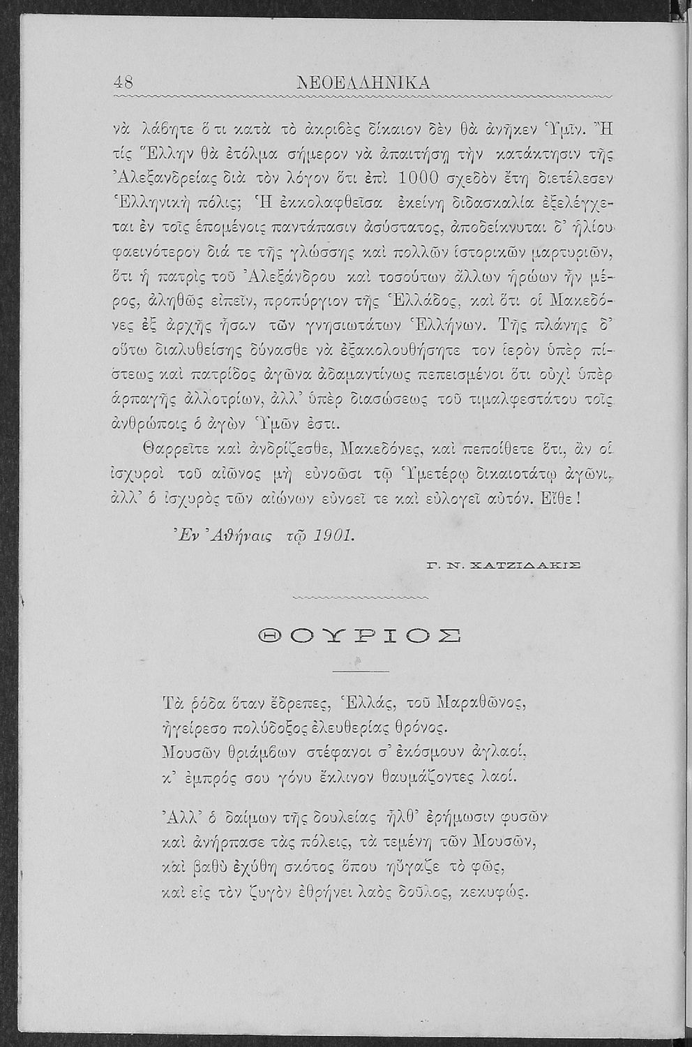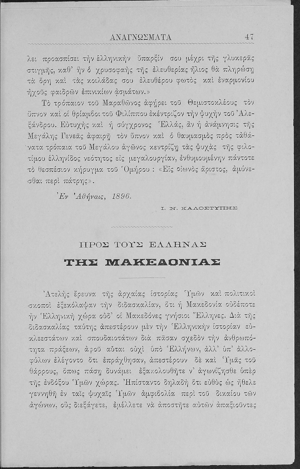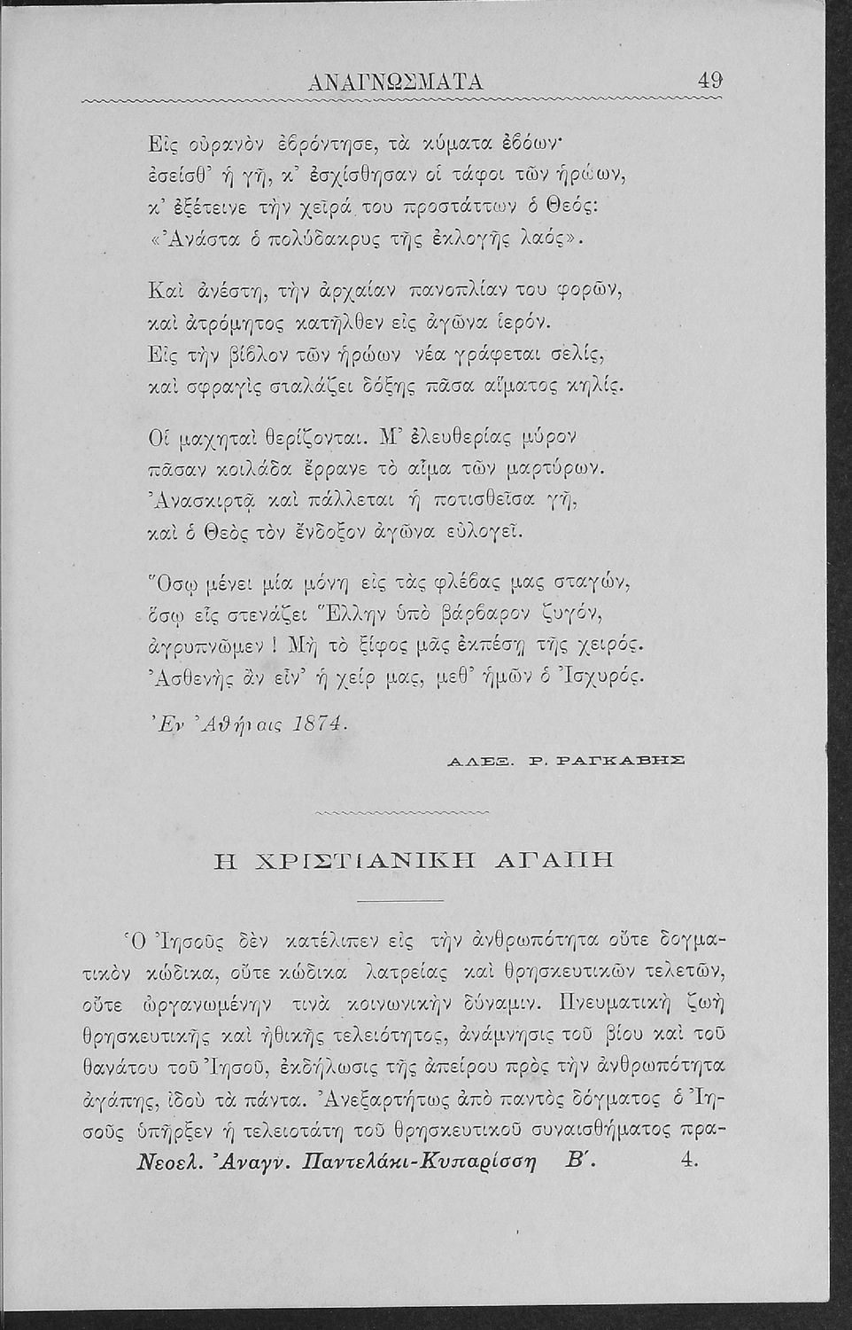 Σχολικό εγχειρίδιο Νέων Ελληνικών του 1889. Περιέχει πεζά και ποιήματα Ελλήνων λογοτεχνών εμπνευσμένα από την καθημερινή και ιστορική ζωή του τόπου. Έχει την έγκριση του Υπουργείου Δημόσιας Εκπαίδευσης.