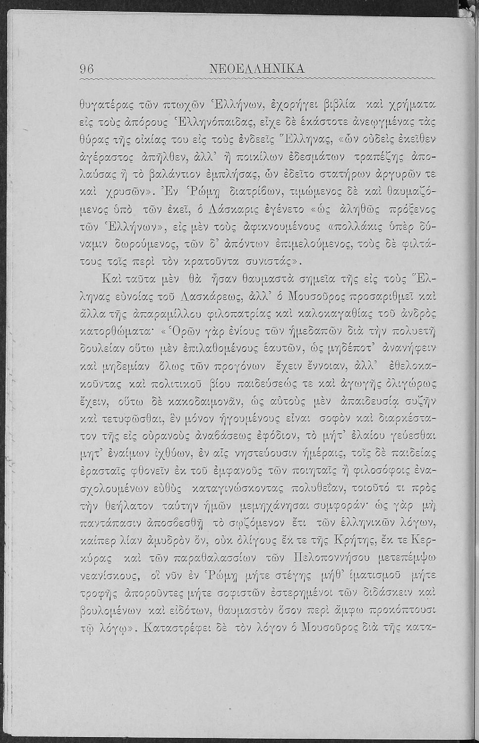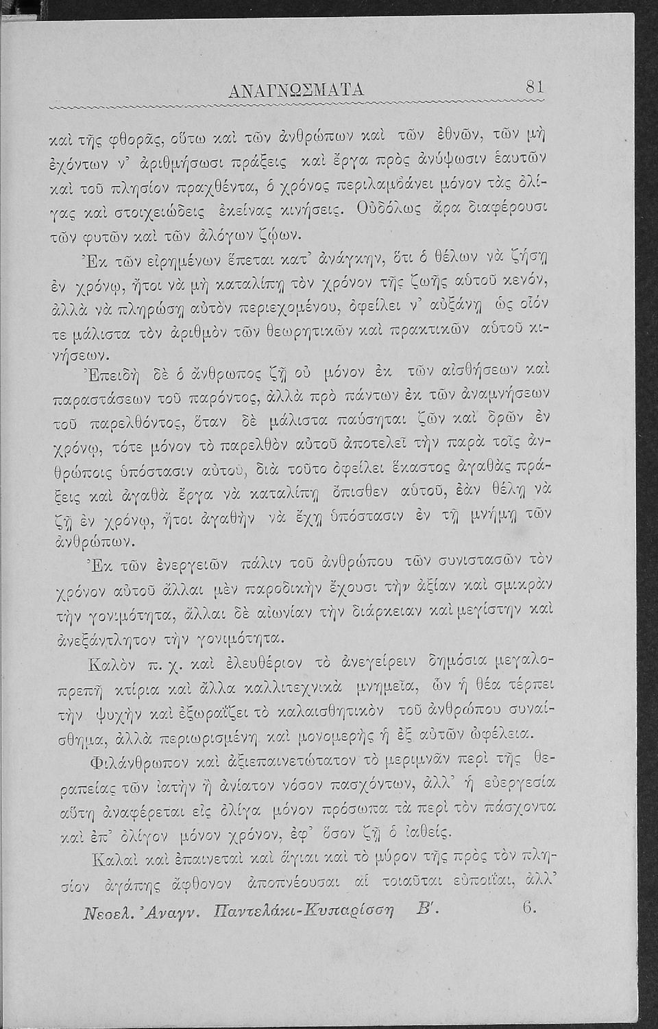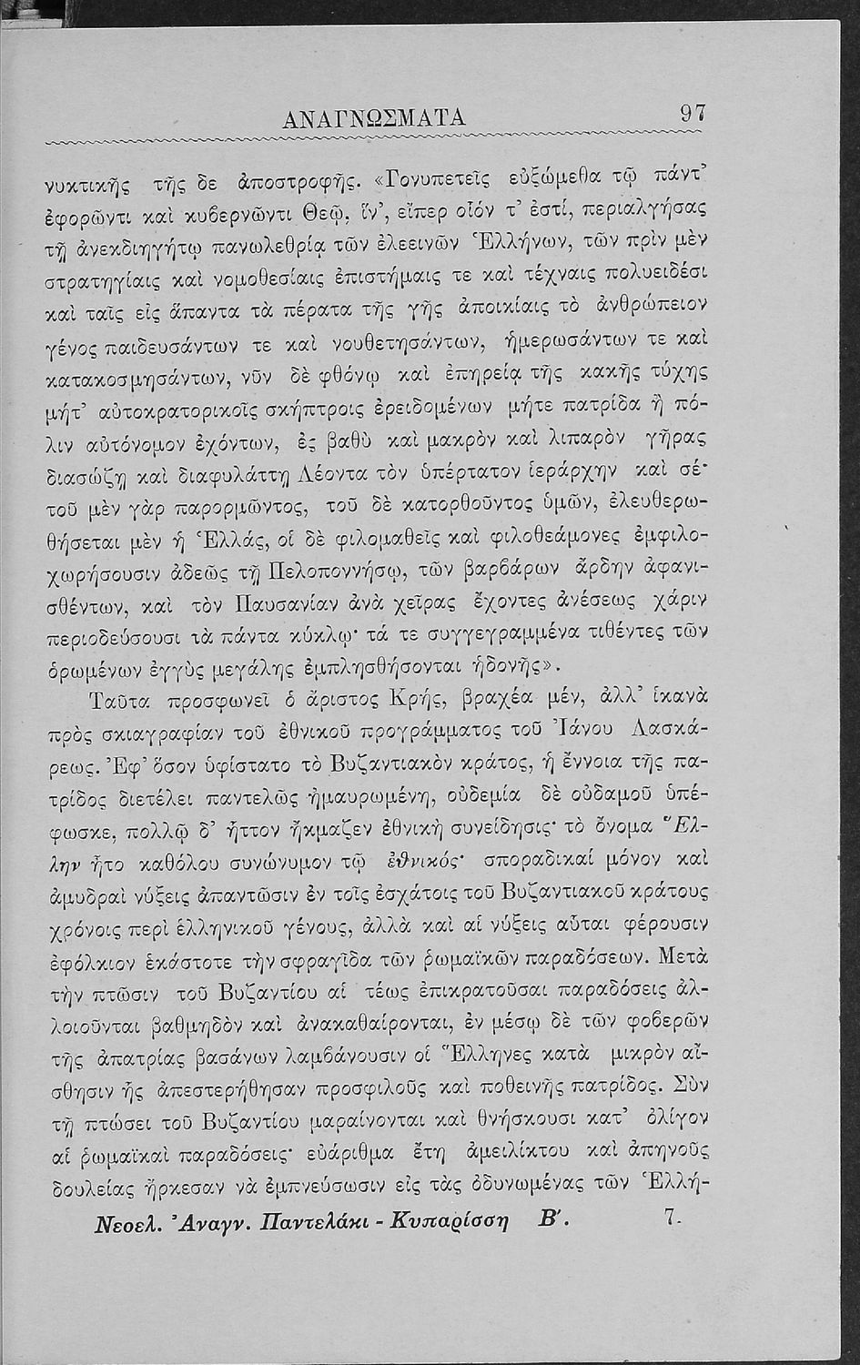 Σχολικό εγχειρίδιο Νέων Ελληνικών του 1889. Περιέχει πεζά και ποιήματα Ελλήνων λογοτεχνών εμπνευσμένα από την καθημερινή και ιστορική ζωή του τόπου. Έχει την έγκριση του Υπουργείου Δημόσιας Εκπαίδευσης.