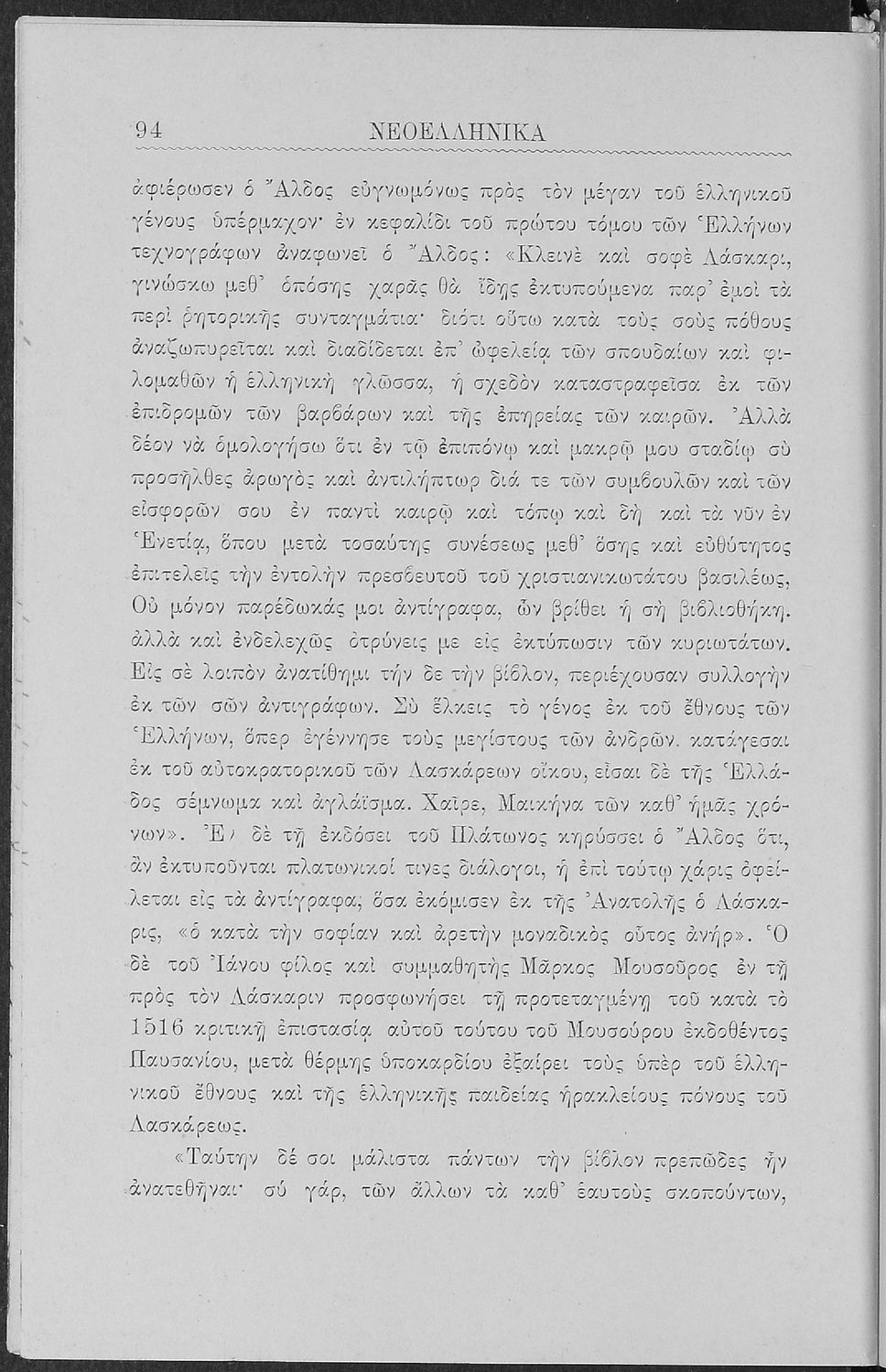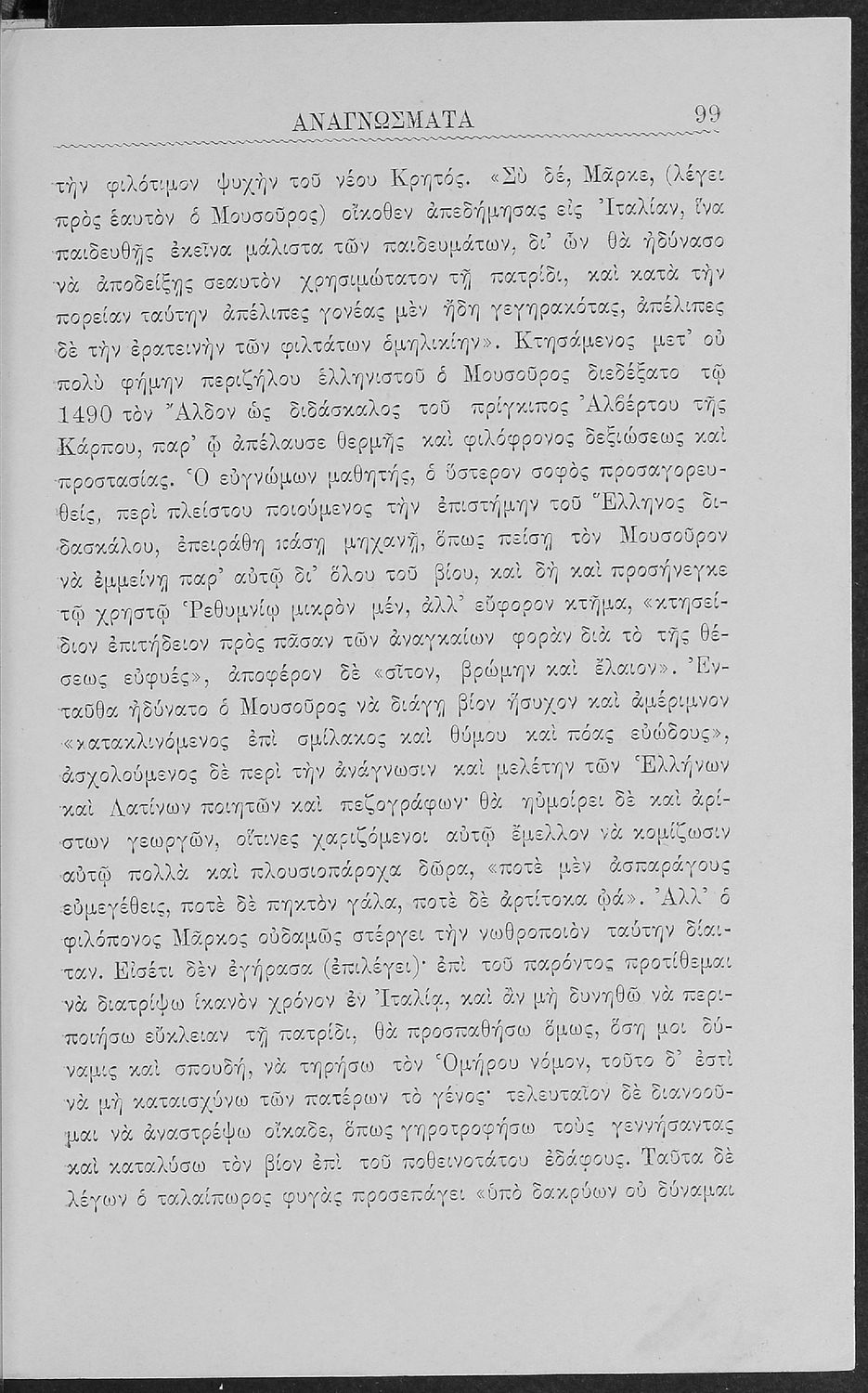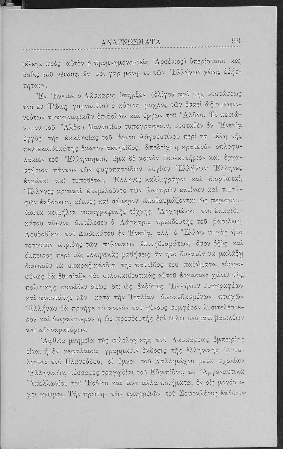 Παρουσίαση περιεχομένου: Σχολικό εγχειρίδιο Νέων Ελληνικών για όλες τις τάξεις του Γυμνασίου με πεζά και ποιήματα Ελλήνων λογοτεχνών και ποιητών. Η θεματολογία του από την αρχαιότητα και την ιστορική ζωή του τόπου. Το βιβλίο είχε εγκριθεί για μια τετραετία από το 1909-1913.