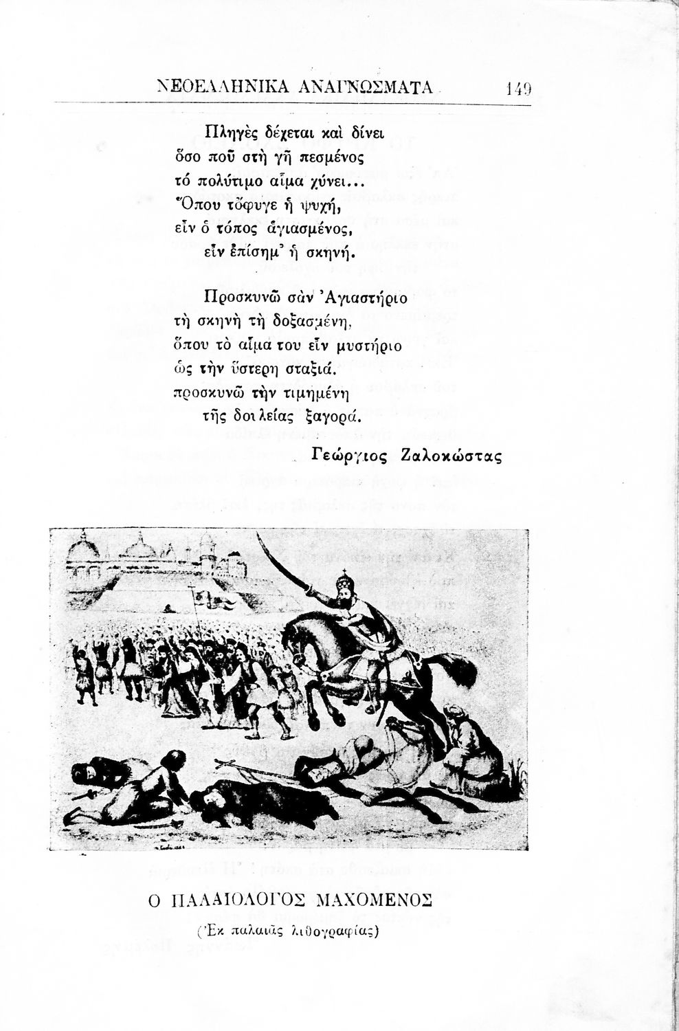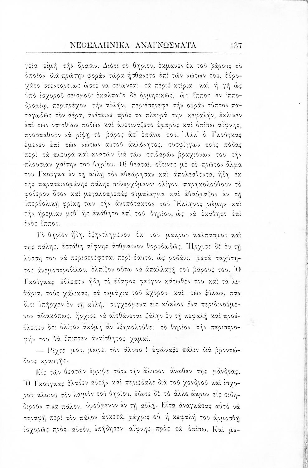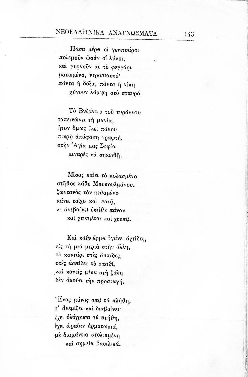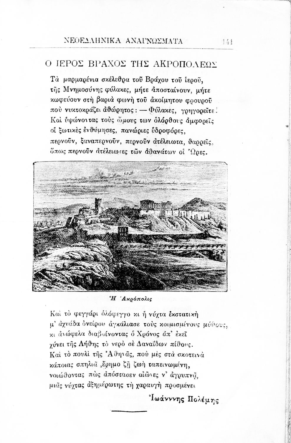 Βαθμίδα εκπαίδευσης: Δευτεροβάθμια Τάξη: Γ' Ελληνικού Σχολείου / Α' Αστικού Σχολείου Μάθημα: Νέα Ελληνικά Γλώσσα: Καθαρεύουσα / Δημοτική Παρουσίαση περιεχομένου: Σχολικό εγχειρίδιο Νέων Ελληνικών Γ' Ελληνικού και Α' Αστικού Σχολείου που περιλαμβάνει κείμενα Ελλήνων συγγραφέων εμπνευσμένα από την σύγχρονη ελληνική ιστορία, τη βυζαντινή ιστορία, την ελληνική φύση και τη ζωή στην ύπαιθρο, και τη θρησκευτική παράδοση. Περιέχει παράρτημα με τη βιογραφία των συγγραφέων και λεξιλόγιο. |