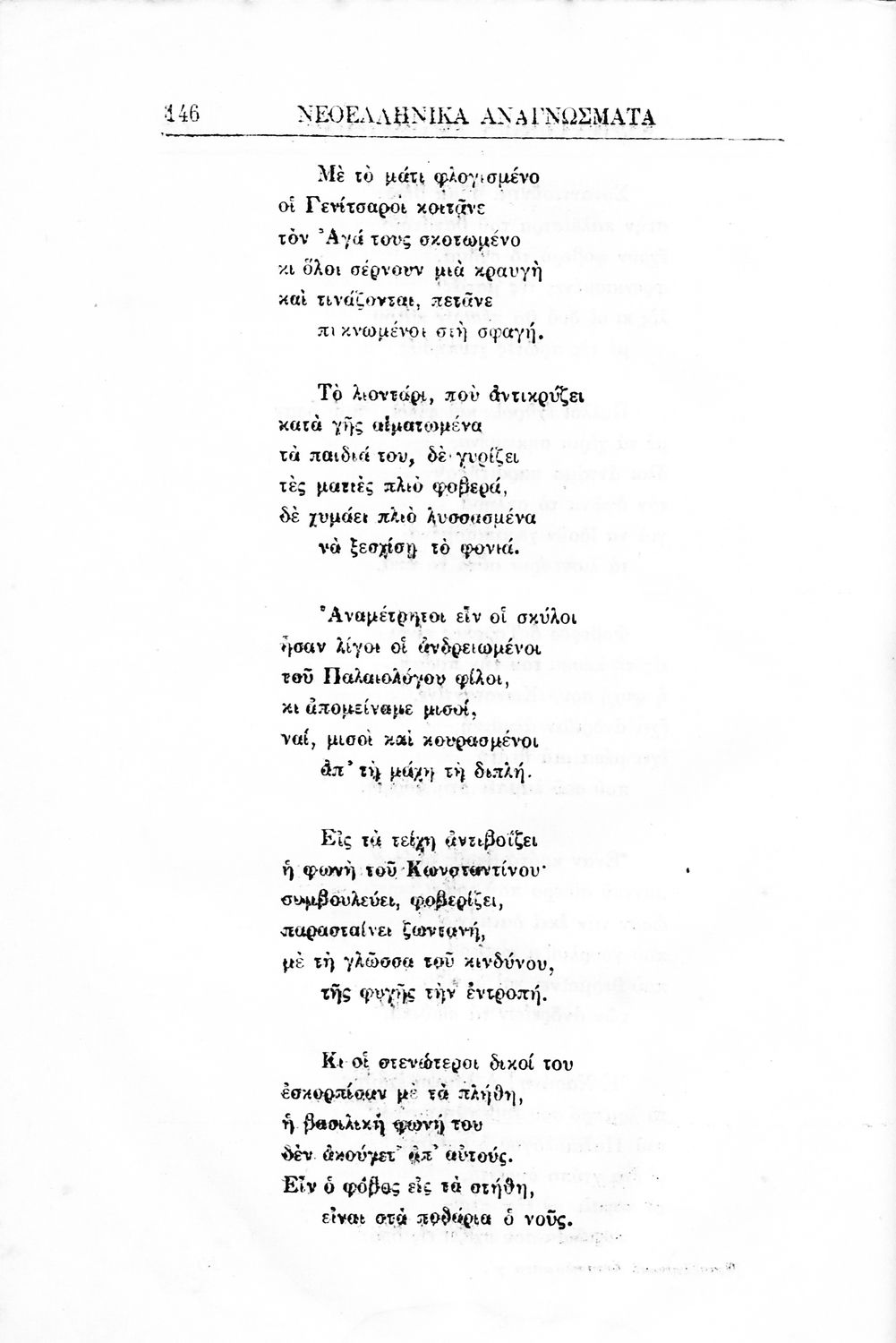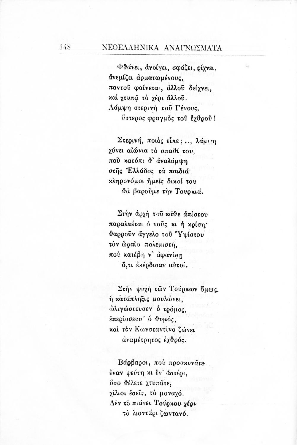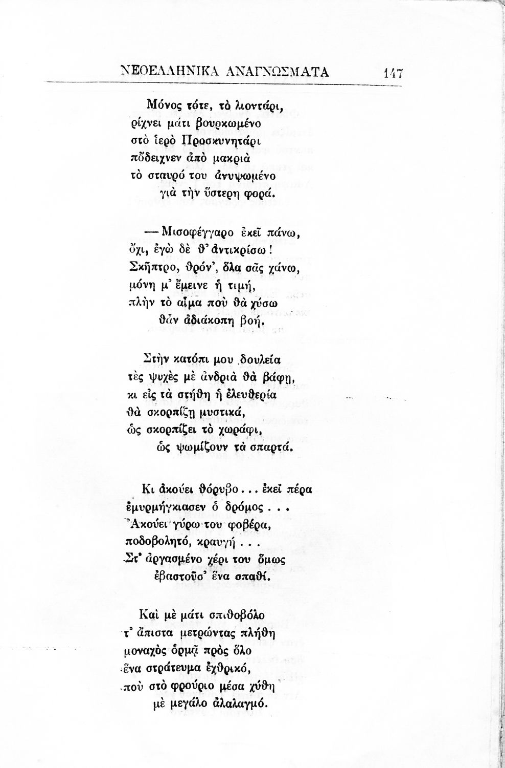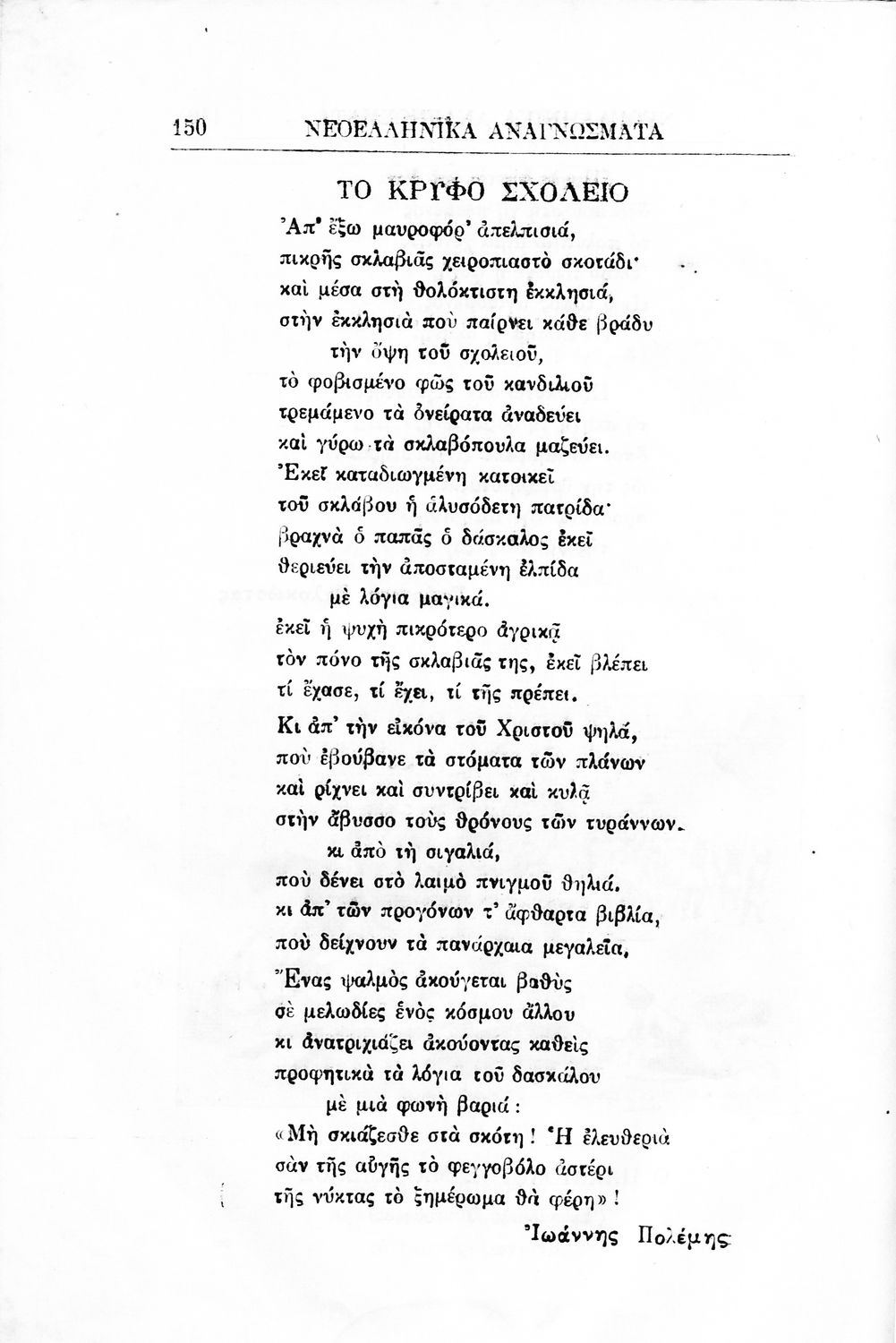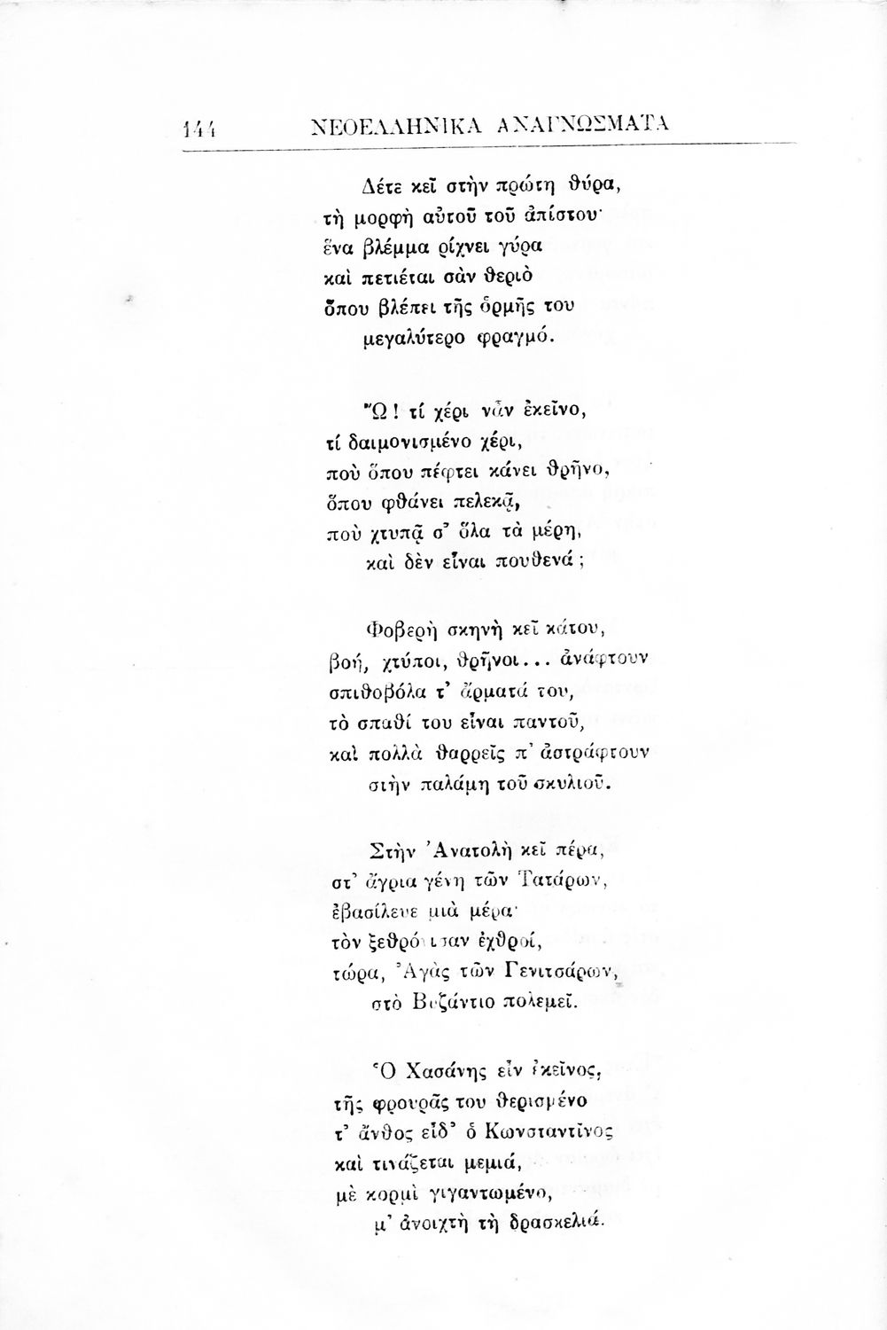 Βαθμίδα εκπαίδευσης: Δευτεροβάθμια Τάξη: Γ' Ελληνικού Σχολείου / Α' Αστικού Σχολείου Μάθημα: Νέα Ελληνικά Γλώσσα: Καθαρεύουσα / Δημοτική Παρουσίαση περιεχομένου: Σχολικό εγχειρίδιο Νέων Ελληνικών Γ' Ελληνικού και Α' Αστικού Σχολείου που περιλαμβάνει κείμενα Ελλήνων συγγραφέων εμπνευσμένα από την σύγχρονη ελληνική ιστορία, τη βυζαντινή ιστορία, την ελληνική φύση και τη ζωή στην ύπαιθρο, και τη θρησκευτική παράδοση. Περιέχει παράρτημα με τη βιογραφία των συγγραφέων και λεξιλόγιο. |