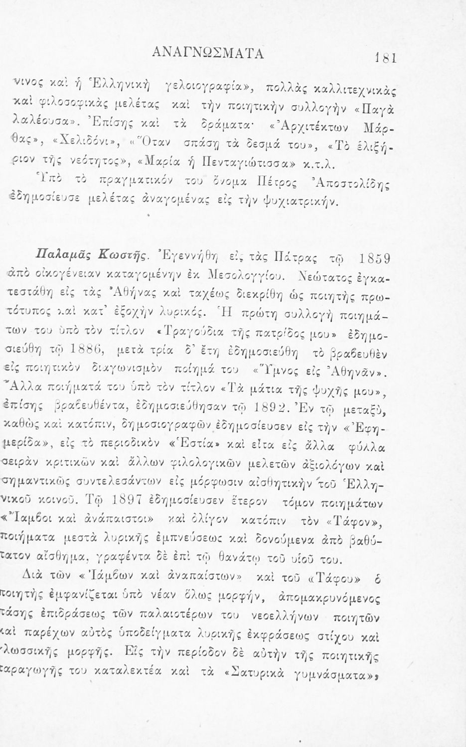 LDR 01507 2200217 4500 035 ## _a01-46080 040 ## _aΙνστιτούτο Εκπαιδευτικής Πολιτικής 041 ## _ael 100 ## _aΘεοδόσιος Κ. Σπεράντσας (επιμ.) 110 ## _a46080 245 0# _aΝεοελληνικά αναγνώσματα δια τους μαθητάς της Δευτέρας τάξεως του Γυμνασίου 250 ## _a1η Έκδοση 260 ## _aΑθήνα _bΕκδοτικόν Γραφείο _c1917 300 ## _a171 _bΦωτογραφίες (ασπρόμαυρες) _c20 520 ## _aΣχολικό εγχειρίδιο Νέων Ελληνικών Β' Γυμνασίου που περιλαμβάνει κείμενα Ελλήνων συγγραφέων και δημοτικά τραγούδια με θέματα από την ελληνική φύση, την καθημερινή ζωή των ανθρώπων, τη θρησκευτική παράδοση και την σύγχρονη ελληνική ιστορία. Περιέχει και παράρτημα με βιογραφίες των συγγραφέων και λεξιλόγιο. 521 ## _aΒ' Γυμνασίου 522 ## _aΕλλάδα 546 ## _aΚαθαρεύουσα / Δημοτική 563 ## _aΣκληρό Εξώφυλλο 583 ## _a33571/17-10-1917 _c1917 650 #4 _aΔροσίνης _aΚορνάρος _aΠαλαμάς _aΠαπαρρηγόπουλος _aΠολέμης _aΣολωμός