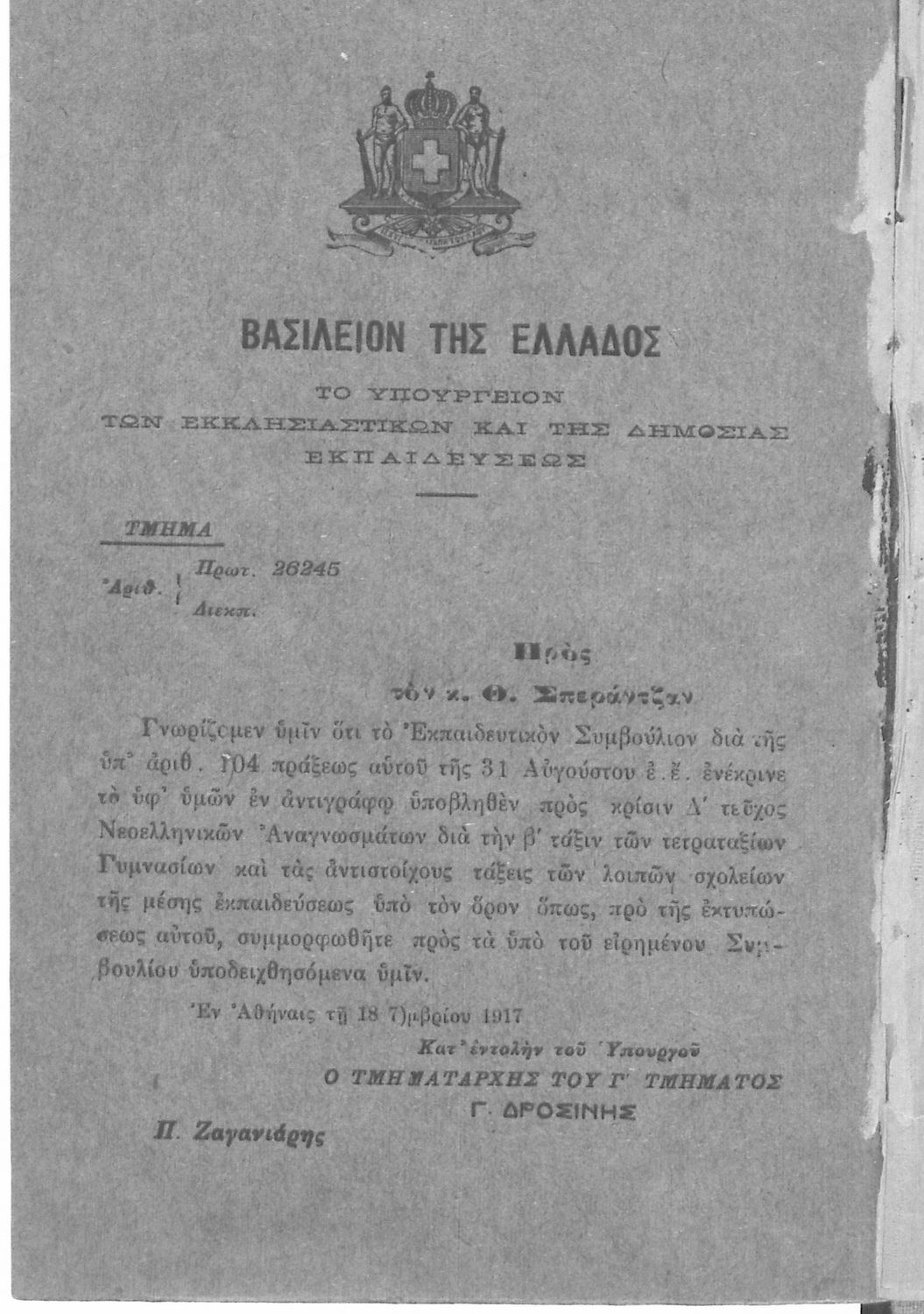Τίτλος: Νεοελληνικά αναγνώσματα δια τους μαθητάς της Δευτέρας τάξεως του Γυμνασίου