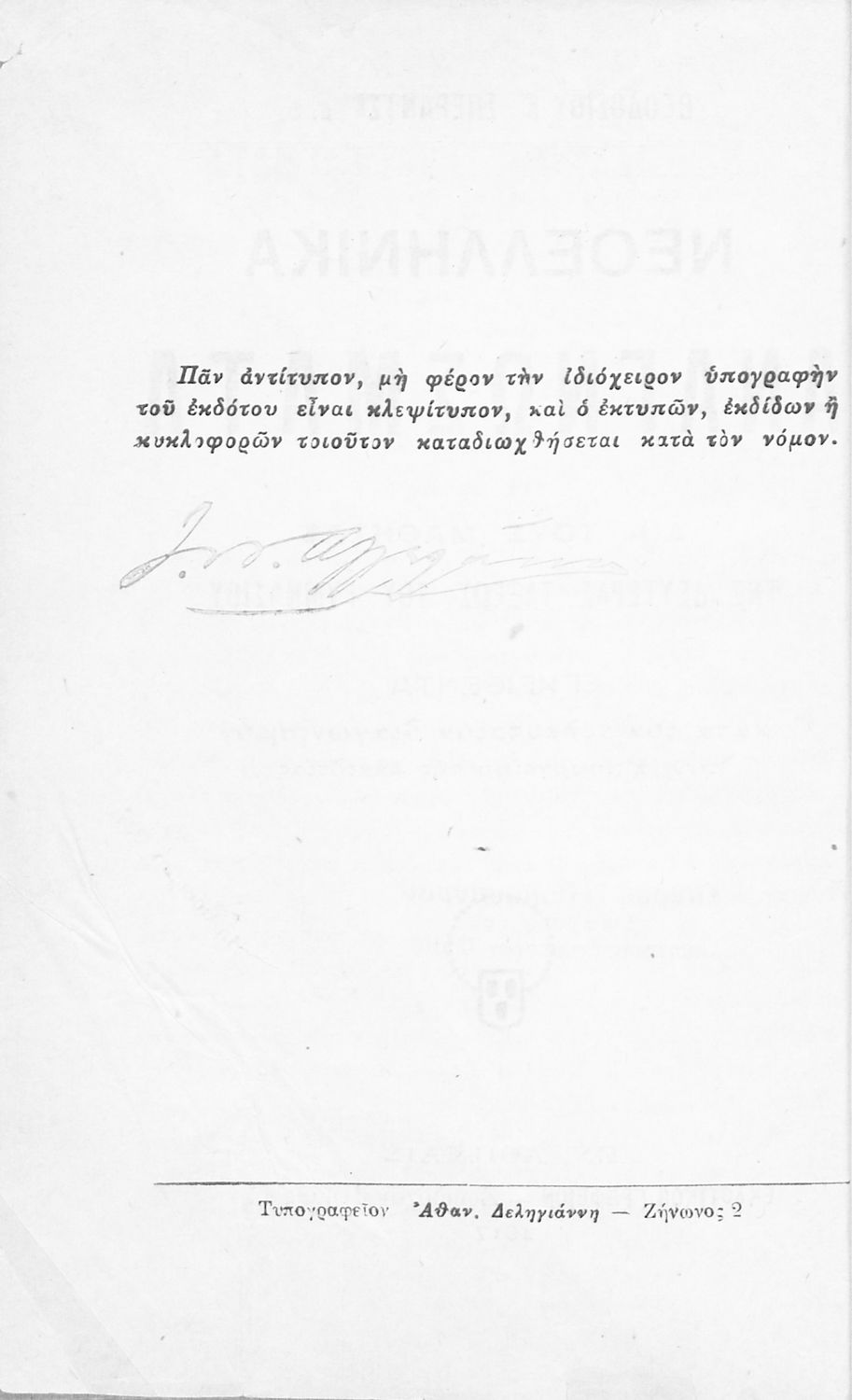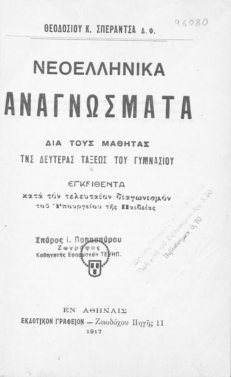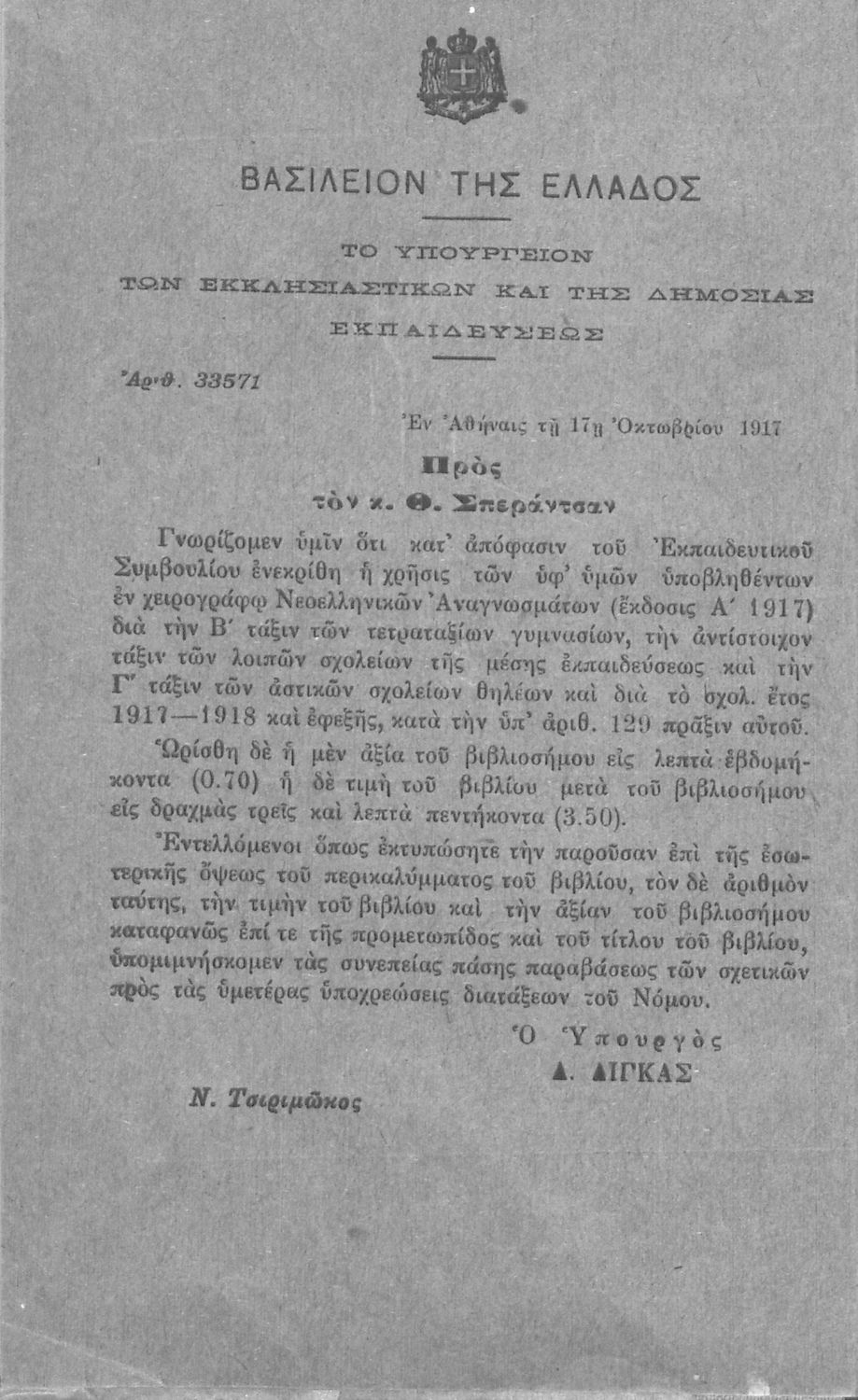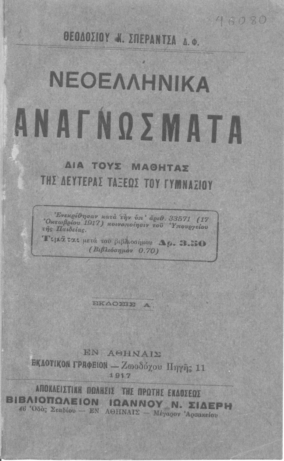 Εκδότης: Εκδοτικόν Γραφείο Έτος έκδοσης: 1917 Τόπος έκδοσης: Αθήνα Έκδοση: 1η Υπουργική απόφαση / Σύμβαση: 33571/17-10-1917 Έτος έγκρισης: 1917 |