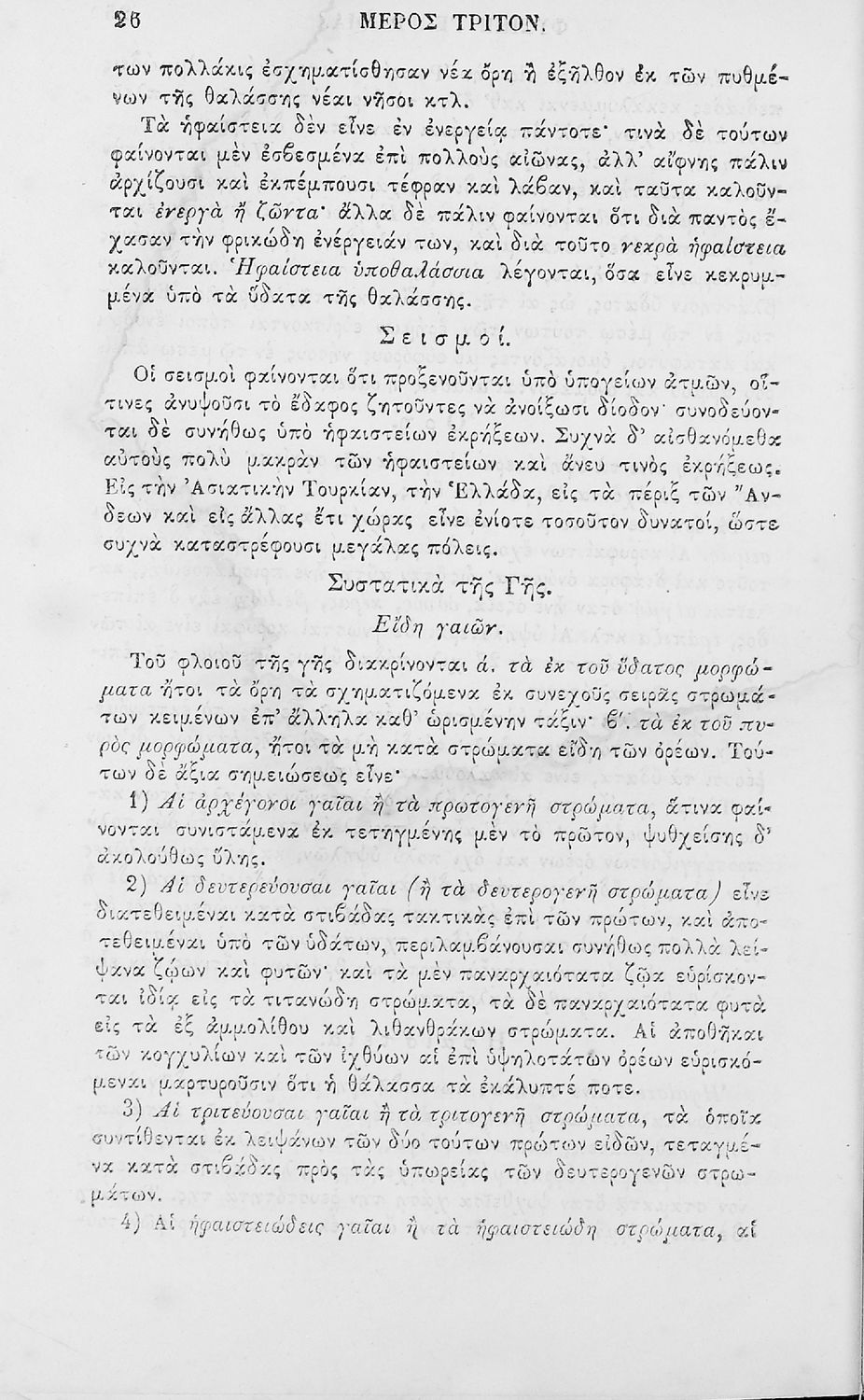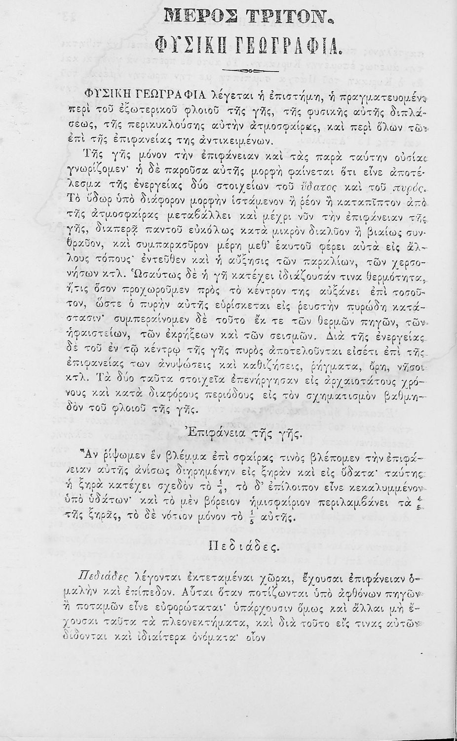 Σχολικό εγχειρίδιο Γεωγραφίας για τη Δευτεροβάθμια Εκπαίδευση. Παρουσιάζει στοιχεία πολιτικής και φυσικής γεωγραφίας των ηπείρων. Στην εισαγωγή περιέχονται προκαταρτικές και γενικές γνώσεις ενώ στο δεύτερο μέρος έχει στοιχεία Μαθηματικής Γεωγραφίας. Ο συγγραφέας ήταν διδάκτορας φιλοσοφίας και καθηγητής.