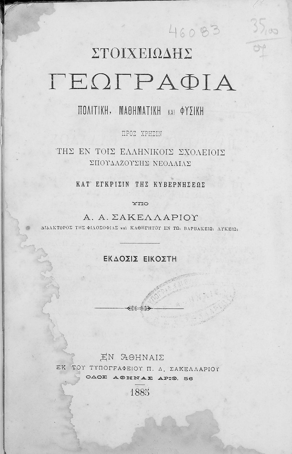 Τίτλος: Στοιχειώδης Γεωγραφία Πολιτική, Μαθηματική και Φυσική προς χρήσιν της εν τοις Ελληνικοίς σχολείοις σπουδάζουσης νεολαίας