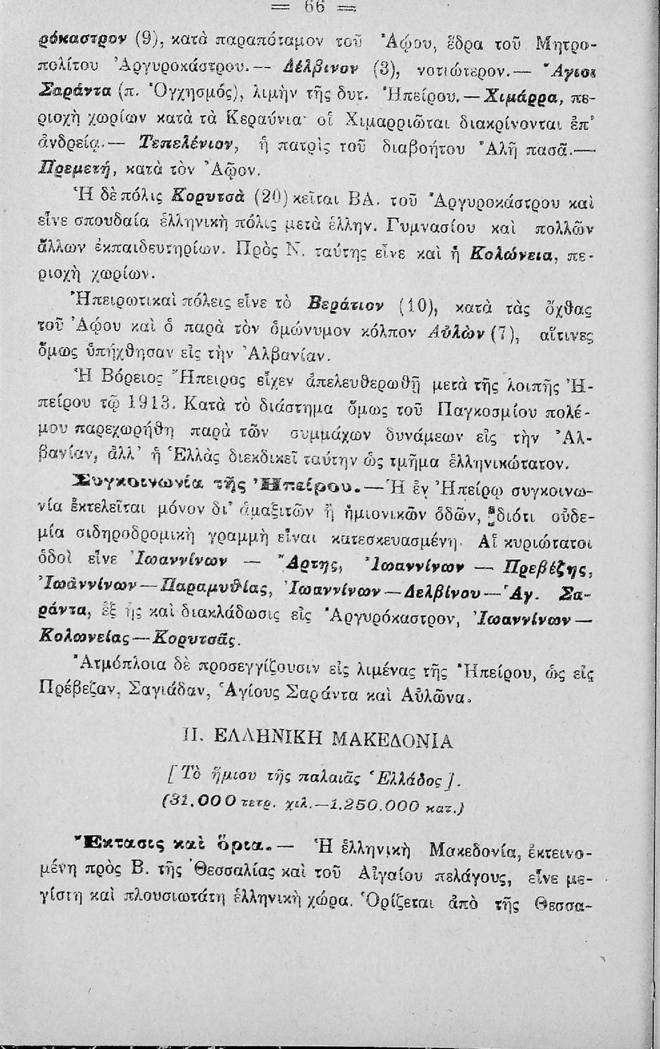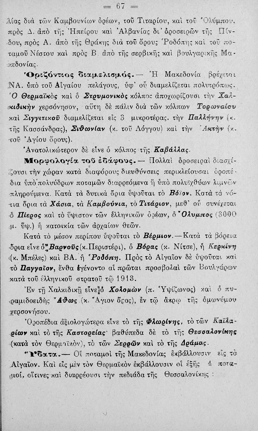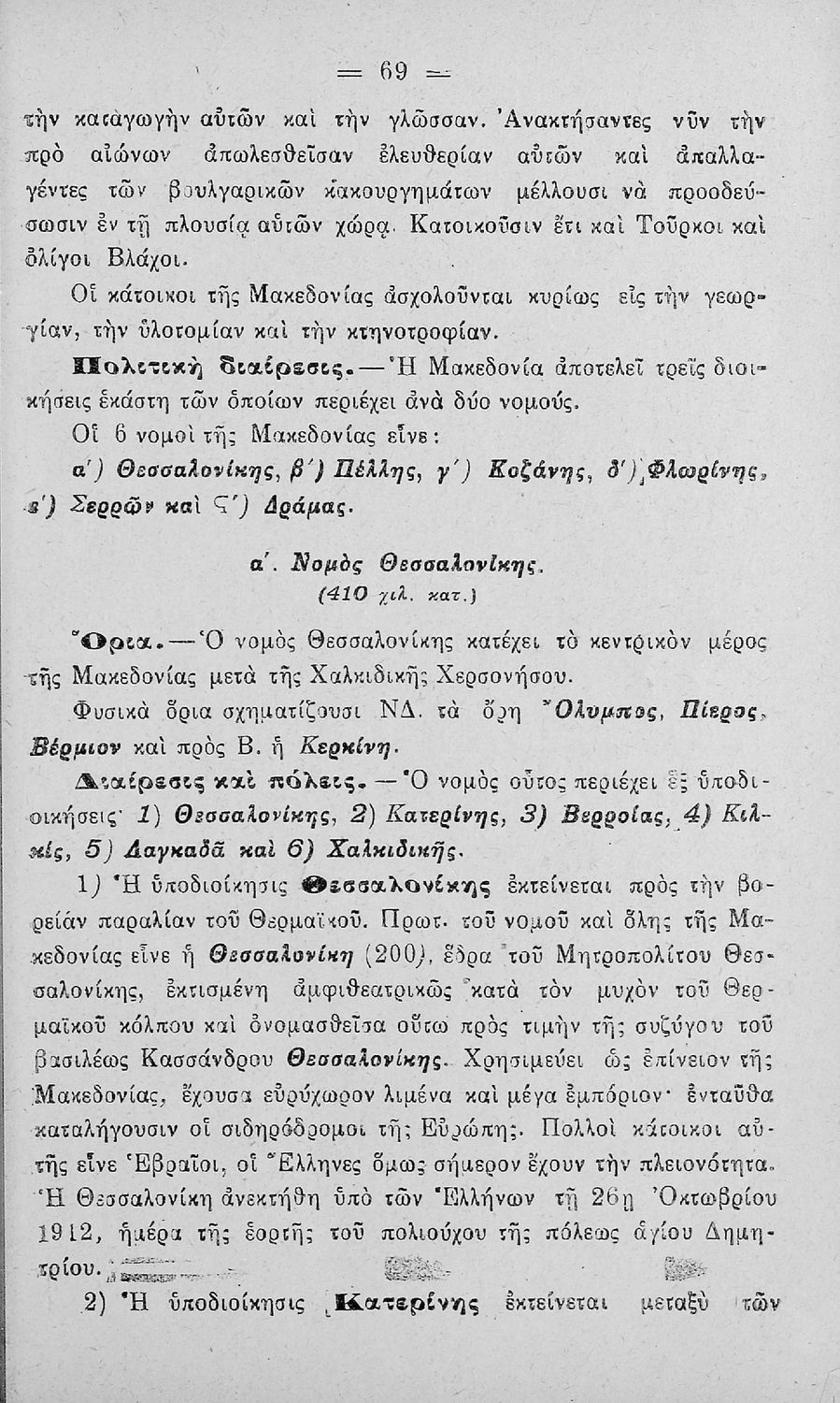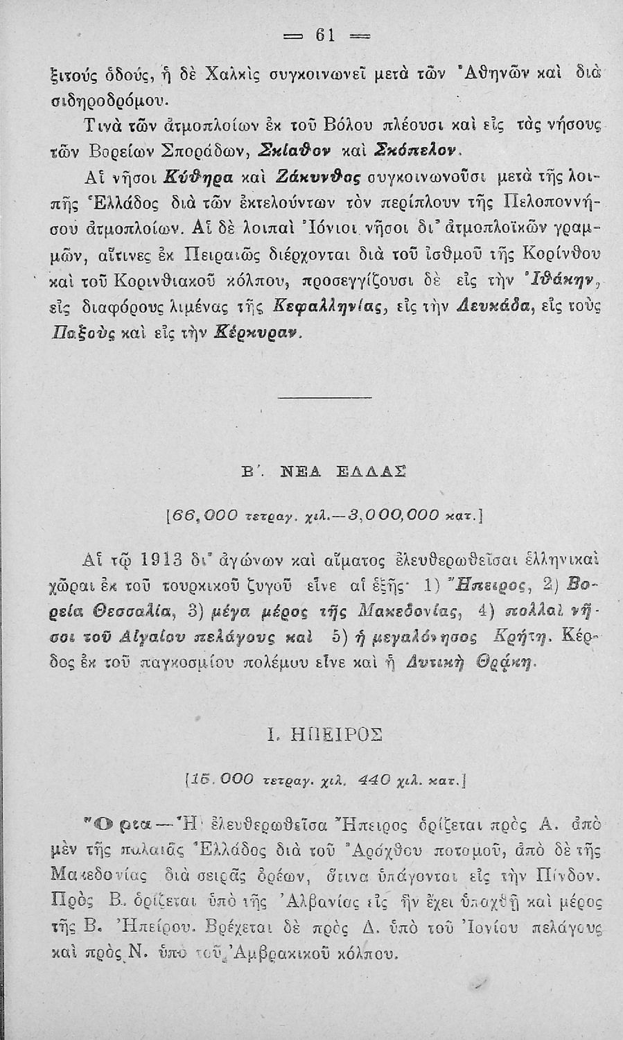 Σχολικό εγχειρίδιο Γεωγραφίας Γ΄ Ελληνικού Σχολείου που αποτελεί μια γενική επισκόπηση της Ελλάδας ανά διαμέρισμα και νομό. Περιέχει και ειδικό κεφάλαιο για τις "λοιπές ελληνικές χώρες" στις οποίες περιλαμβάνονται τα Δωδεκάνησα, η Τουρκική Θράκη, η Ανατολική Ρωμυλία, η Σερβική και Βουλγαρική Μακεδονία, η Μικρά Ασία, η Συρία, η Παλαιστίνη, και η Κύπρος.