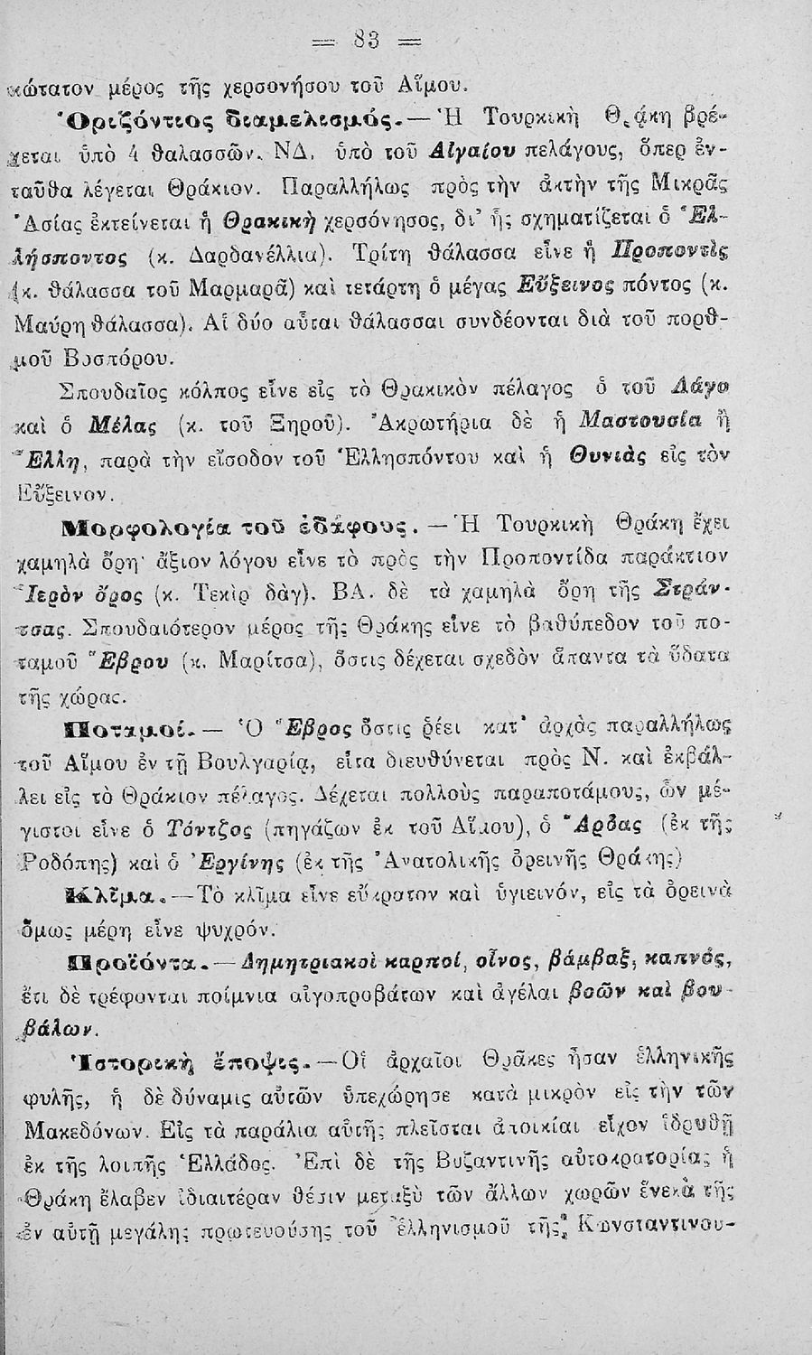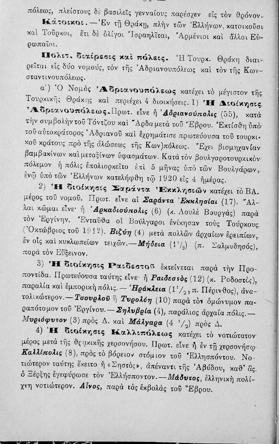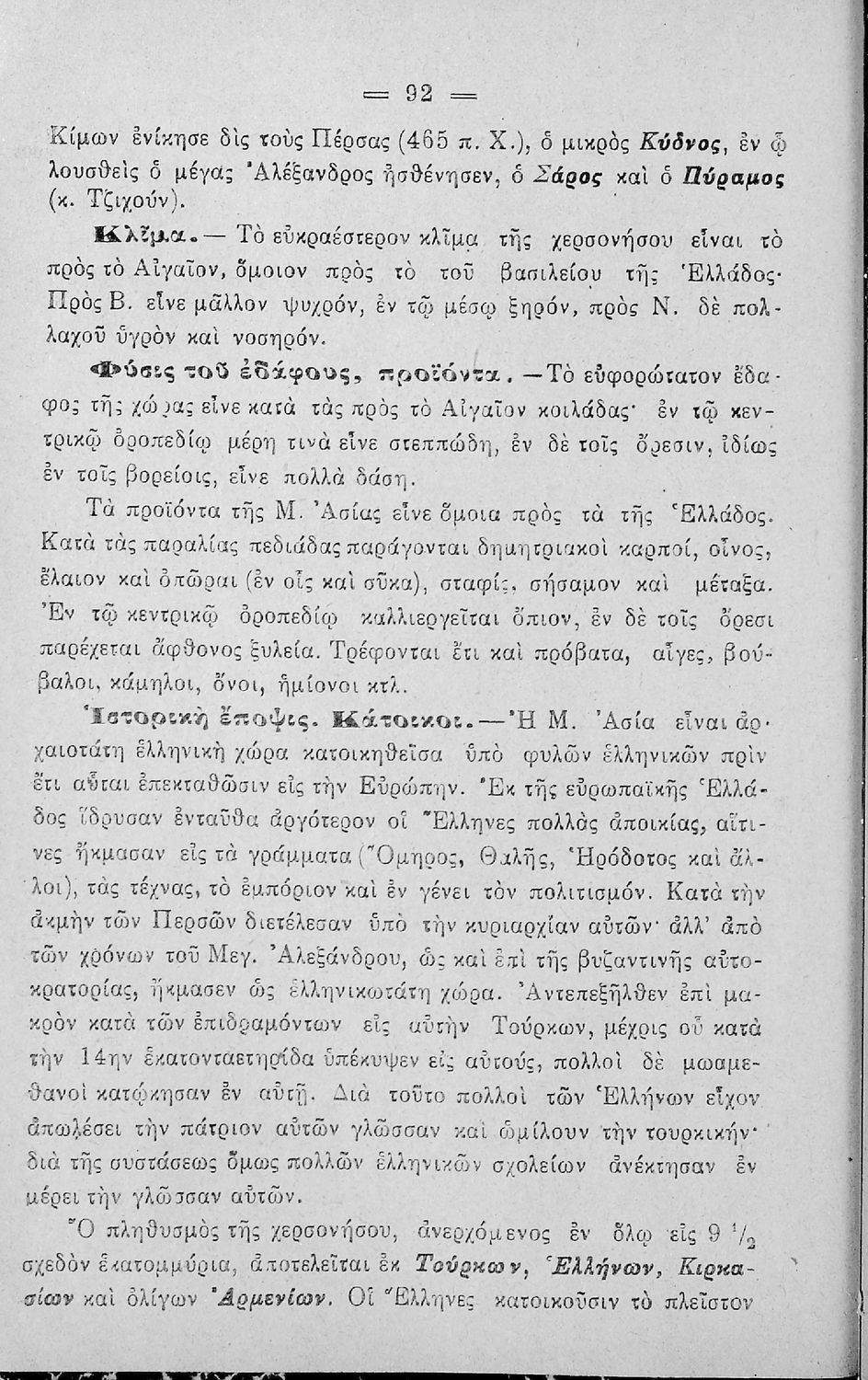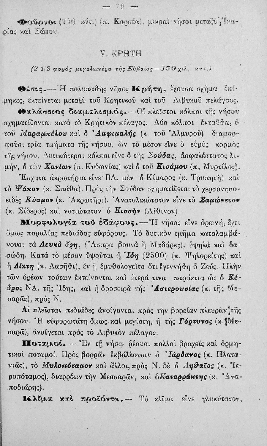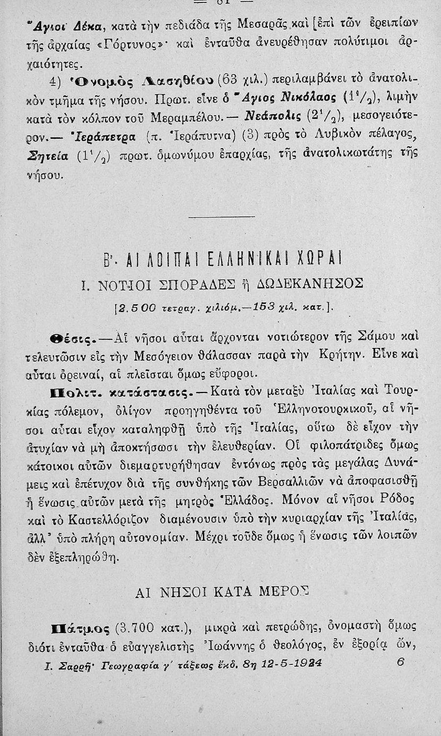 Σχολικό εγχειρίδιο Γεωγραφίας Γ΄ Ελληνικού Σχολείου που αποτελεί μια γενική επισκόπηση της Ελλάδας ανά διαμέρισμα και νομό. Περιέχει και ειδικό κεφάλαιο για τις "λοιπές ελληνικές χώρες" στις οποίες περιλαμβάνονται τα Δωδεκάνησα, η Τουρκική Θράκη, η Ανατολική Ρωμυλία, η Σερβική και Βουλγαρική Μακεδονία, η Μικρά Ασία, η Συρία, η Παλαιστίνη, και η Κύπρος.