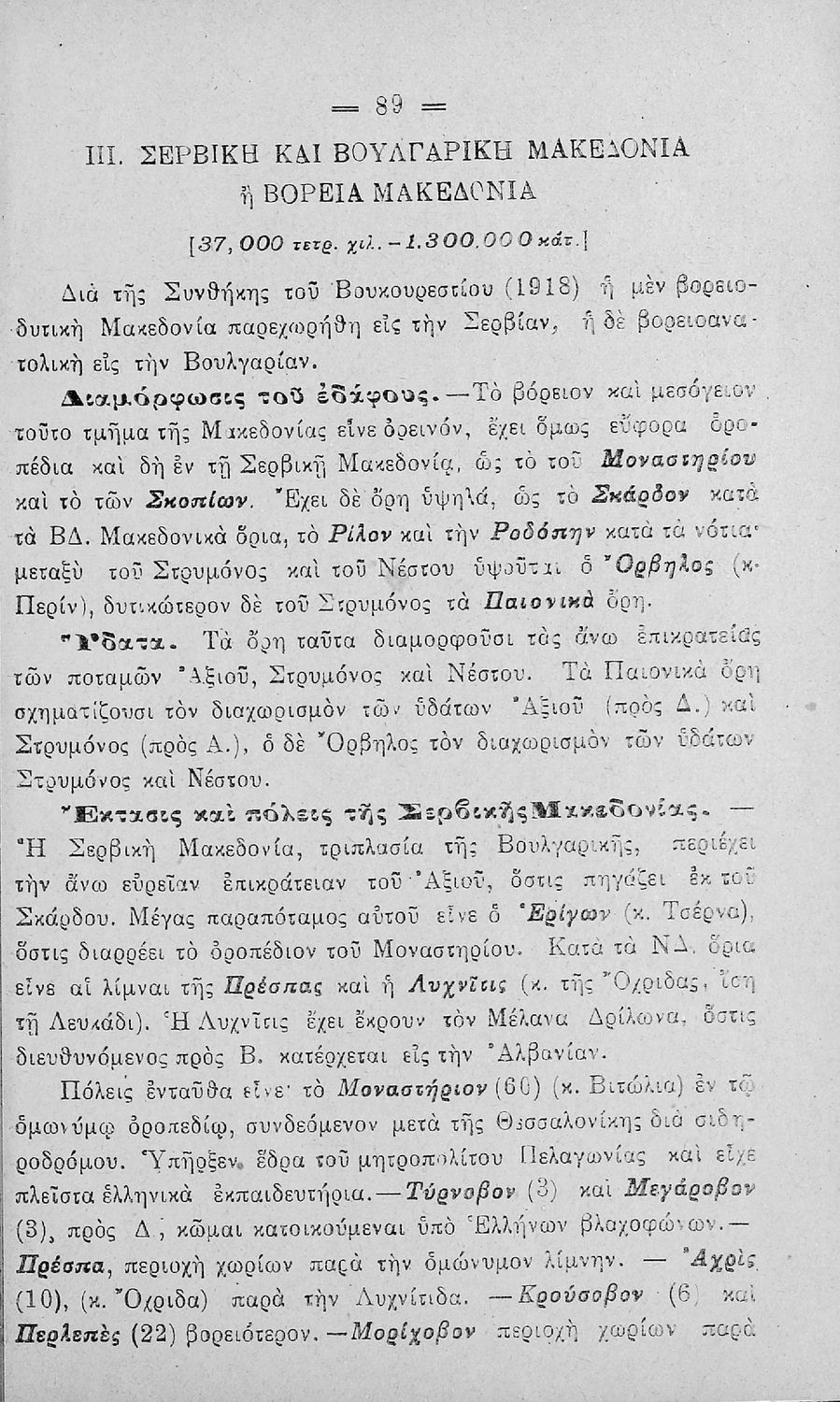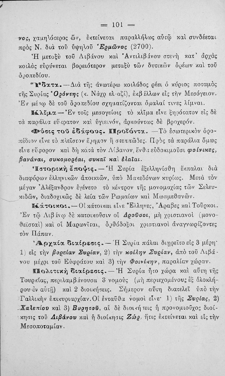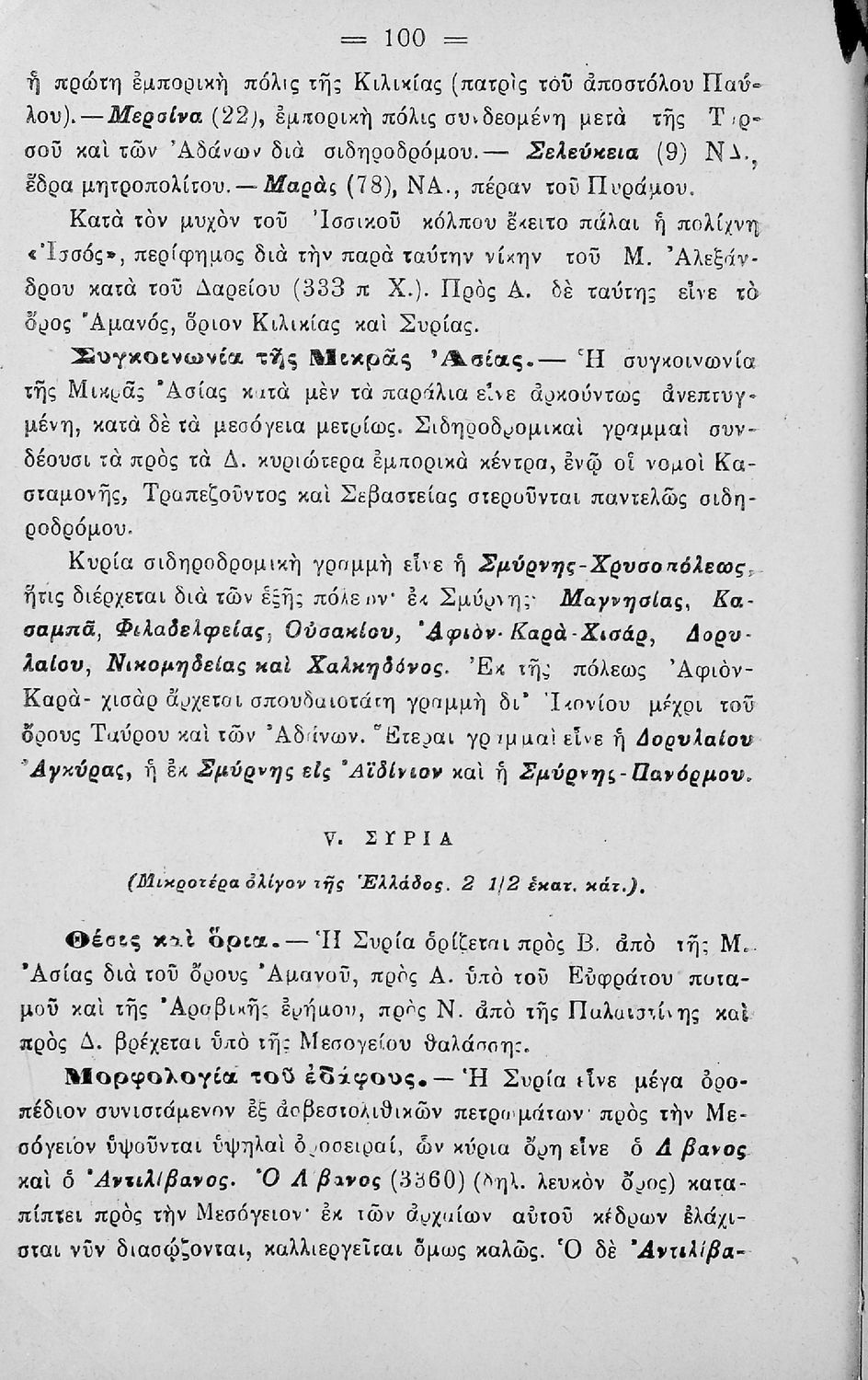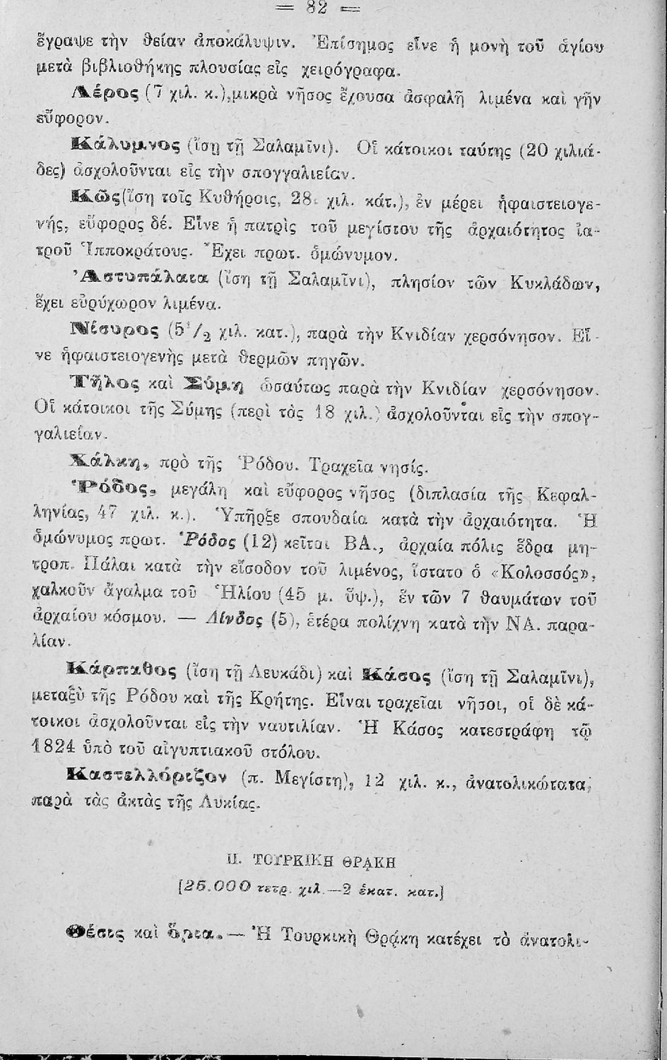 Σχολικό εγχειρίδιο Γεωγραφίας Γ΄ Ελληνικού Σχολείου που αποτελεί μια γενική επισκόπηση της Ελλάδας ανά διαμέρισμα και νομό. Περιέχει και ειδικό κεφάλαιο για τις "λοιπές ελληνικές χώρες" στις οποίες περιλαμβάνονται τα Δωδεκάνησα, η Τουρκική Θράκη, η Ανατολική Ρωμυλία, η Σερβική και Βουλγαρική Μακεδονία, η Μικρά Ασία, η Συρία, η Παλαιστίνη, και η Κύπρος.