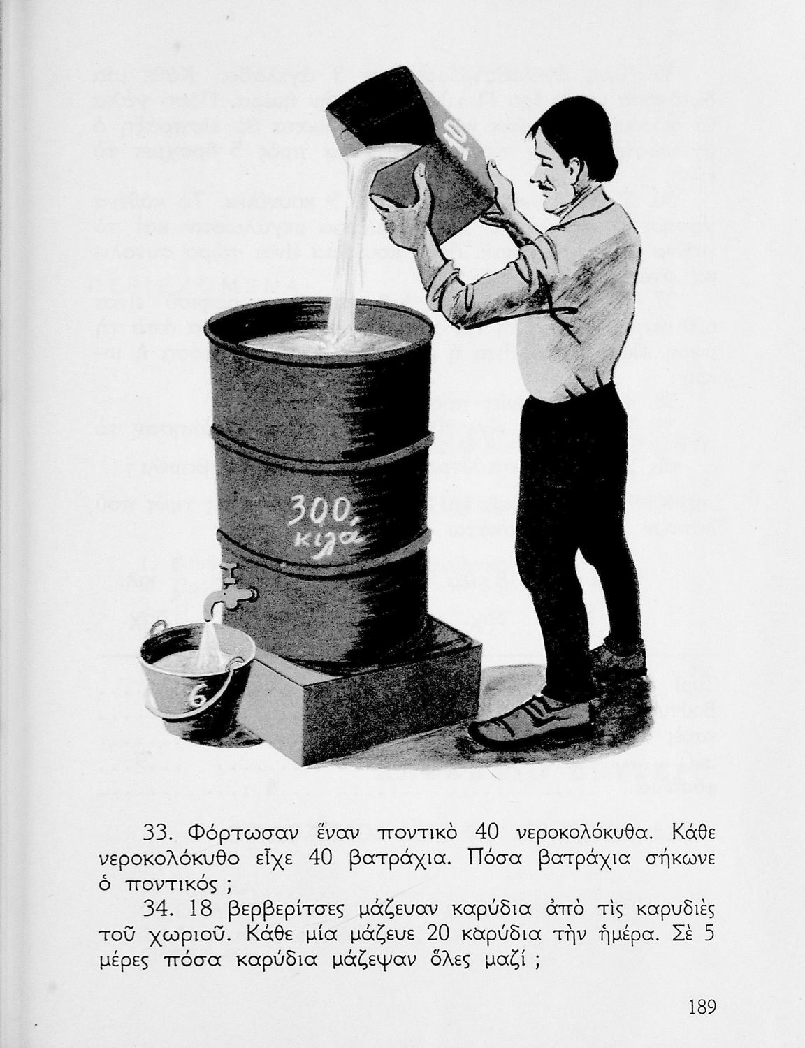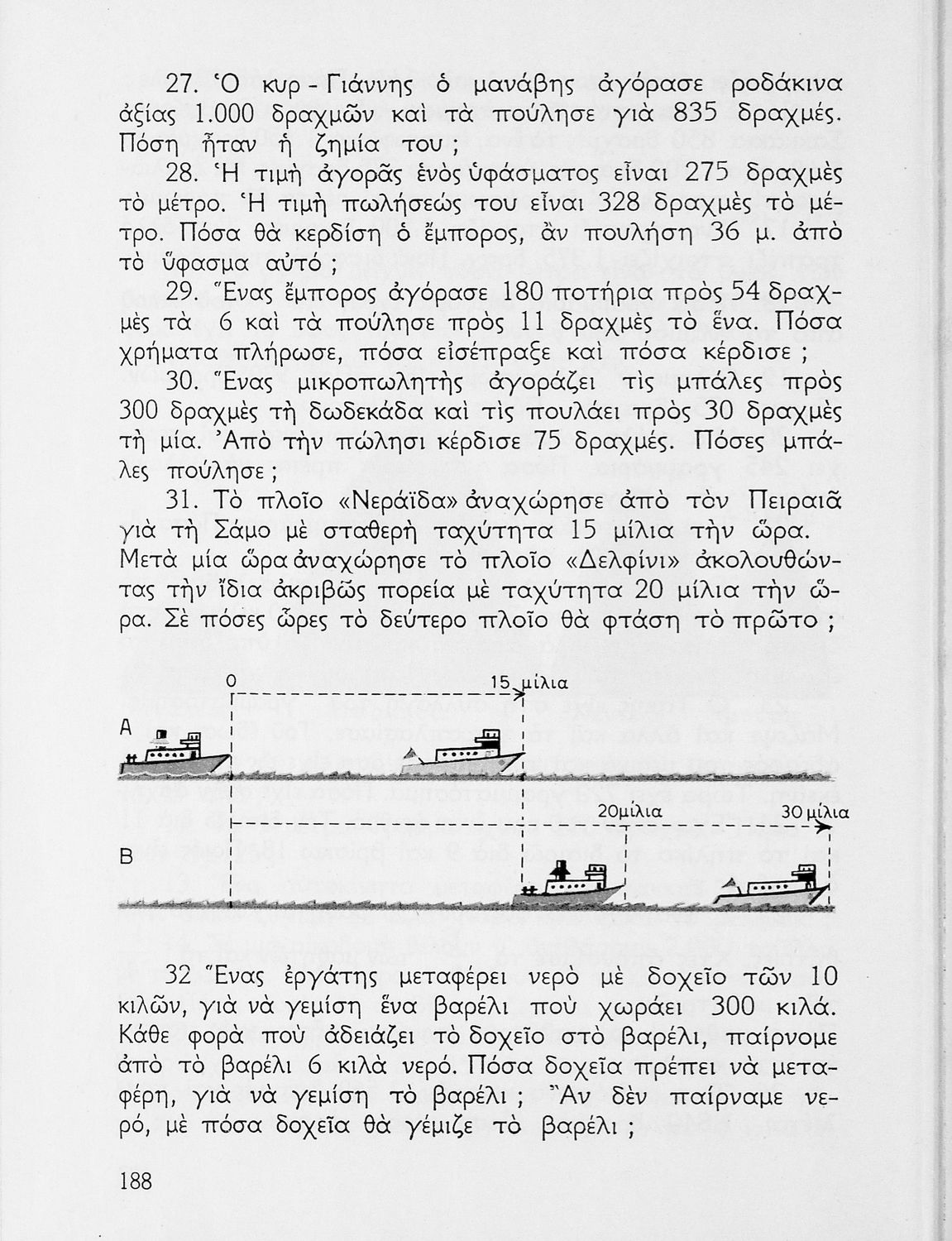 Σχολικό εγχειρίδιο Μαθηματικών ΣΤ΄ Δημοτικού που περιλαμβάνει ασκήσεις λογιστικού χαρακτήρα και ασκήσεις μέτρησης γεωμετρικών σχημάτων. Φέρει το σύμβολο της δικτατορίας.
