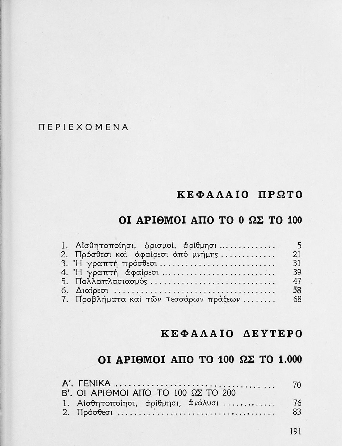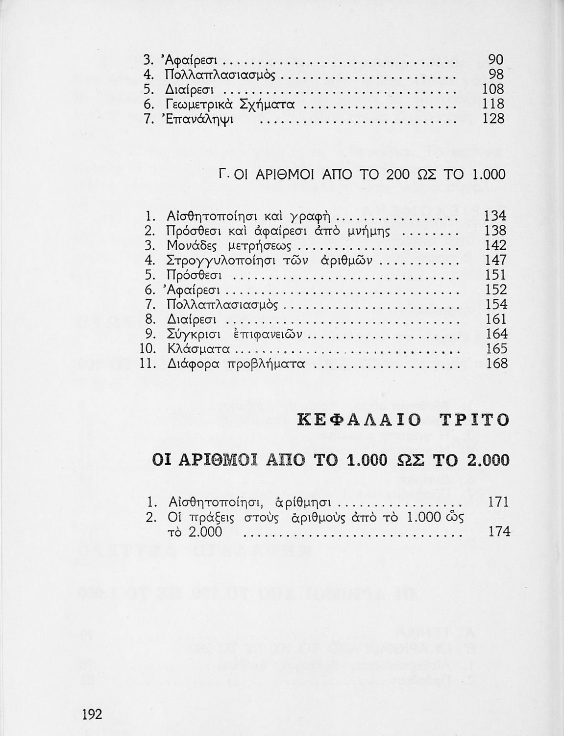 Σχολικό εγχειρίδιο Αριθμητικής για την Γ΄ Δημοτικού που περιλαμβάνει θεωρία, παραδείγματα και ασκήσεις και εστιάζει στις αριθμητικές πράξεις. Περιέχει και 11 σελίδες Γεωμετρίας. Φέρει το σύμβολο της δικτατορίας.