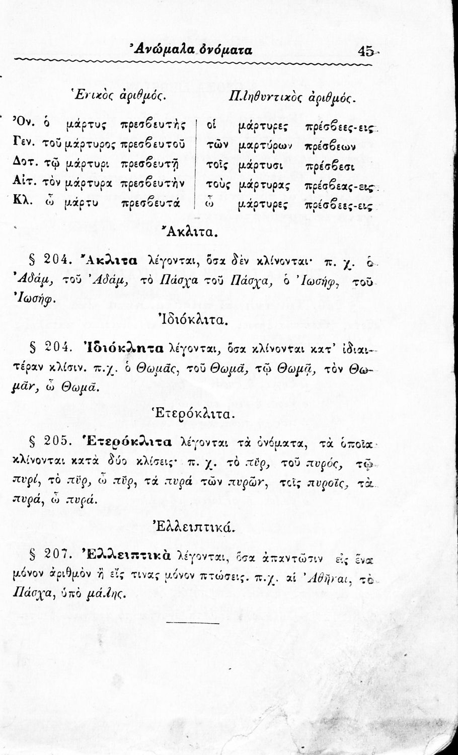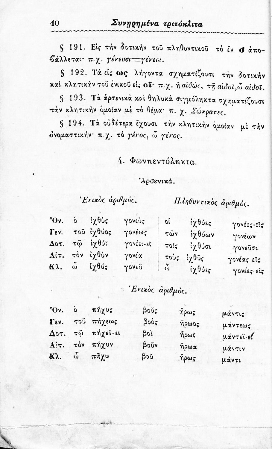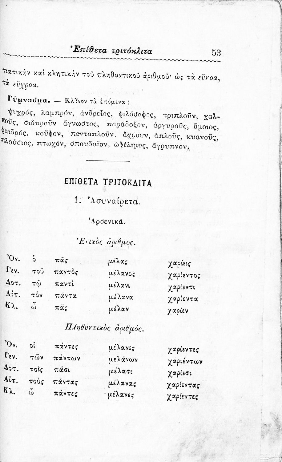 Σχολικό εγχειρίδιο Αρχαίων Ελληνικών Δημοτικού που περιλαμβάνει τους κανόνες γραμματικής και είναι χωρισμένο σε φθογγολογικό, τυπικό και ετυμολογικό μέρος.