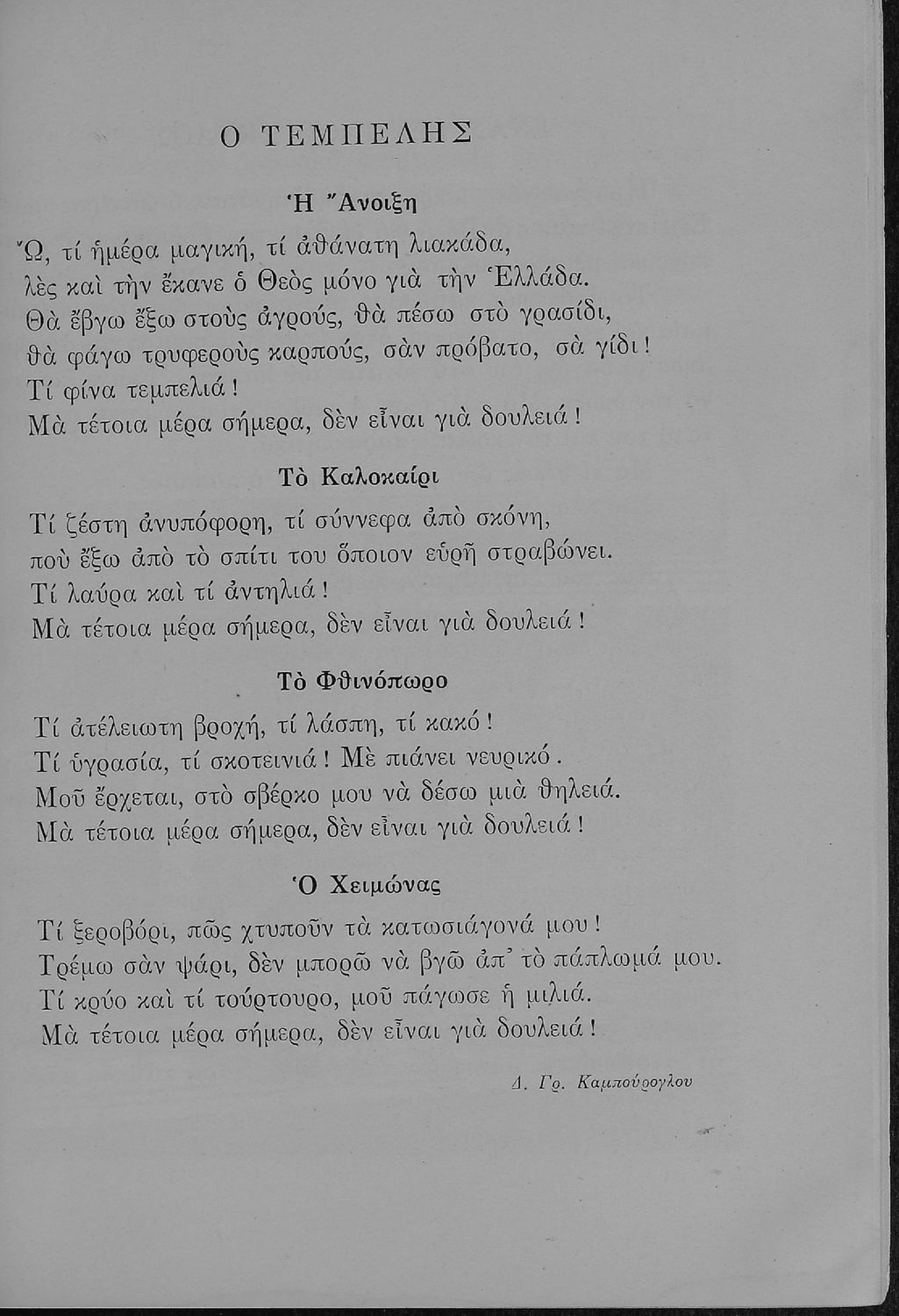 Αναγνωστικό Γ΄ Δημοτικού που περιλαμβάνει ποιήματα και πεζά εμπνευσμένα από την ελληνική φύση, τις ασχολίες των κατοίκων, την σύγχρονη ελληνική ιστορία, την ελληνική μυθολογία και τις θρησκευτικές γιορτές.