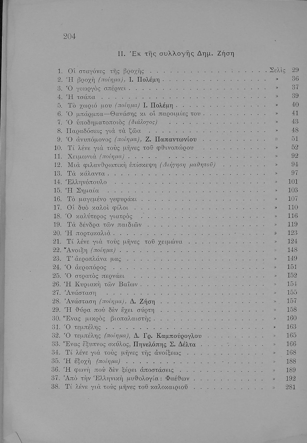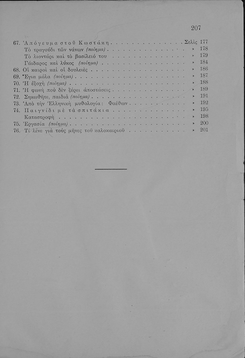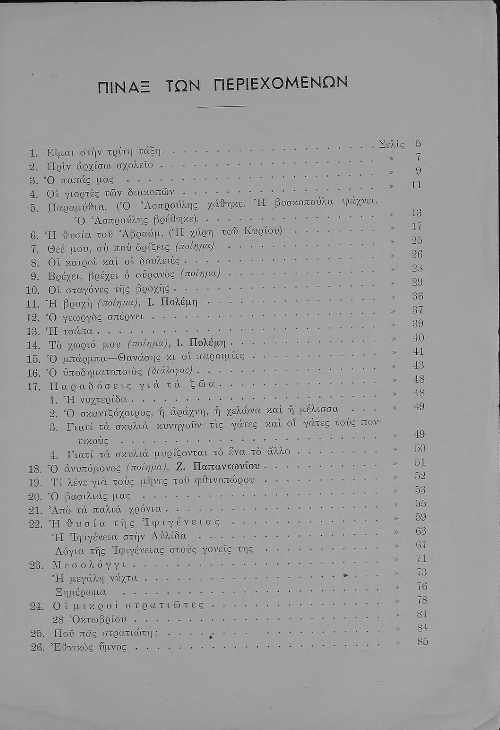 Αναγνωστικό Γ΄ Δημοτικού που περιλαμβάνει ποιήματα και πεζά εμπνευσμένα από την ελληνική φύση, τις ασχολίες των κατοίκων, την σύγχρονη ελληνική ιστορία, την ελληνική μυθολογία και τις θρησκευτικές γιορτές.