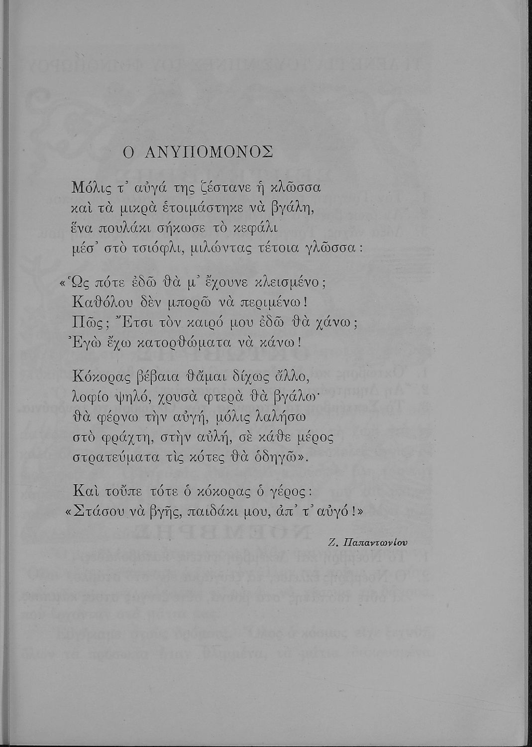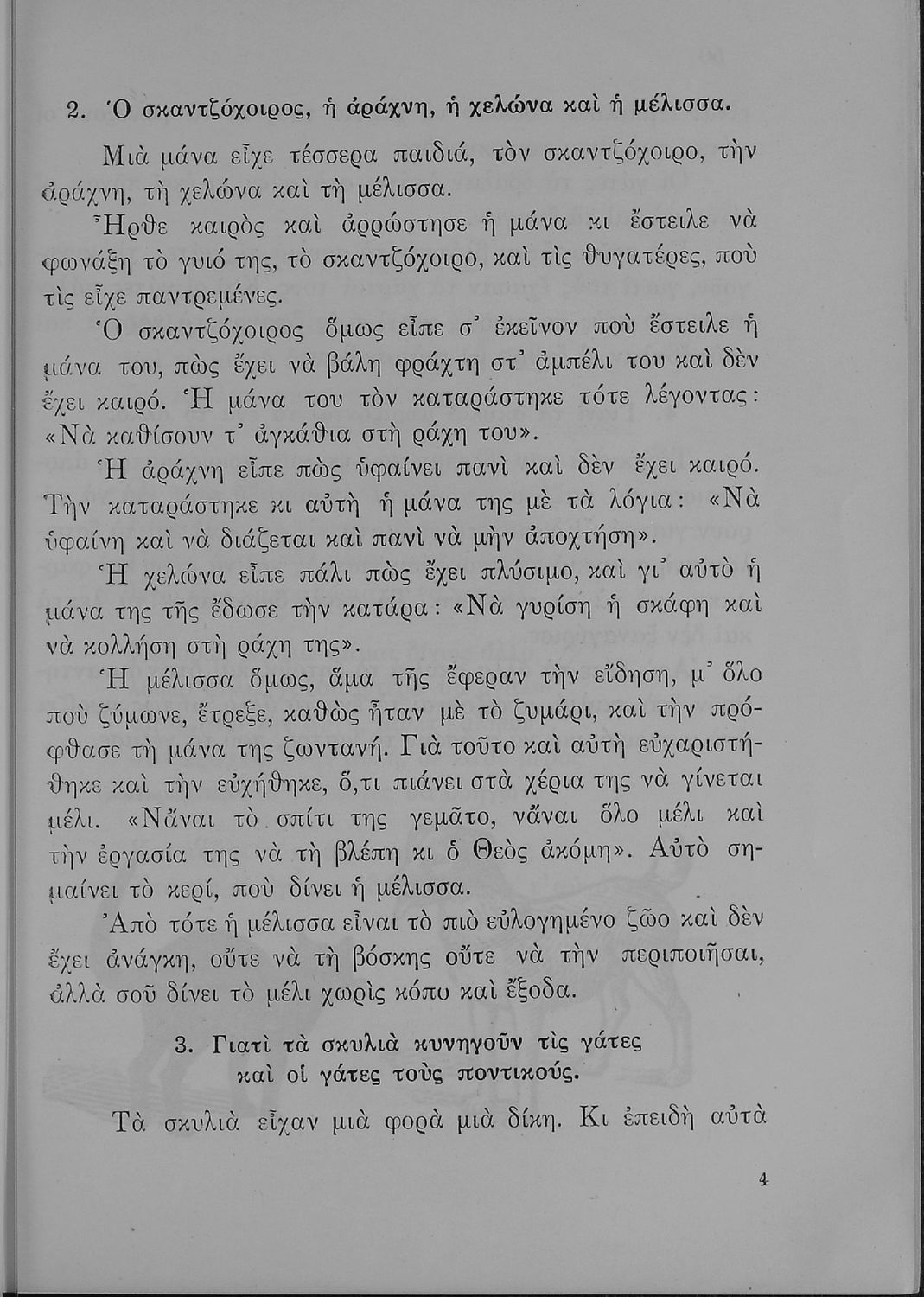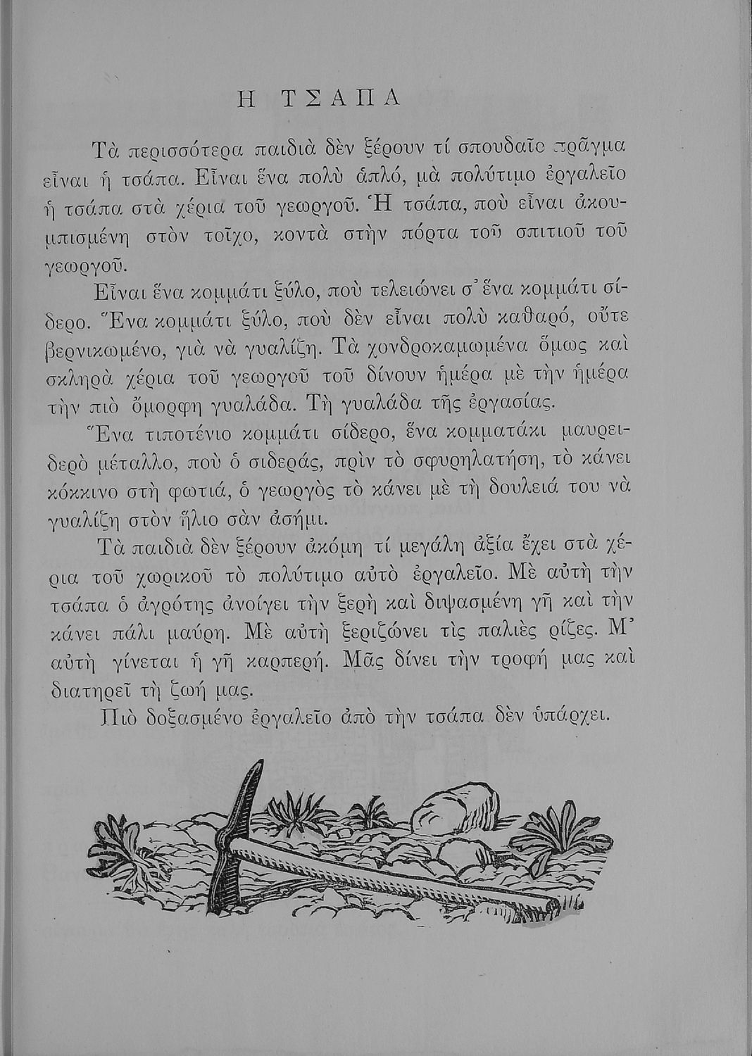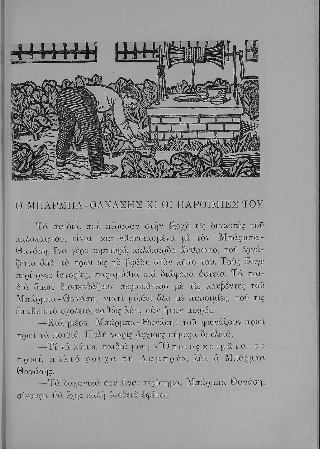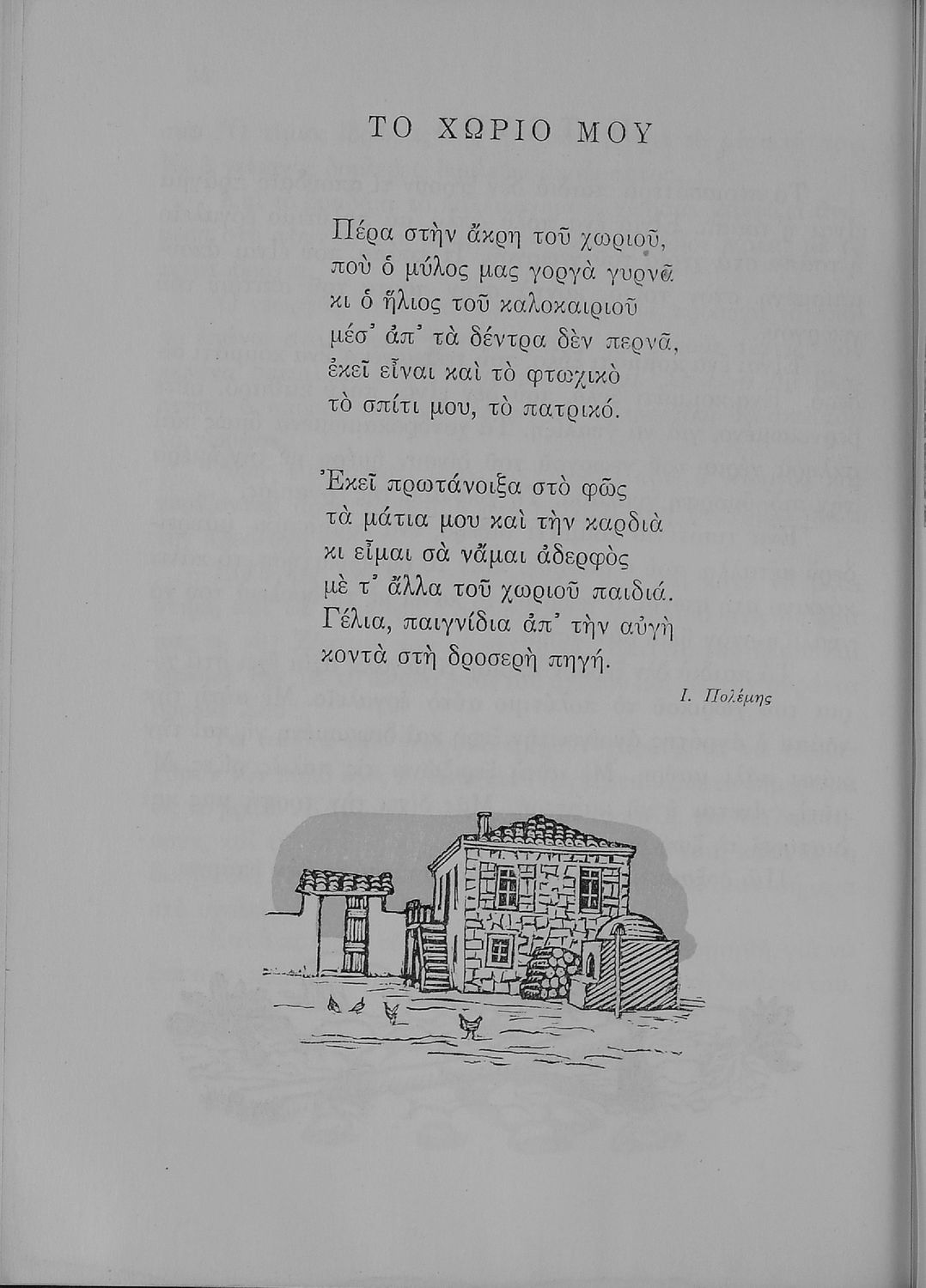 Αναγνωστικό Γ΄ Δημοτικού που περιλαμβάνει ποιήματα και πεζά εμπνευσμένα από την ελληνική φύση, τις ασχολίες των κατοίκων, την σύγχρονη ελληνική ιστορία, την ελληνική μυθολογία και τις θρησκευτικές γιορτές.