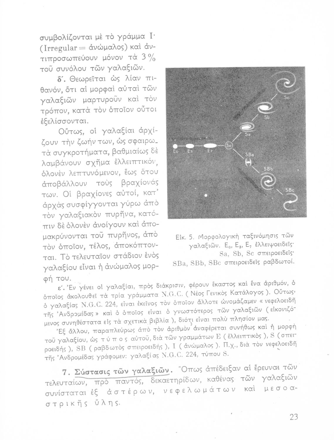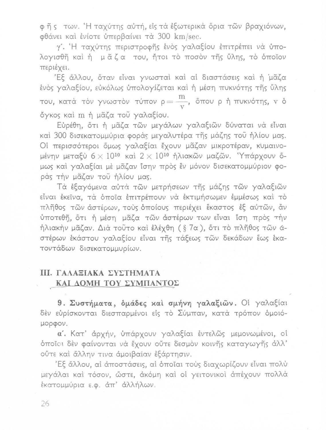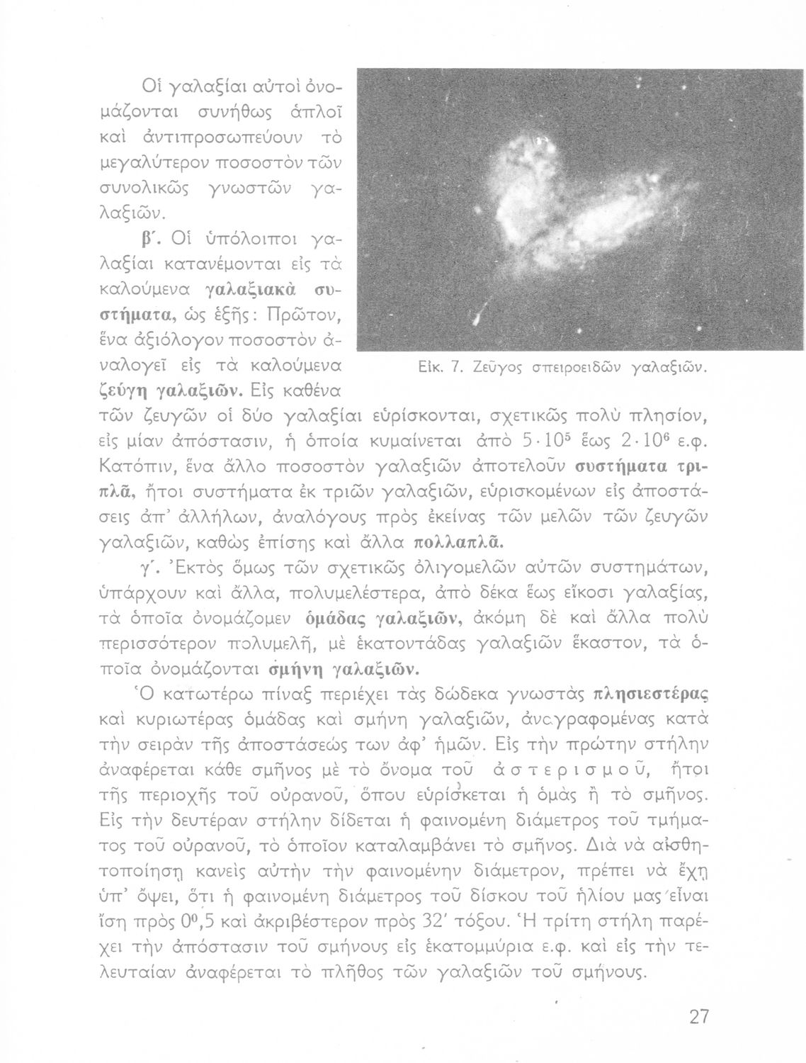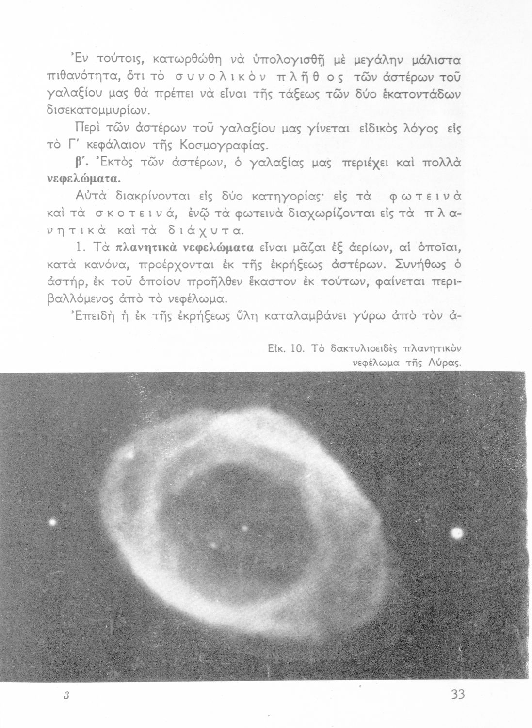 Σχολικό εγχειρίδιο Κοσμογραφίας ΣΤ΄ Γυμνασίου που πραγματεύεται τη μορφή, σύσταση, μέγεθος και κίνηση των γαλαξιών και των πλανητών. Περιέχει στοιχεία αστροναυτικής και πίνακα με 88 αστερισμούς, τα διεθνή ονόματα και τα σύμβολά τους. Φέρει το σύμβολο της δικτατορίας.