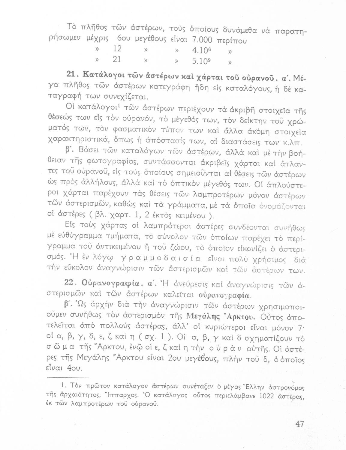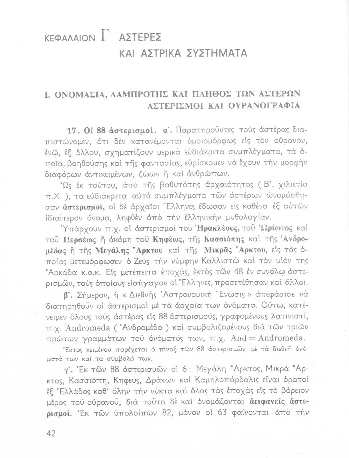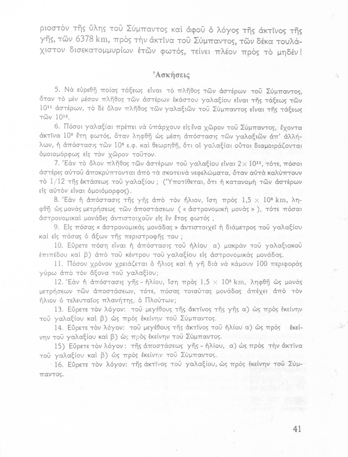 Σχολικό εγχειρίδιο Κοσμογραφίας ΣΤ΄ Γυμνασίου που πραγματεύεται τη μορφή, σύσταση, μέγεθος και κίνηση των γαλαξιών και των πλανητών. Περιέχει στοιχεία αστροναυτικής και πίνακα με 88 αστερισμούς, τα διεθνή ονόματα και τα σύμβολά τους. Φέρει το σύμβολο της δικτατορίας.