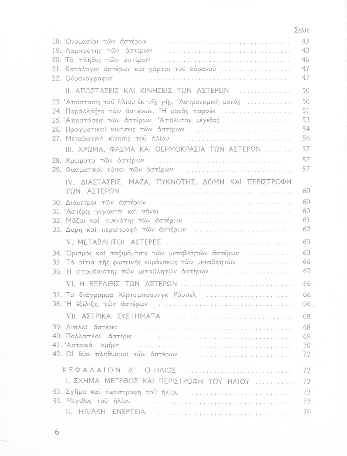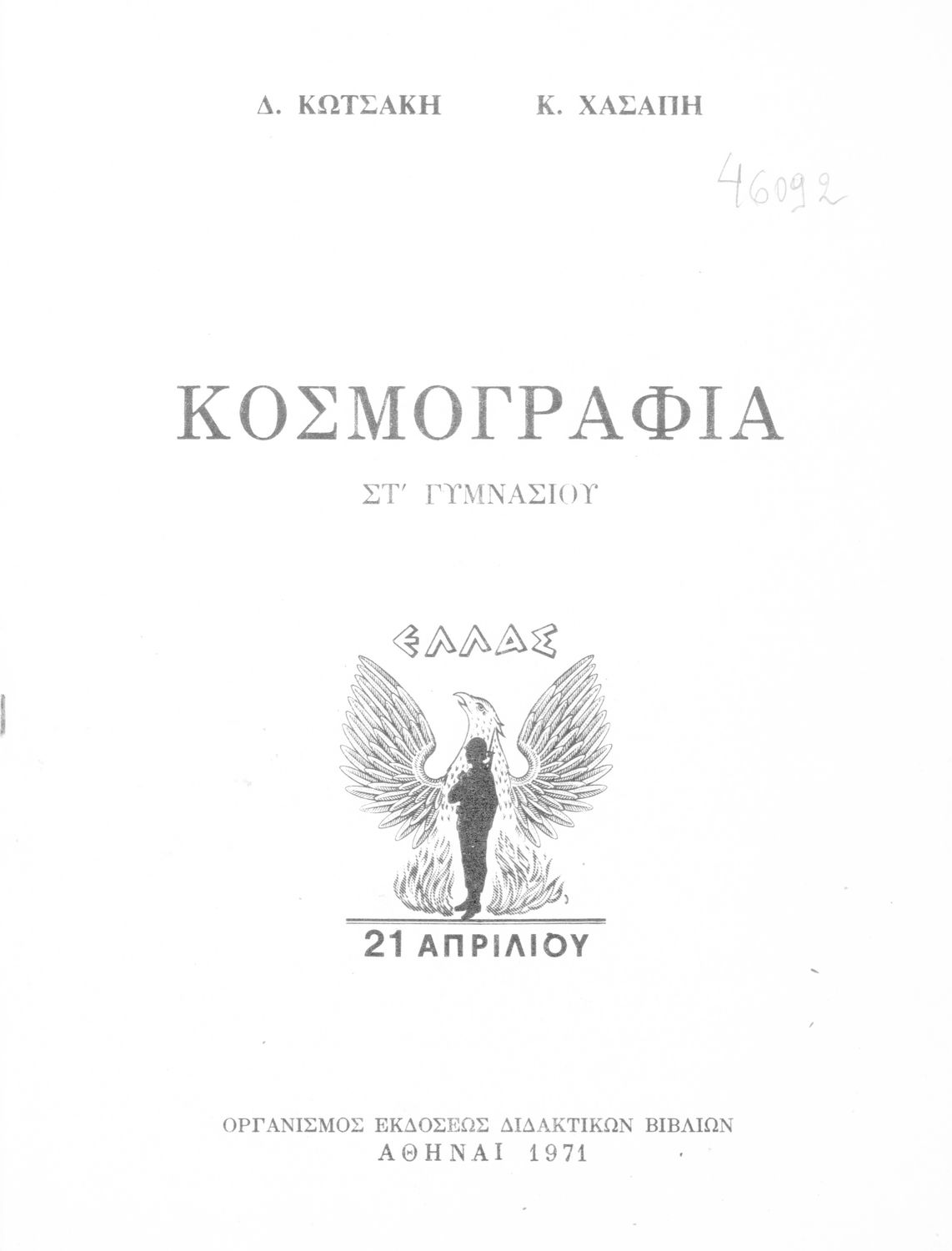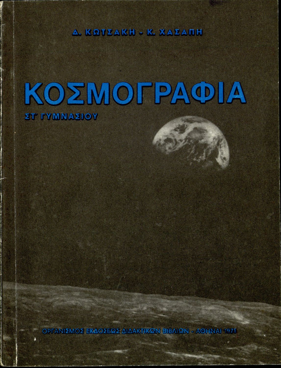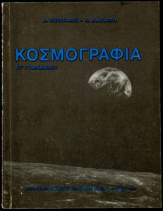 Σχολικό εγχειρίδιο Κοσμογραφίας ΣΤ΄ Γυμνασίου που πραγματεύεται τη μορφή, σύσταση, μέγεθος και κίνηση των γαλαξιών και των πλανητών. Περιέχει στοιχεία αστροναυτικής και πίνακα με 88 αστερισμούς, τα διεθνή ονόματα και τα σύμβολά τους. Φέρει το σύμβολο της δικτατορίας.