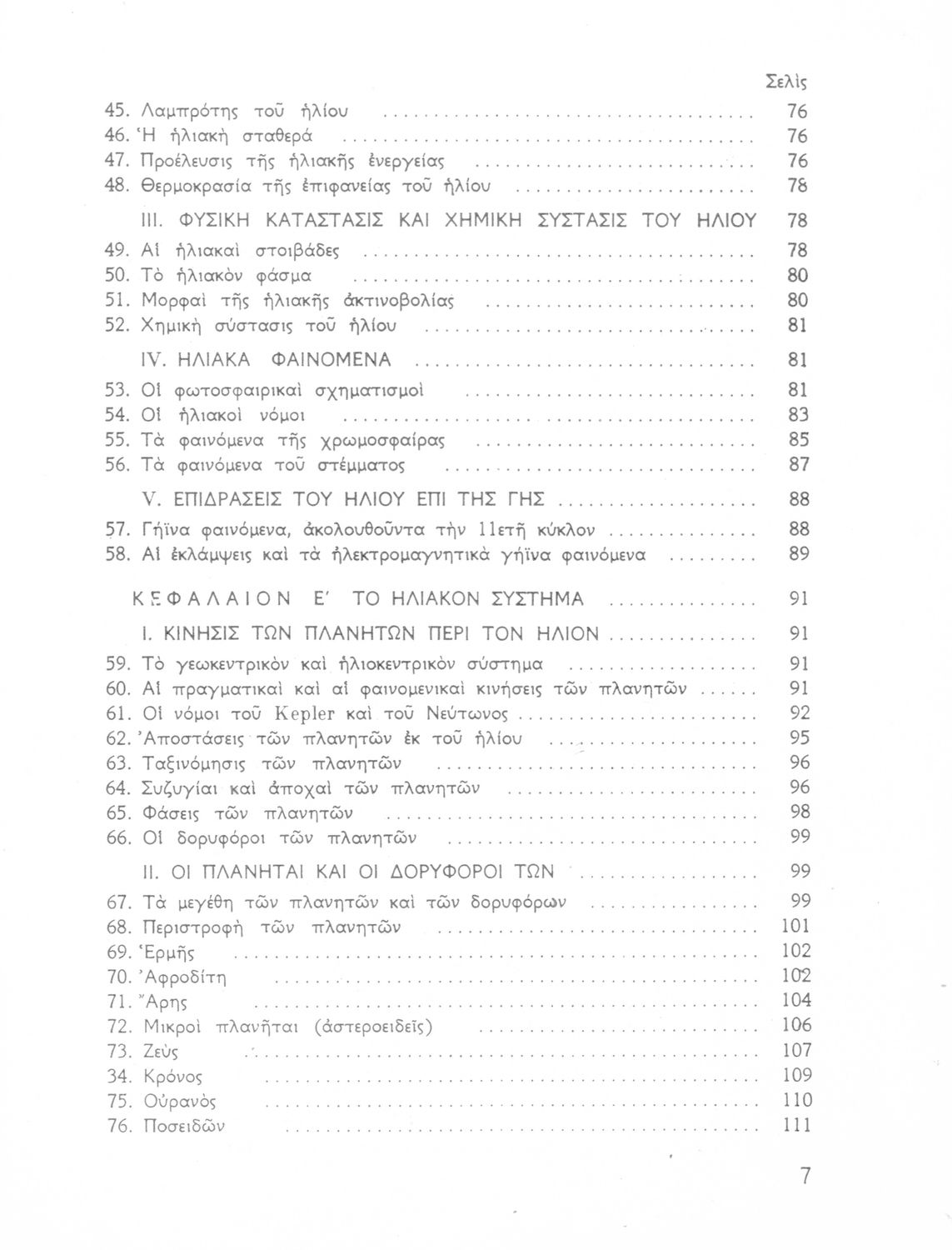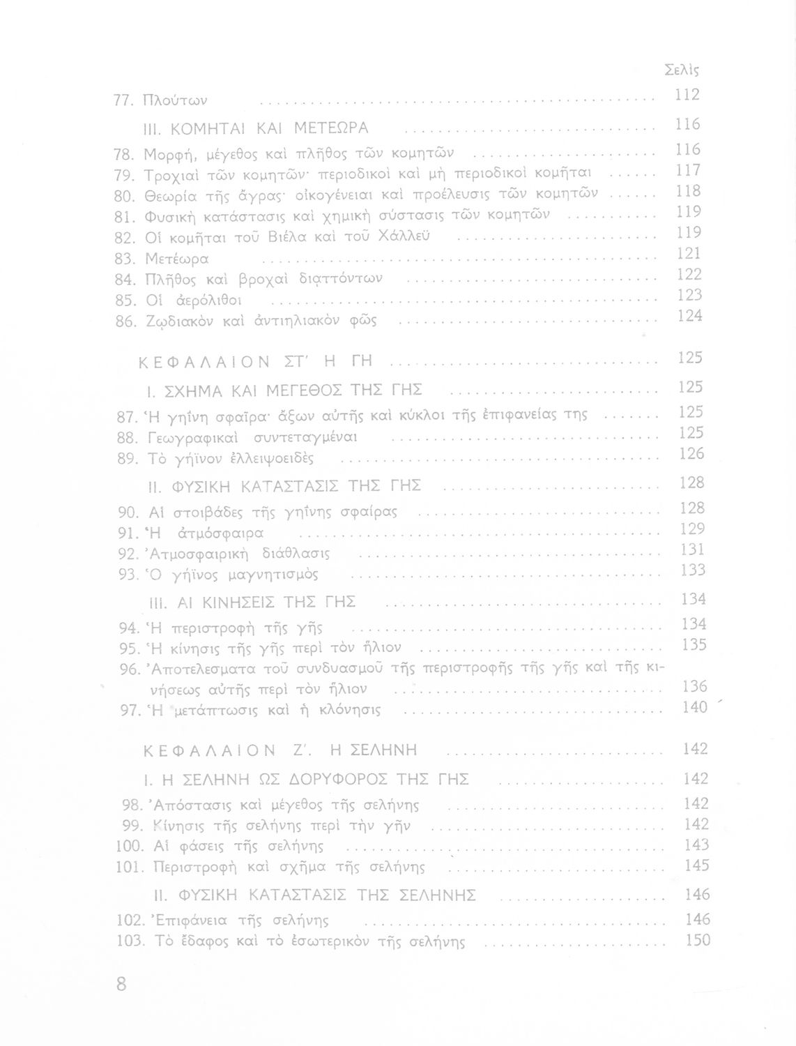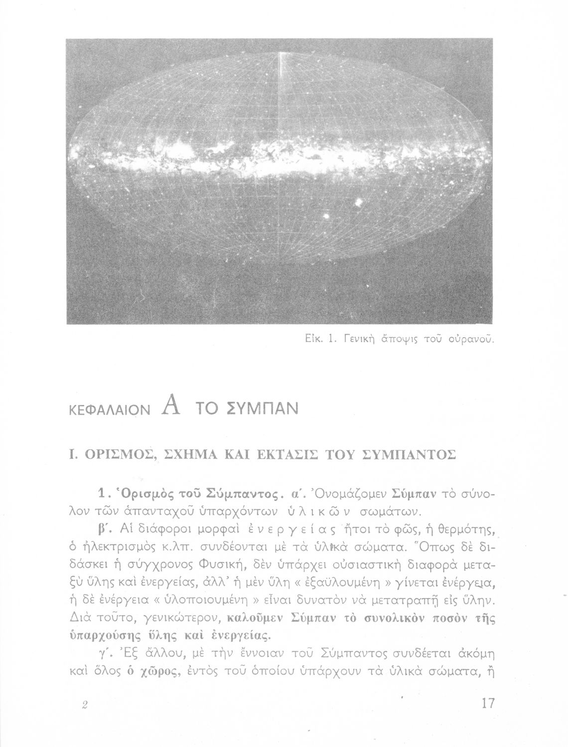 Σχολικό εγχειρίδιο Κοσμογραφίας ΣΤ΄ Γυμνασίου που πραγματεύεται τη μορφή, σύσταση, μέγεθος και κίνηση των γαλαξιών και των πλανητών. Περιέχει στοιχεία αστροναυτικής και πίνακα με 88 αστερισμούς, τα διεθνή ονόματα και τα σύμβολά τους. Φέρει το σύμβολο της δικτατορίας.