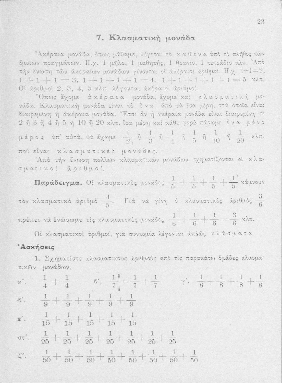 Σχολικό εγχειρίδιο Αριθμητικής για τα Ελληνικά Σχολεία χωρισμένο σε θεωρία και ασκήσεις που εστιάζει στις αριθμητικές πράξεις και τα κλάσματα. Περιέχει και παράρτημα λογιστικής.