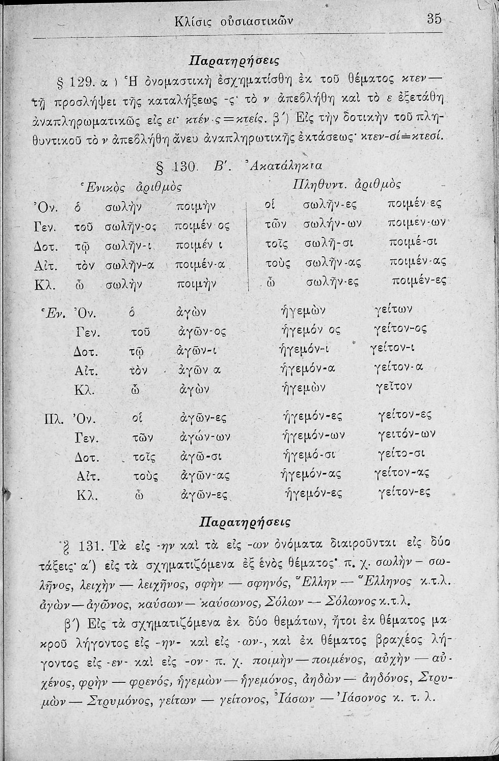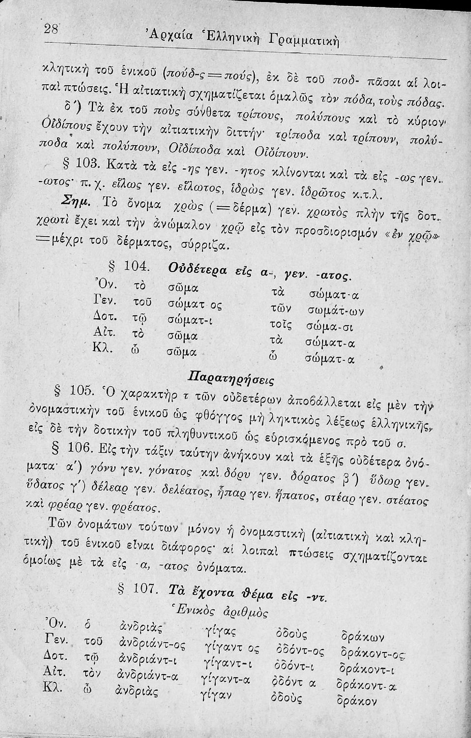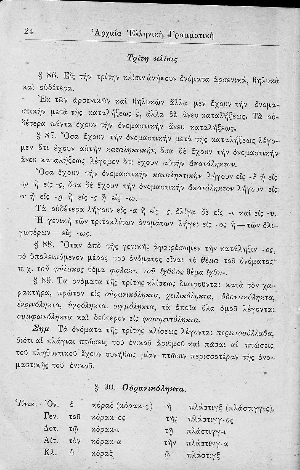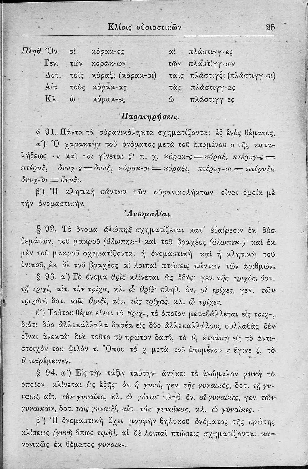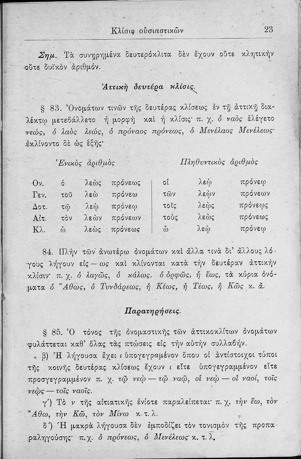 Σχολικό εγχειρίδιο Αρχαίων Ελληνικών για τα Ελληνικά Σχολεία, Παρθεναγωγεία και Γυμνάσια που περιέχει τους κανόνες γραμματικής και είναι χωρισμένο σε φθογγολογικό, τυπολογικό και ετυμολογικό μέρος.