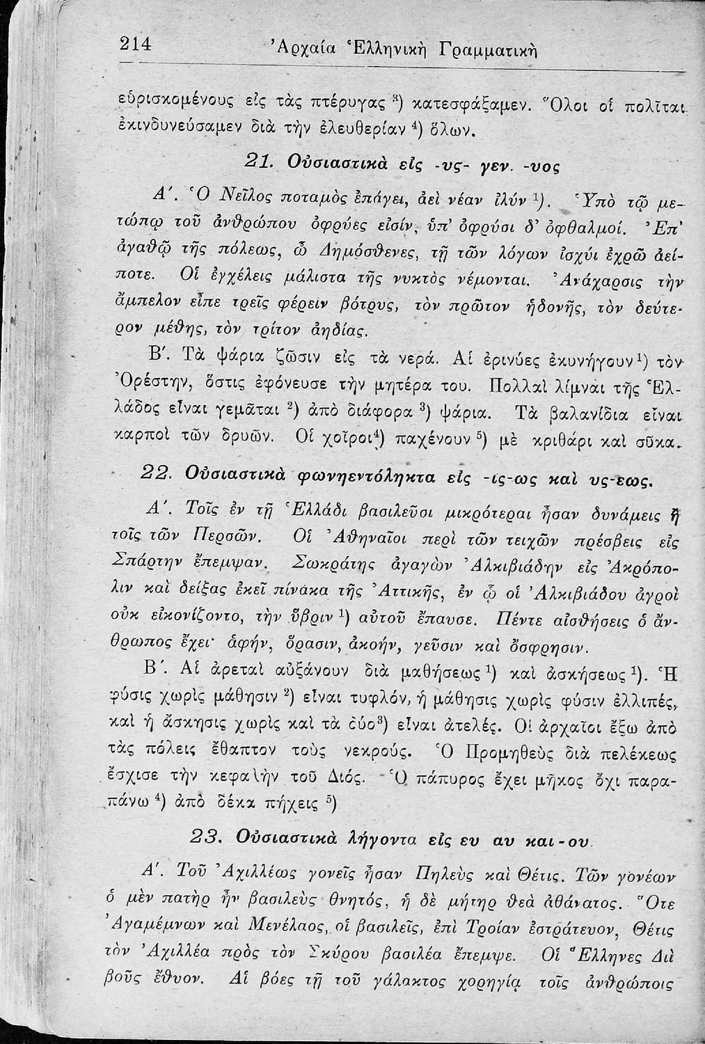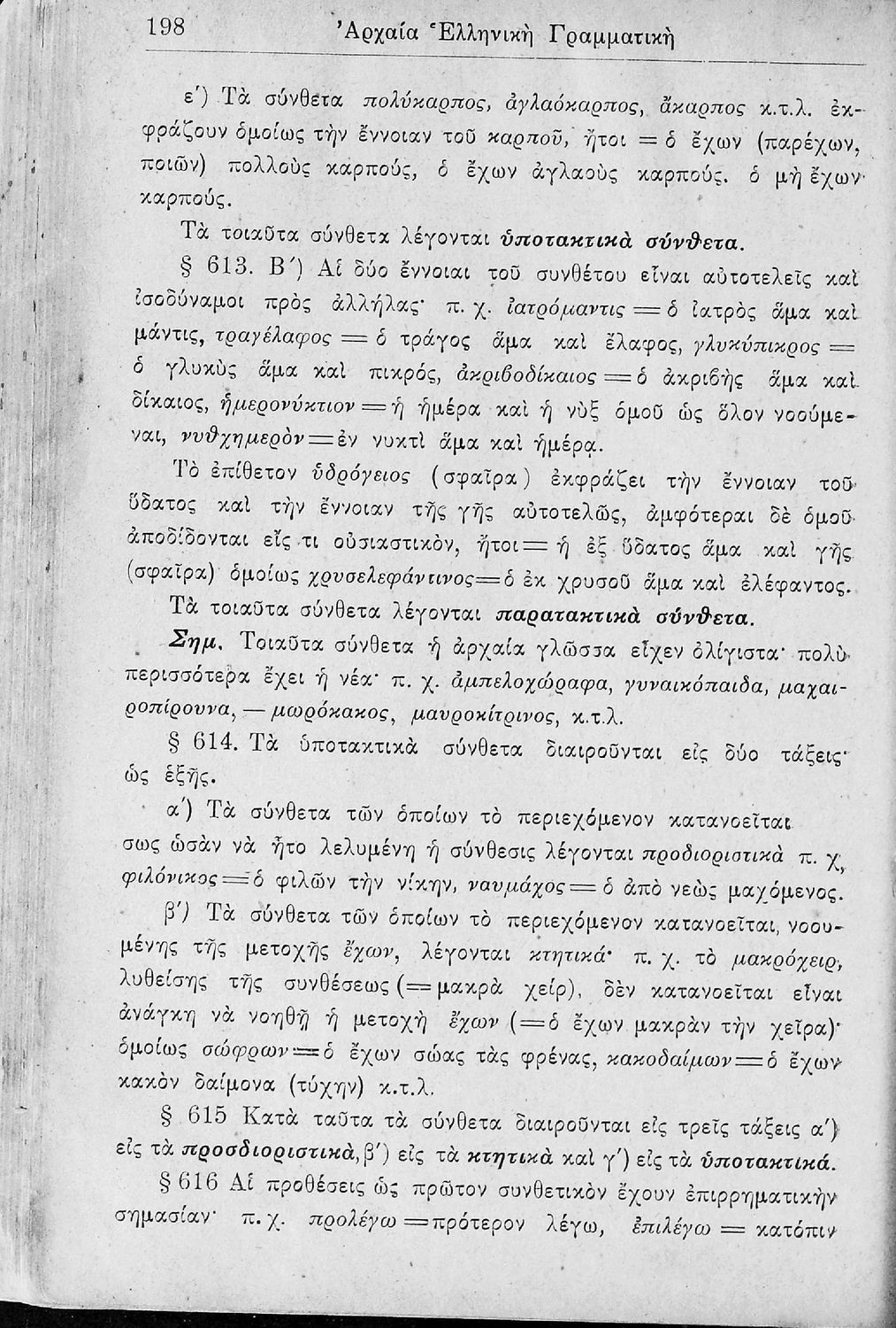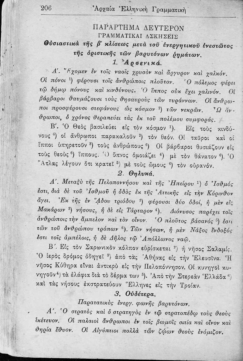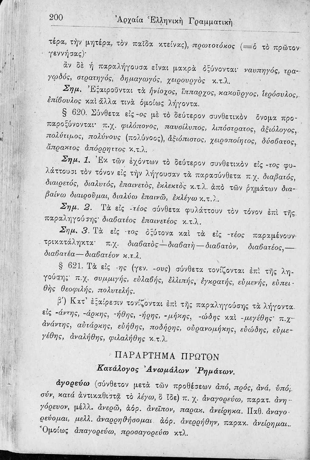 Σχολικό εγχειρίδιο Αρχαίων Ελληνικών για τα Ελληνικά Σχολεία, Παρθεναγωγεία και Γυμνάσια που περιέχει τους κανόνες γραμματικής και είναι χωρισμένο σε φθογγολογικό, τυπολογικό και ετυμολογικό μέρος.