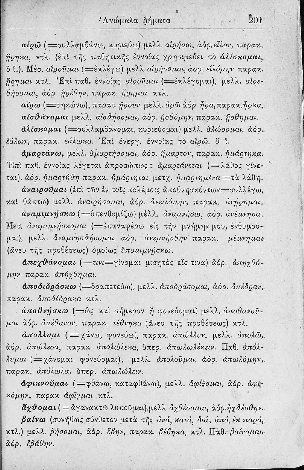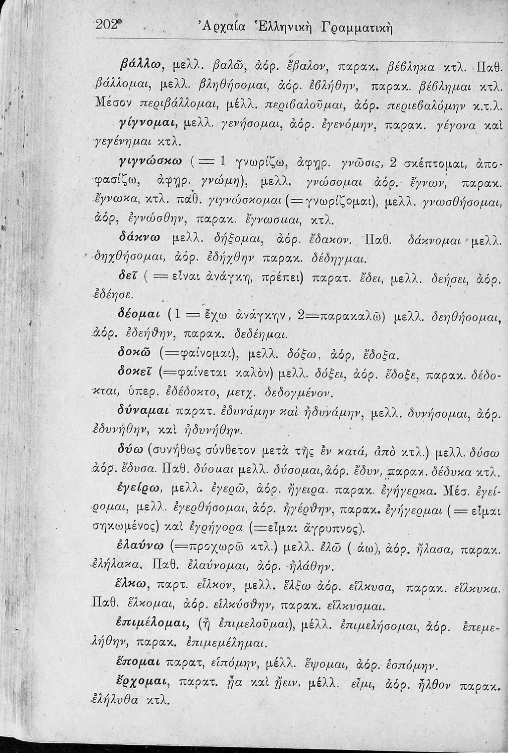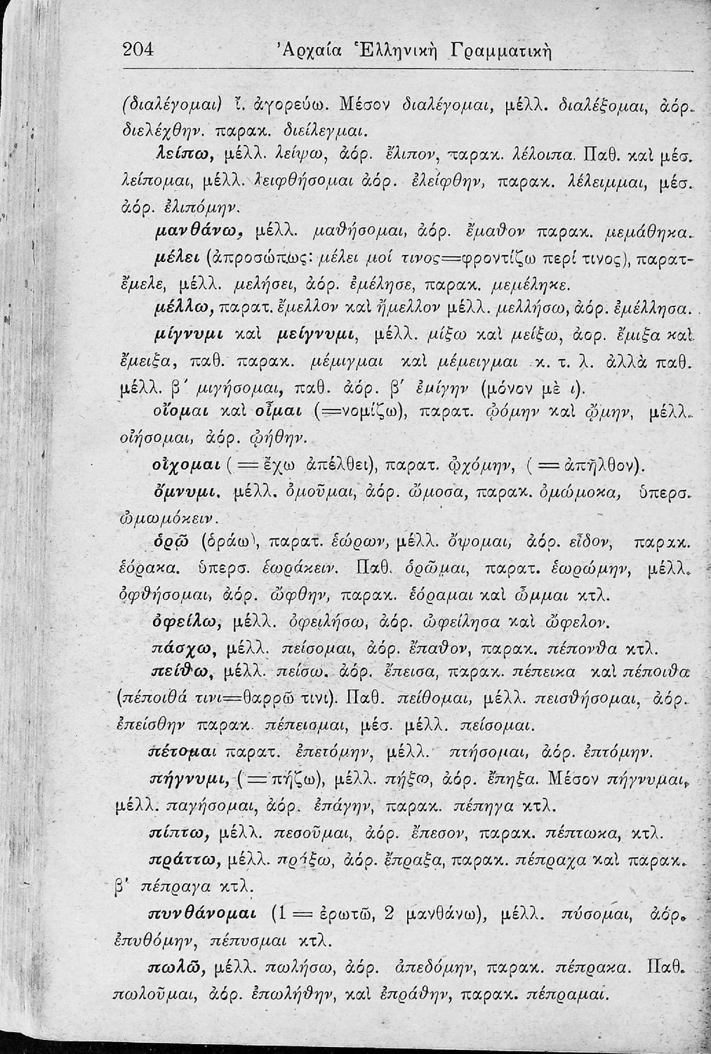 Μαθητικό βοήθημα Αρχαίων Ελληνικών για τα Ελληνικά Σχολεία, Παρθεναγωγεία και Γυμνάσια που περιλαμβάνει γραμματική της αρχαίας ελληνικής και κατάλογο ανωμάλων ρημάτων.