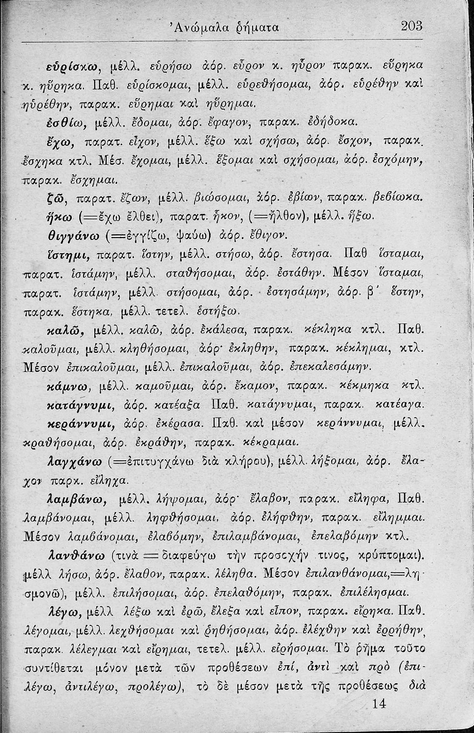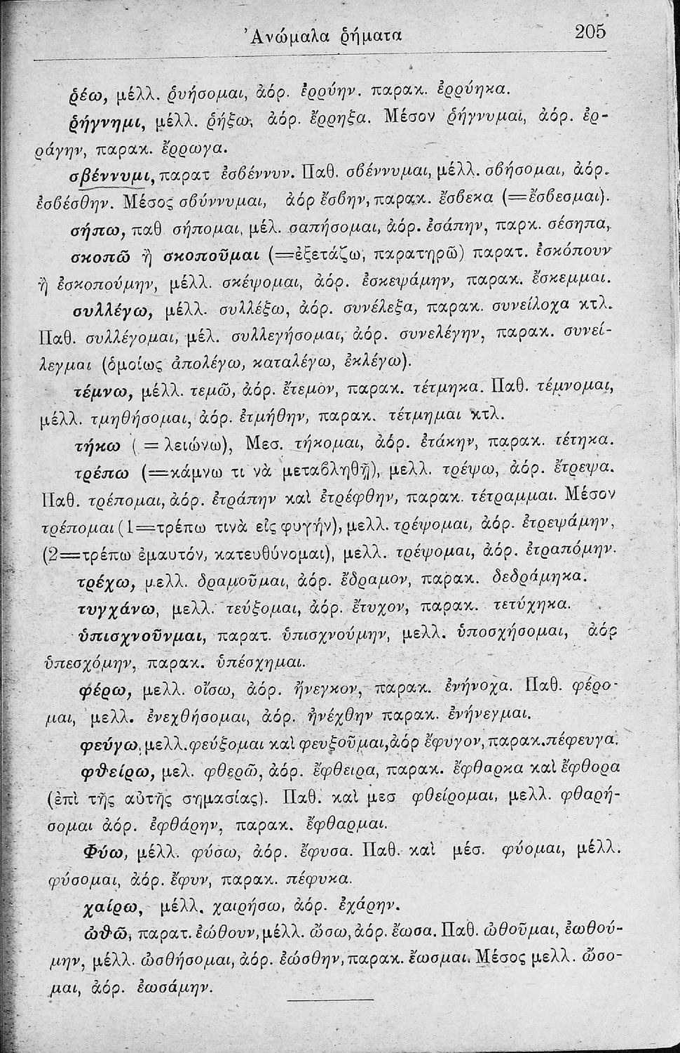 Μαθητικό βοήθημα Αρχαίων Ελληνικών Γυμνασίου, Ελληνικού Σχολείου και Παρθεναγωγείου που περιέχει τα ανώμαλα ρήματα της αττικής διαλέκτου και γραμματικές σημειώσεις.