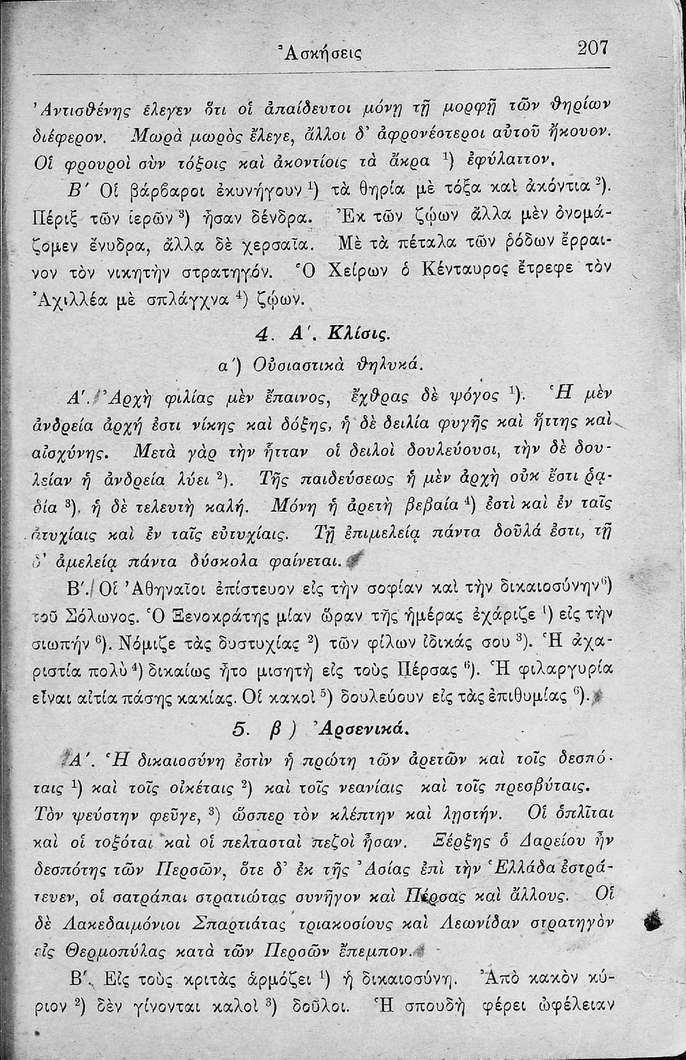Σχολικό εγχειρίδιο Αρχαίων Ελληνικών Γ' Ελληνικού Σχολείου που περιλαμβάνει γραμματική της αρχαίας ελληνικής, αποσπάσματα από το έργο του Ξενοφώντα Ελληνικά και τα έργα του Λουκιανού Ενύπνιον και Ανάχαρσις, ...