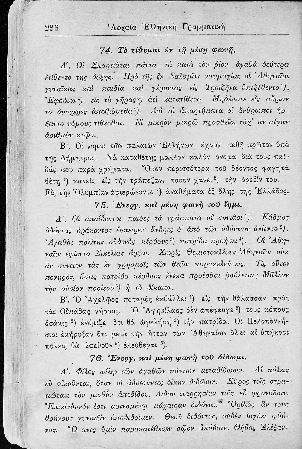 Σχολικό εγχειρίδιο Αρχαίων Ελληνικών για τα Ελληνικά Σχολεία, Παρθεναγωγεία και Γυμνάσια που περιέχει τους κανόνες γραμματικής και είναι χωρισμένο σε φθογγολογικό, τυπολογικό και ετυμολογικό μέρος.