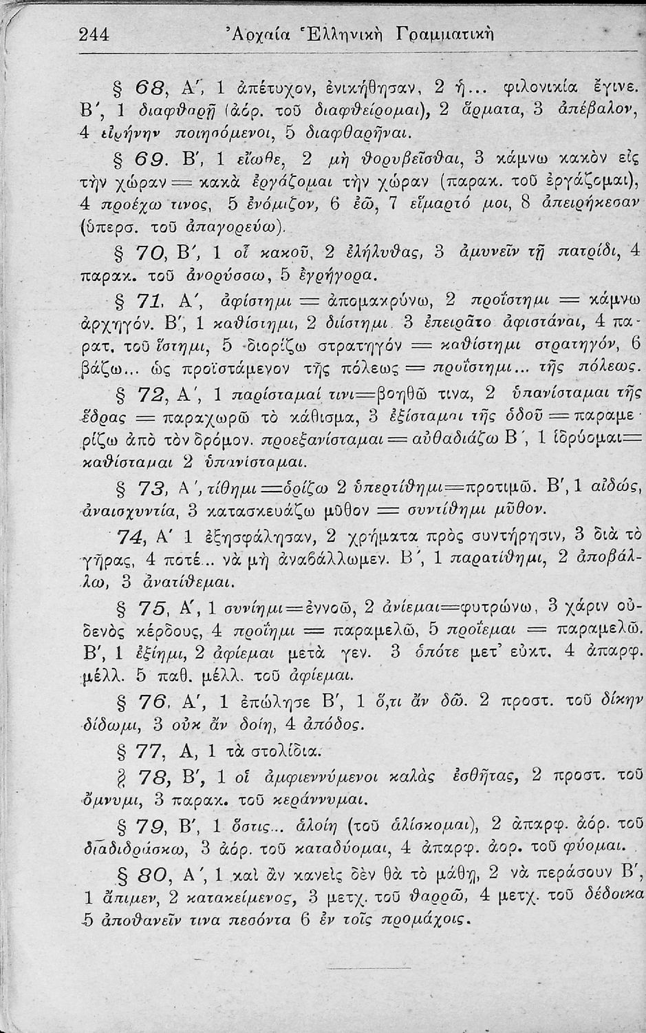 Μαθητικό βοήθημα Αρχαίων Ελληνικών για τα Ελληνικά Σχολεία, Παρθεναγωγεία και Γυμνάσια που περιλαμβάνει γραμματική της αρχαίας ελληνικής και κατάλογο ανωμάλων ρημάτων.