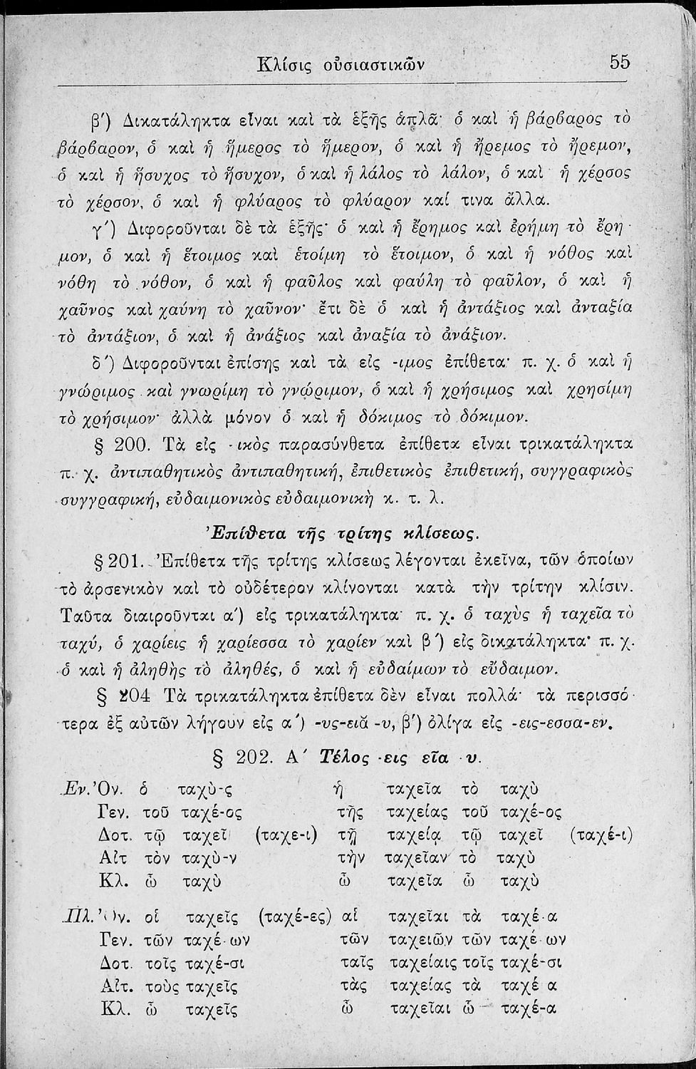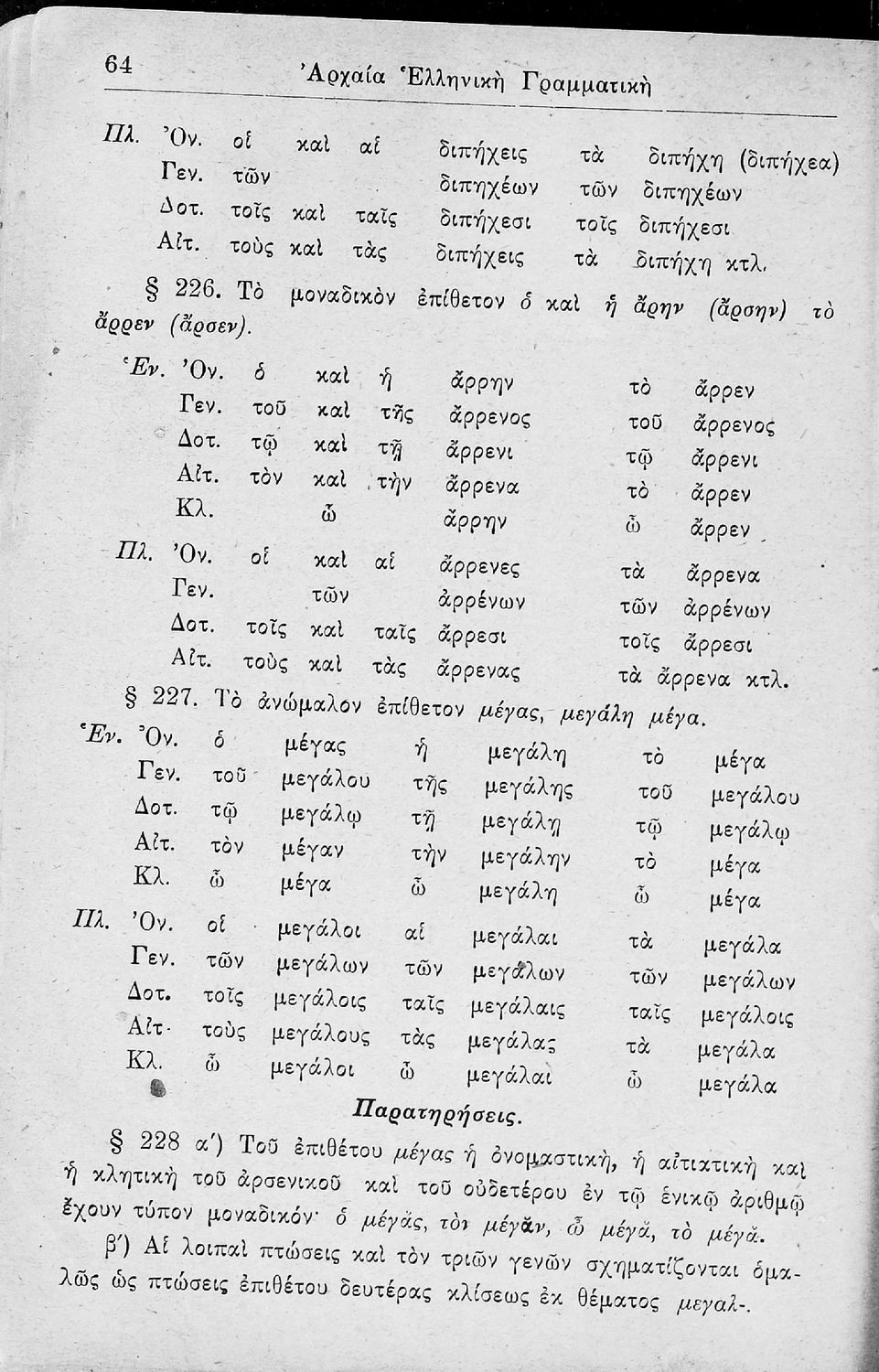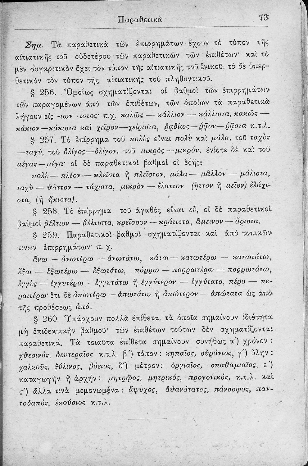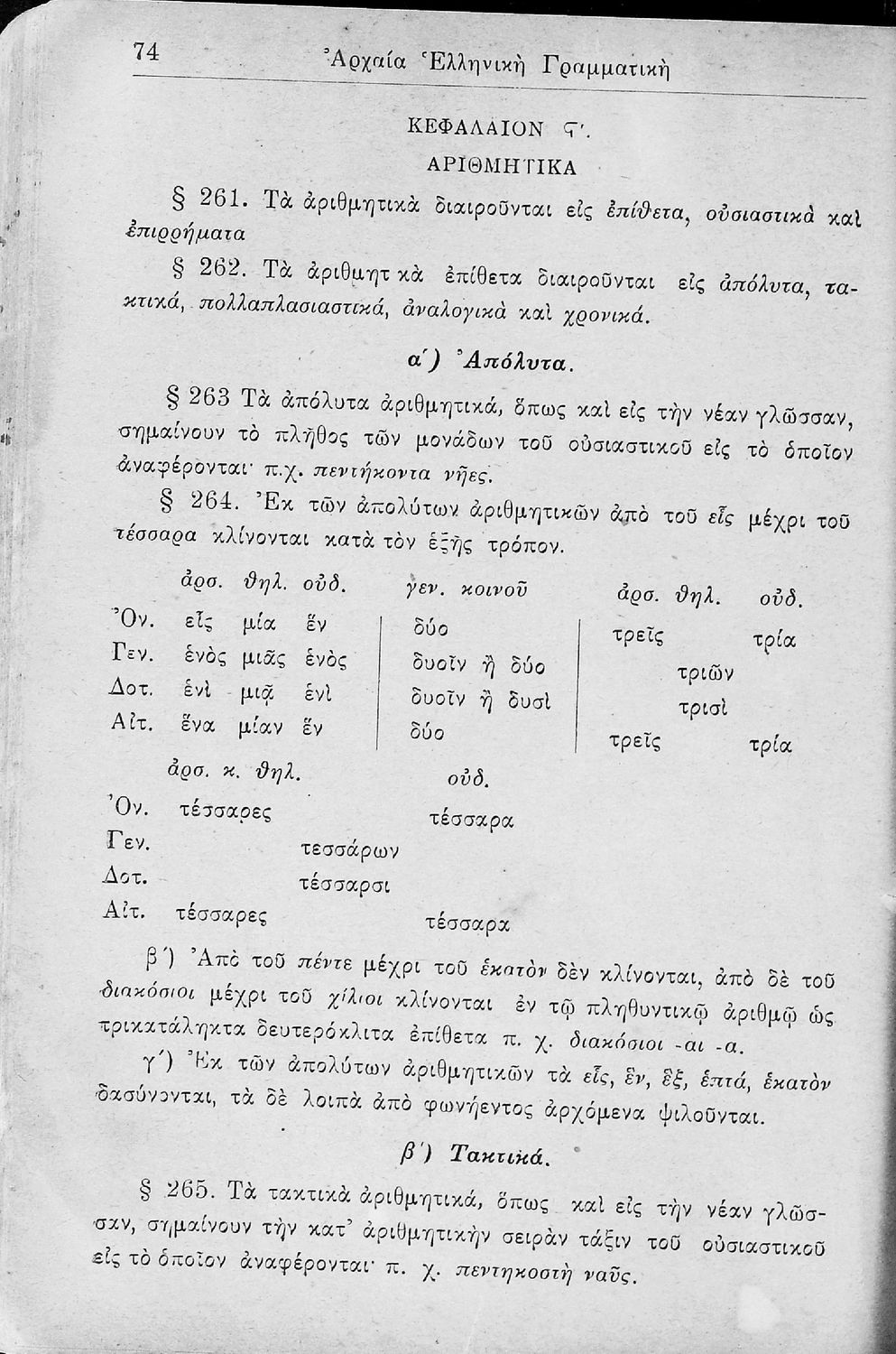 Σχολικό εγχειρίδιο Αρχαίων Ελληνικών για τα Ελληνικά Σχολεία, Παρθεναγωγεία και Γυμνάσια που περιέχει τους κανόνες γραμματικής και είναι χωρισμένο σε φθογγολογικό, τυπολογικό και ετυμολογικό μέρος.