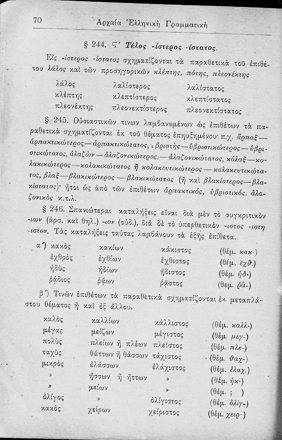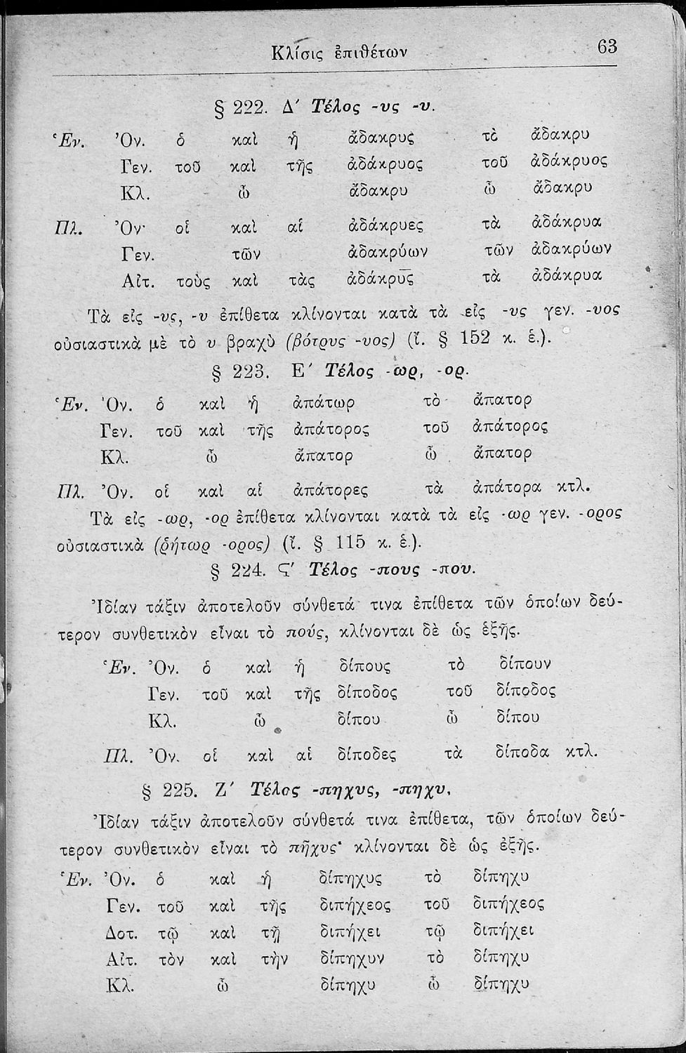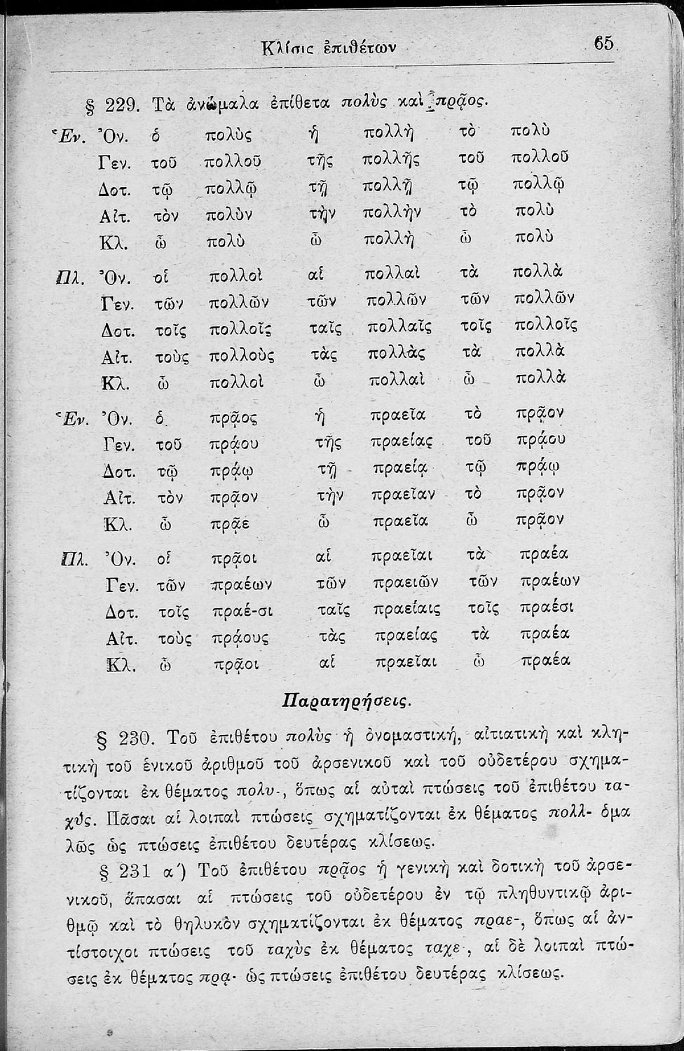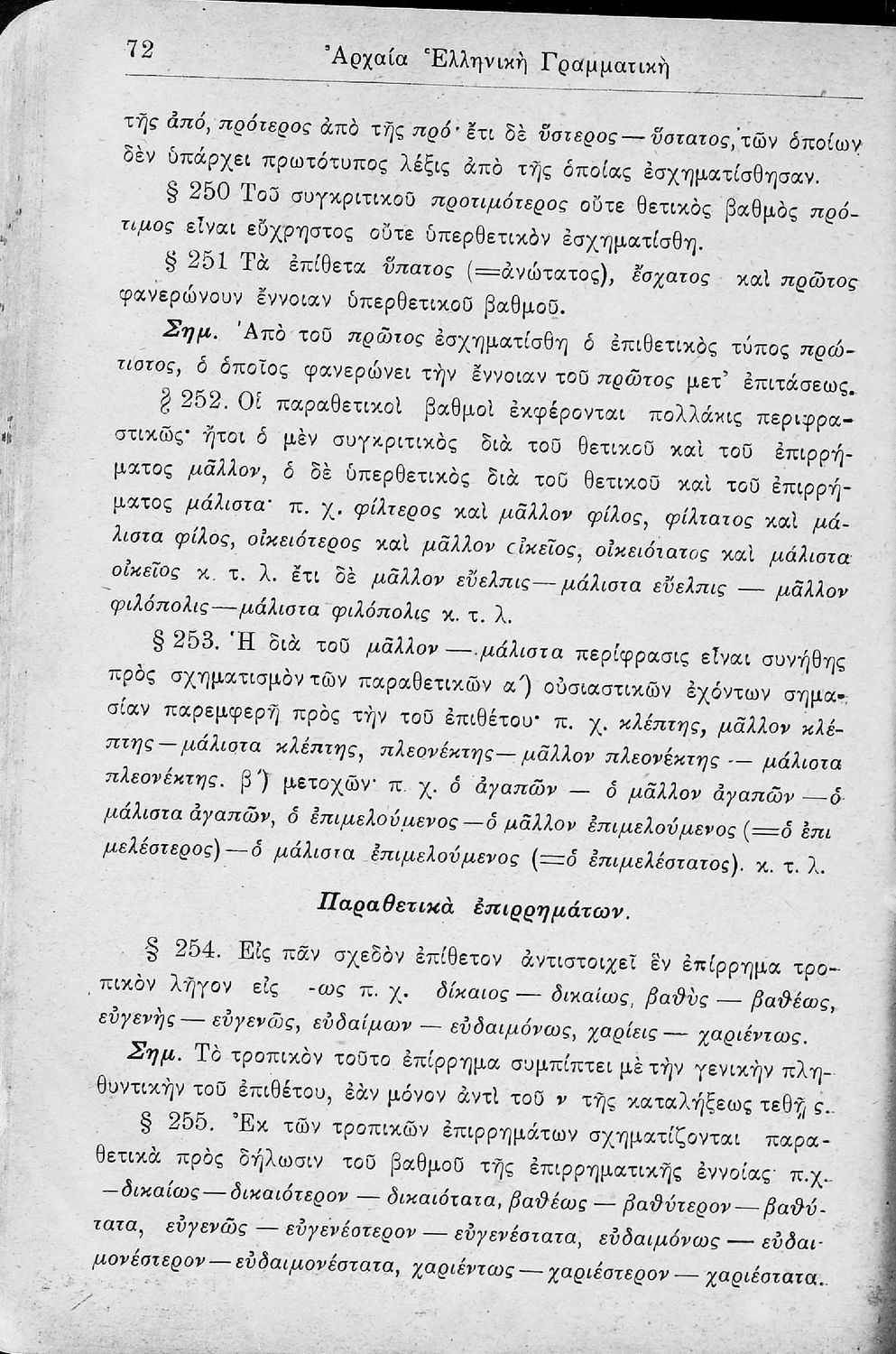 Σχολικό εγχειρίδιο Αρχαίων Ελληνικών για τα Ελληνικά Σχολεία, Παρθεναγωγεία και Γυμνάσια που περιέχει τους κανόνες γραμματικής και είναι χωρισμένο σε φθογγολογικό, τυπολογικό και ετυμολογικό μέρος.