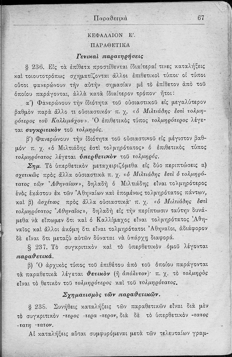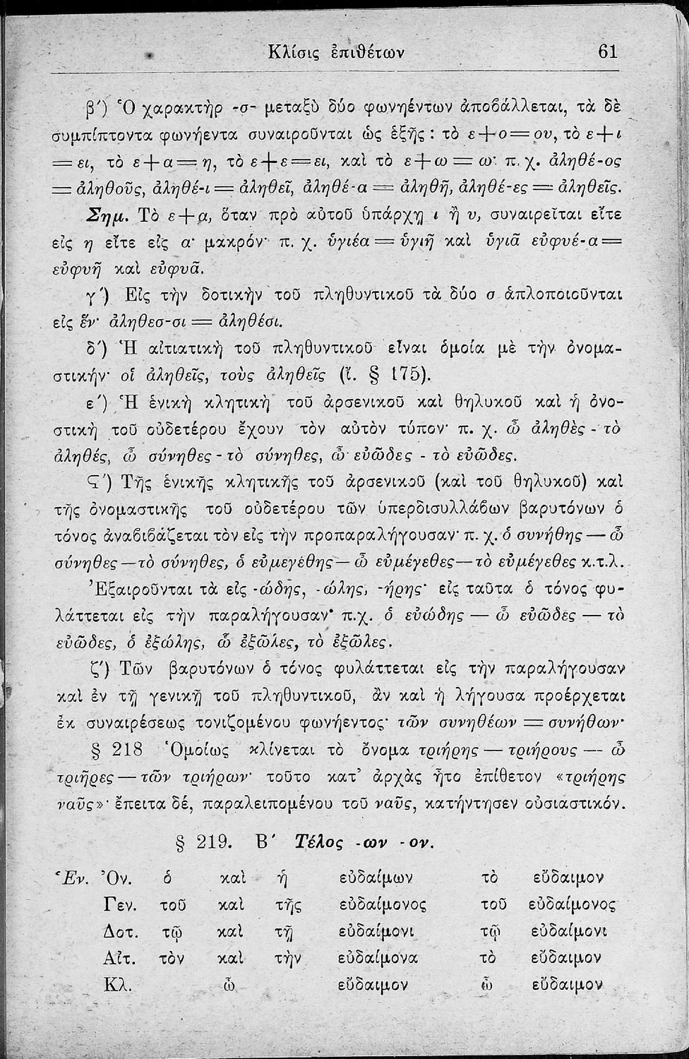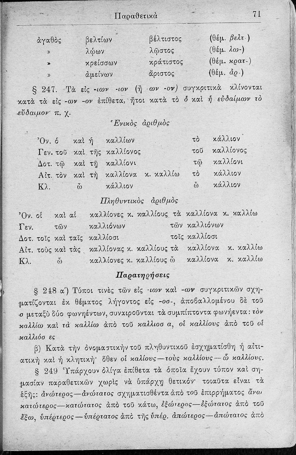 Σχολικό εγχειρίδιο Αρχαίων Ελληνικών για τα Ελληνικά Σχολεία και Παρθεναγωγεία που περιλαμβάνει κανόνες της γραμματικής της αρχαίας ελληνικής και είναι χωρισμένη στο φθογγολογικό και στο τυπολογικό μέρος.