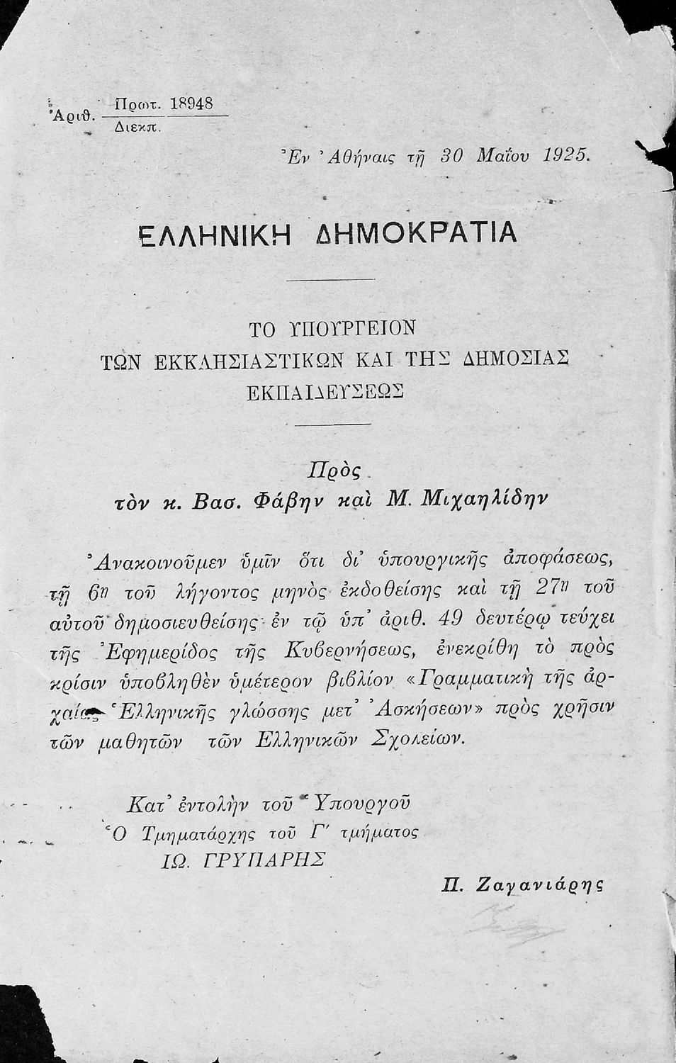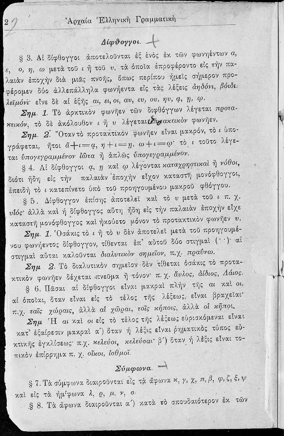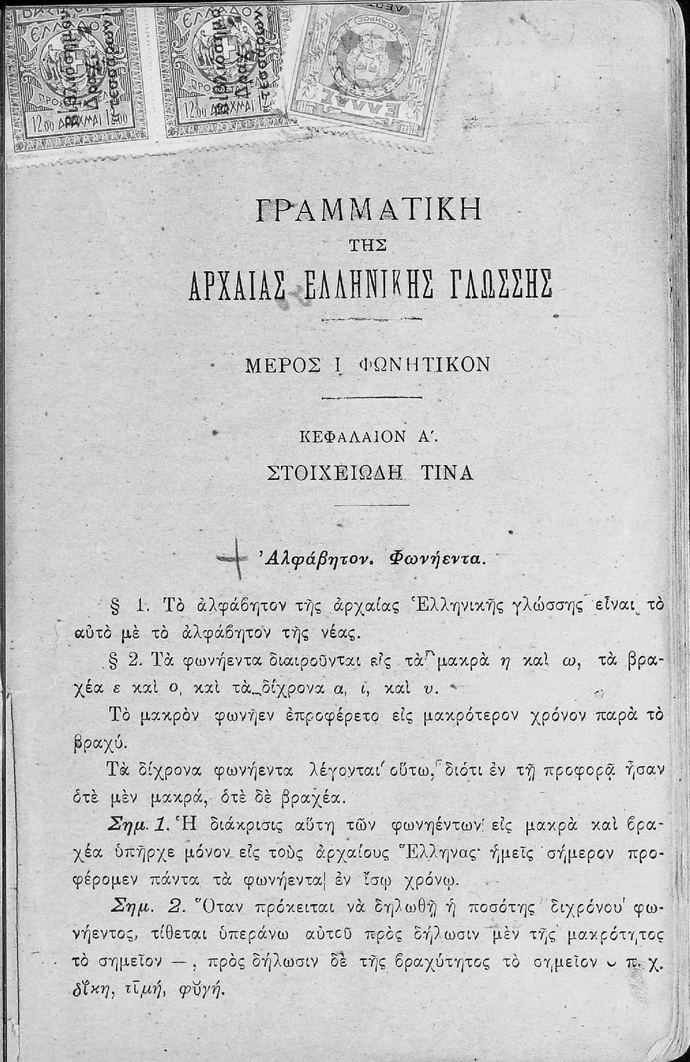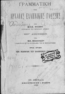 Σχολικό εγχειρίδιο Αρχαίων Ελληνικών για τα Ελληνικά Σχολεία που αποτελεί γραμματική της αρχαίας ελληνικής και είναι χωρισμένο στο φθογγολογικό και το τυπολογικό μέρος. Περιέχει και σύντομα κείμενα που χρησιμοποιούνται για τη διδασκαλία των γραμματικών φαινομένων και ασκήσεις.