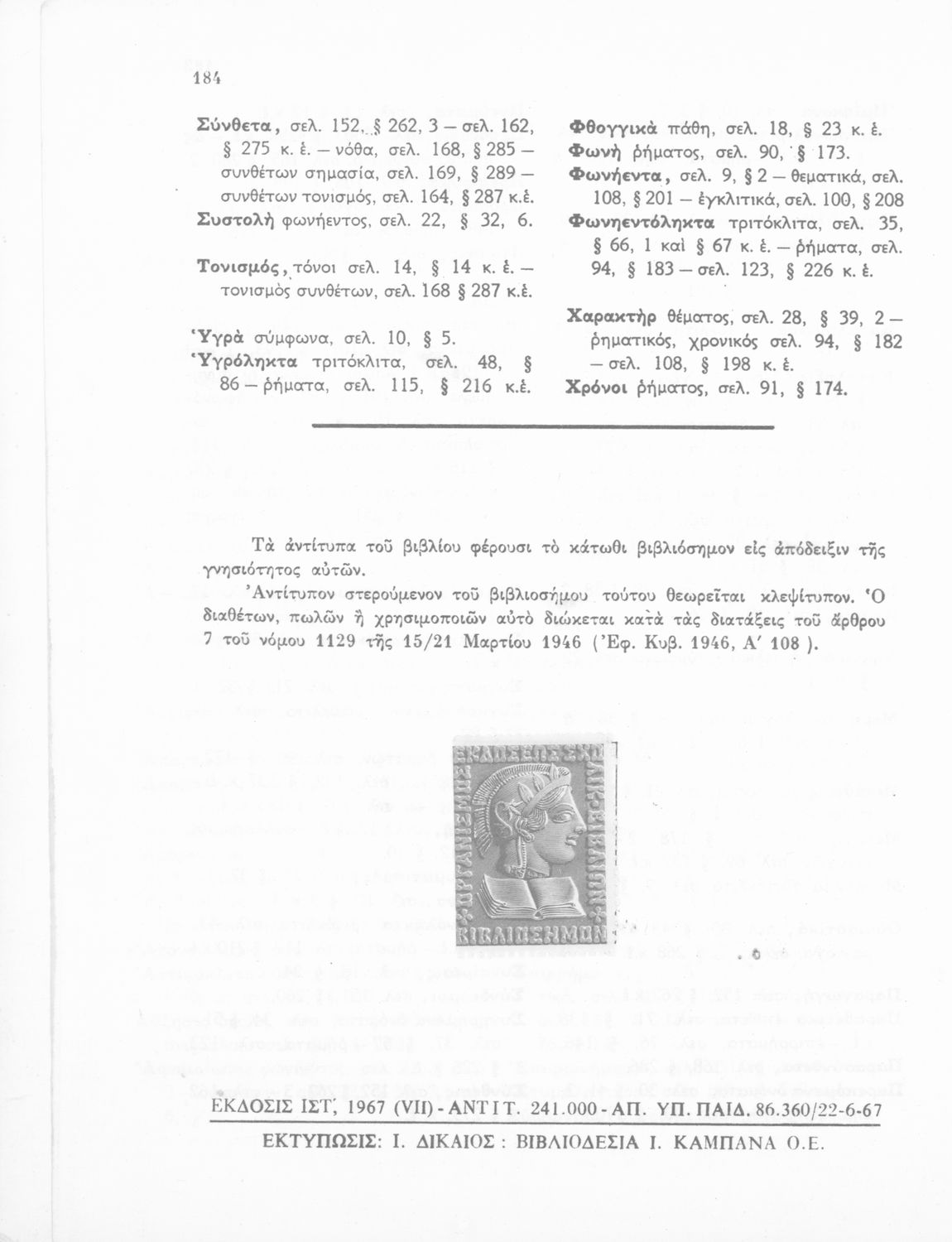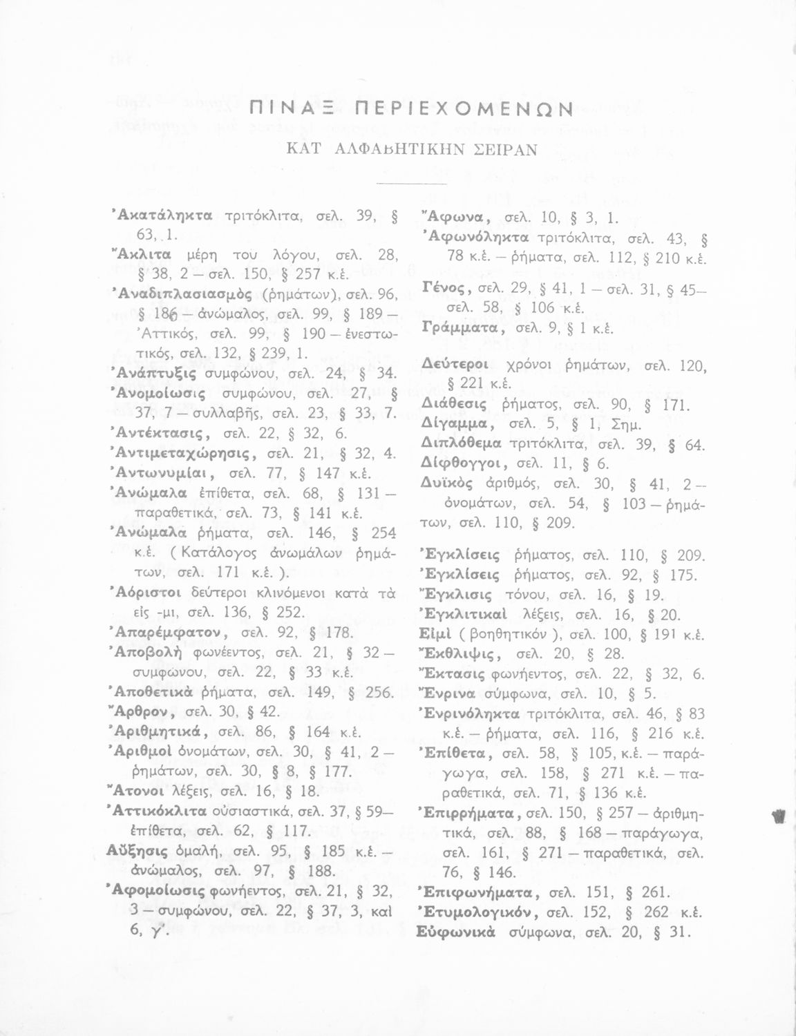 Σχολικό εγχειρίδιο Αρχαίων Ελληνικών Α', Β', και Γ' Γυμνασίου που περιέχει τους κανόνες γραμματικής και είναι χωρισμένο σε φθογγολογικό, τυπολογικό και ετυμολογικό μέρος. Περιέχει και κατάλογο ανωμάλων ρημάτων.