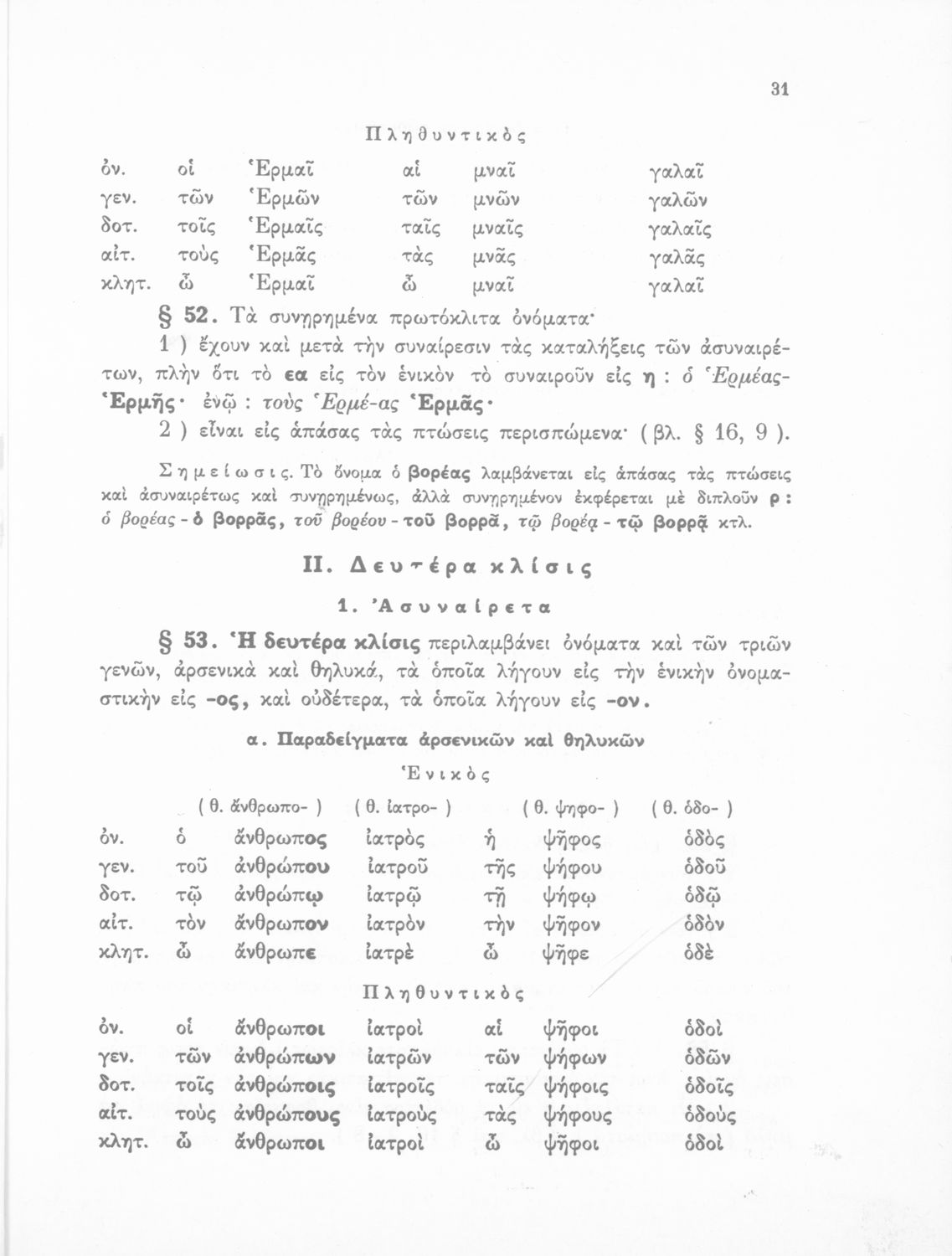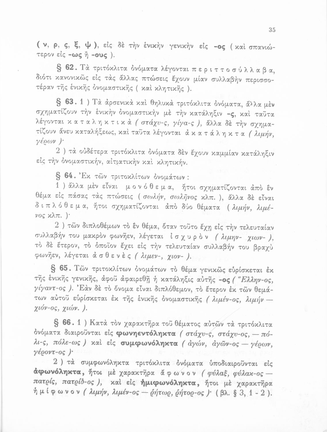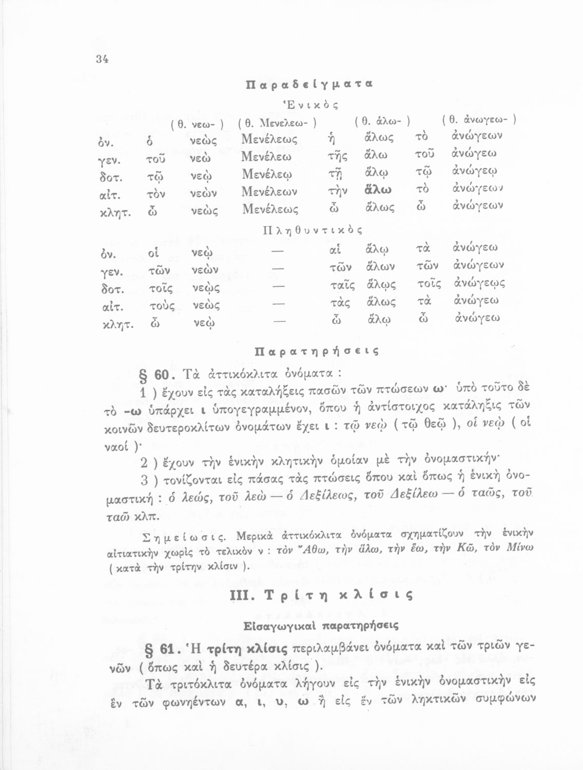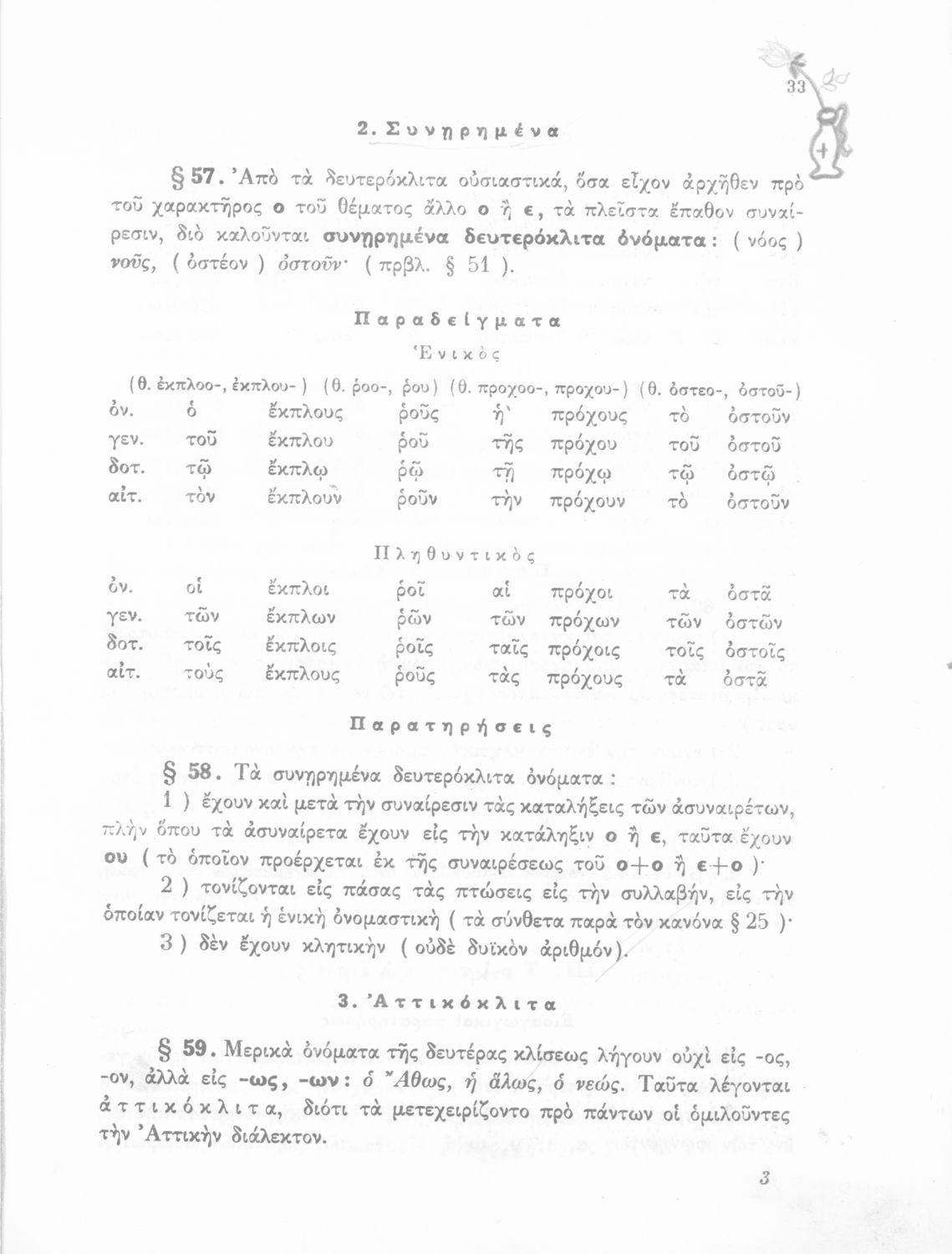 Σχολικό εγχειρίδιο Αρχαίων Ελληνικών Α', Β', και Γ' Γυμνασίου που περιέχει τους κανόνες γραμματικής και είναι χωρισμένο σε φθογγολογικό, τυπολογικό και ετυμολογικό μέρος. Περιέχει και κατάλογο ανωμάλων ρημάτων.