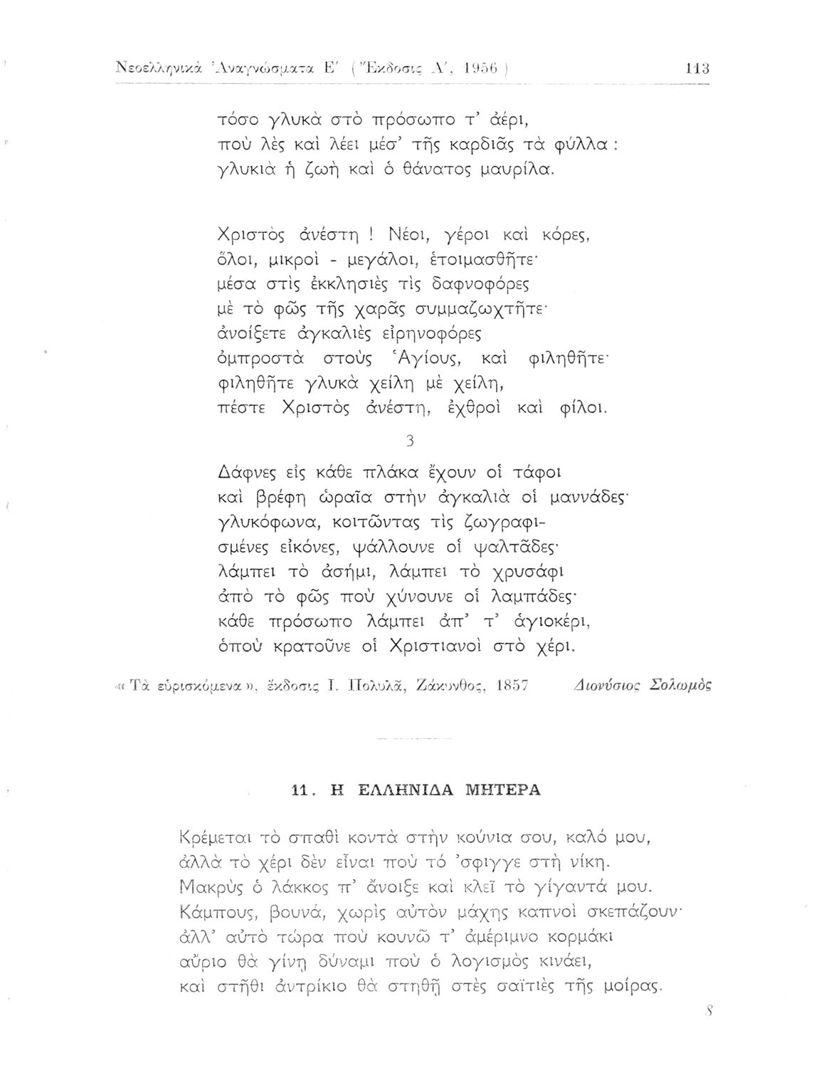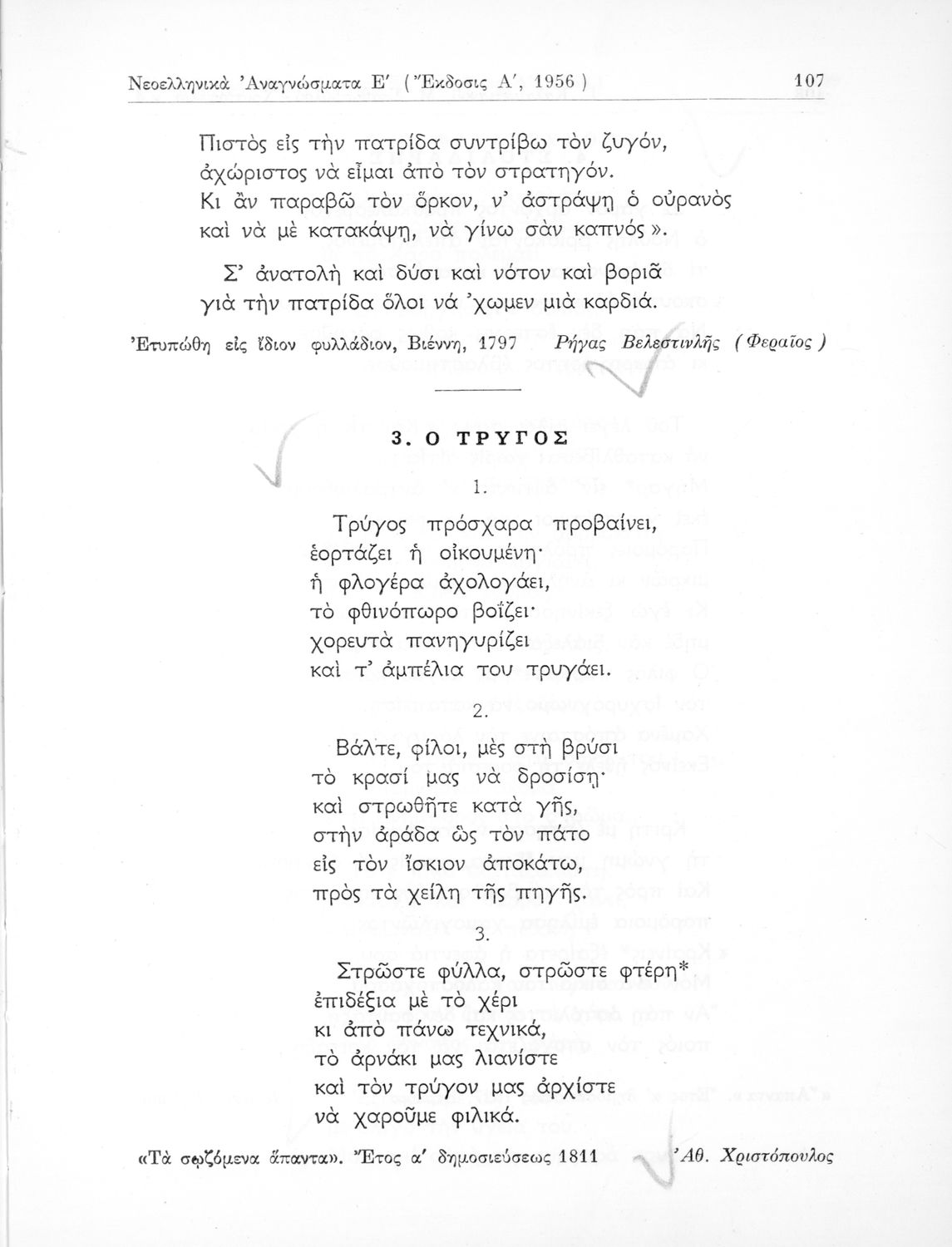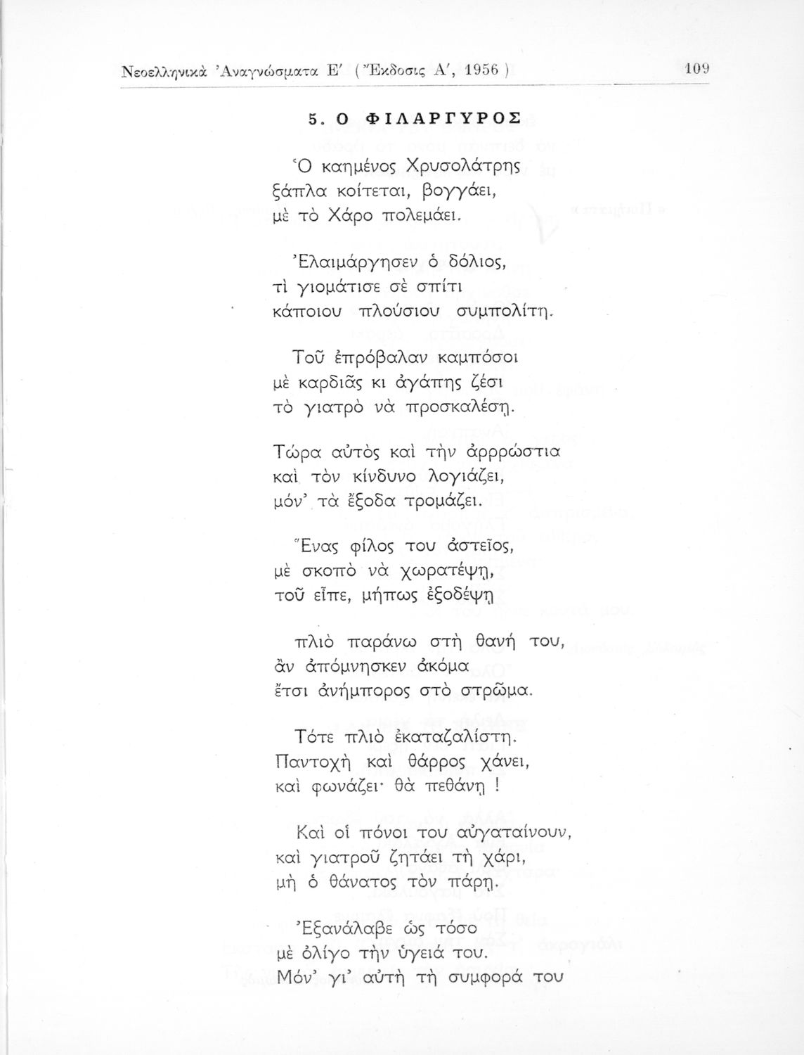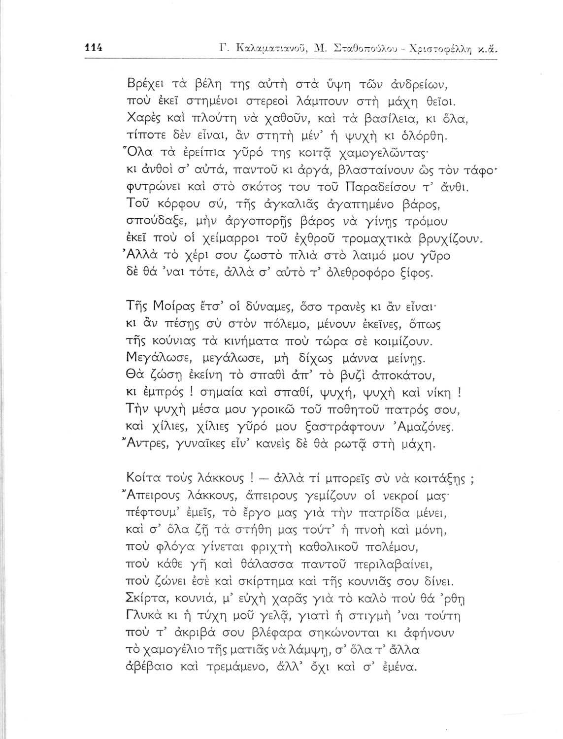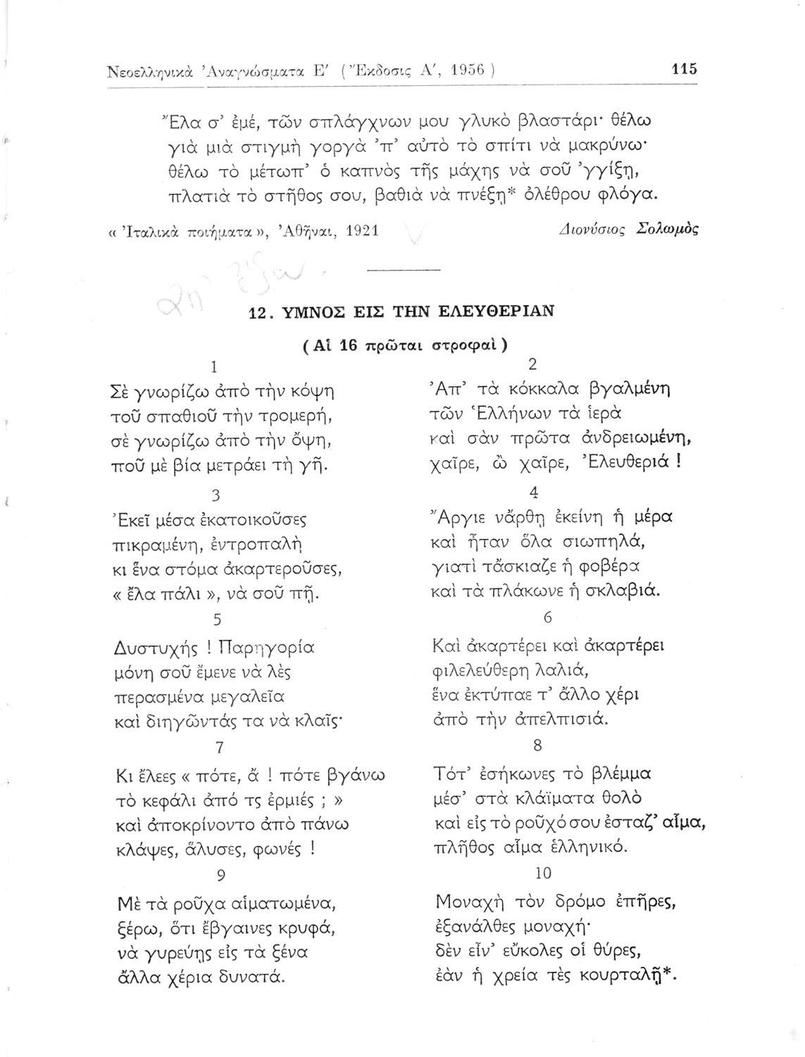 Σχολικό εγχειρίδιο Νέων Ελληνικών Ε΄ Γυμνασίου που περιέχει πεζά και ποιήματα συγγραφέων της βυζαντινής και μεταβυζαντινής περιόδου πατριωτικού και θρησκευτικού περιεχομένου. Περιλαμβάνει και πεζά και ποιήματα Ελλήνων και ξένων συγγραφέων και δημοτικά τραγούδια πατριωτικού περιεχομένου και παράρτημα με βιογραφίες των συγγραφέων και λεξιλόγιο.