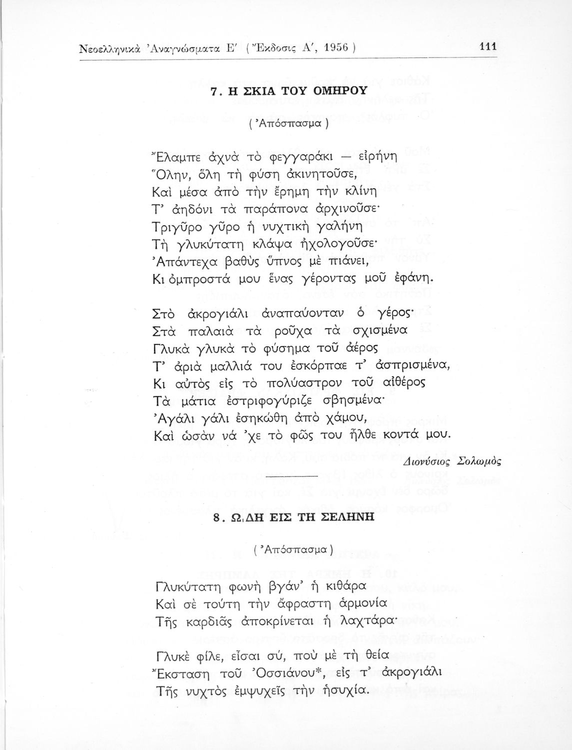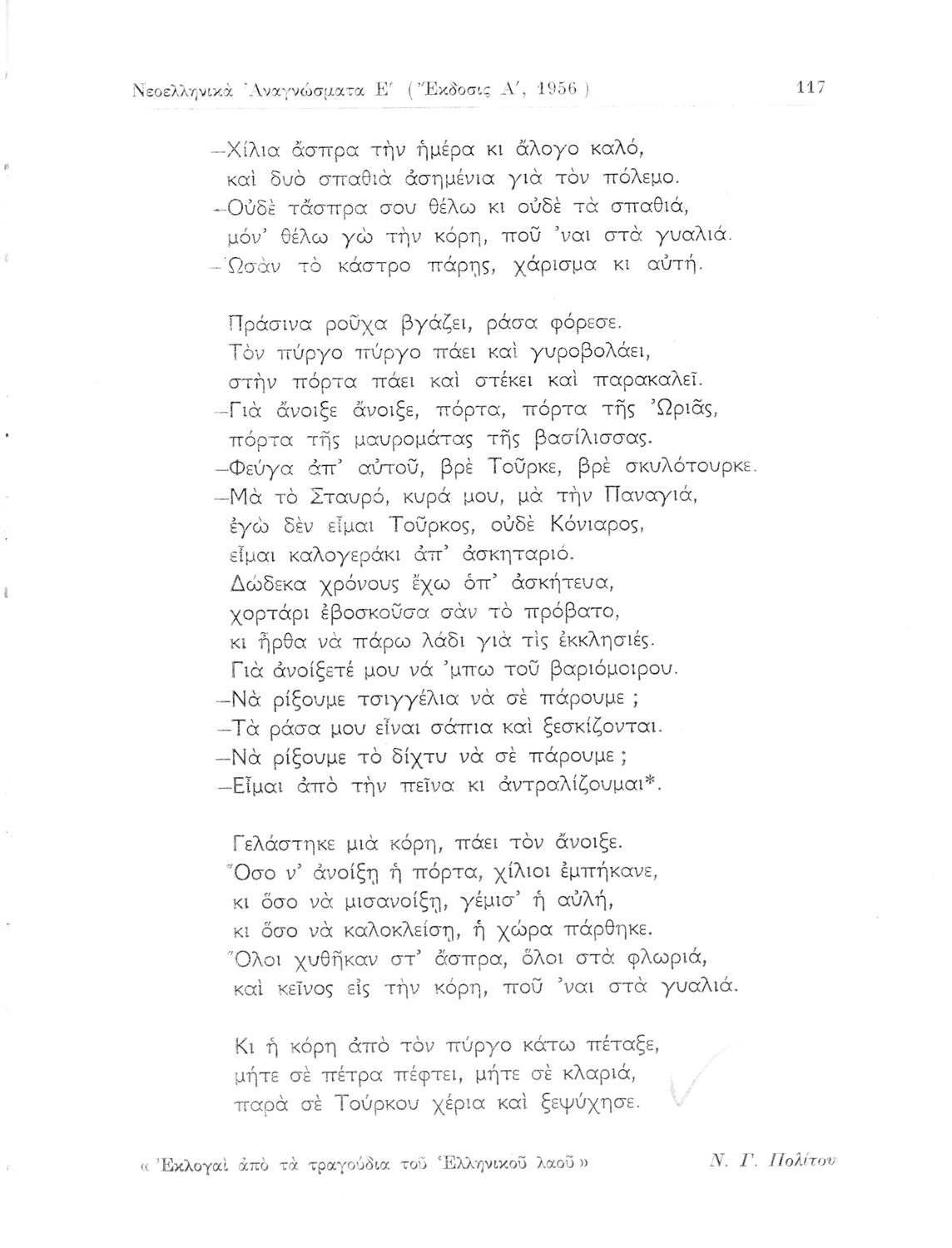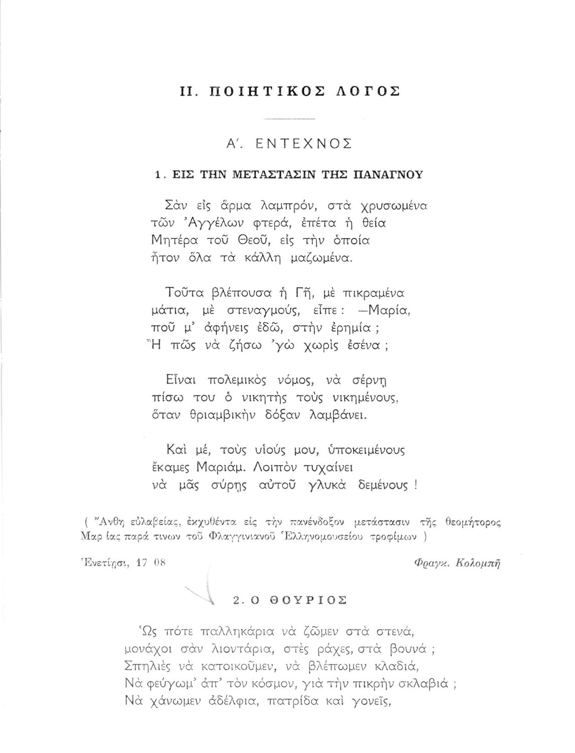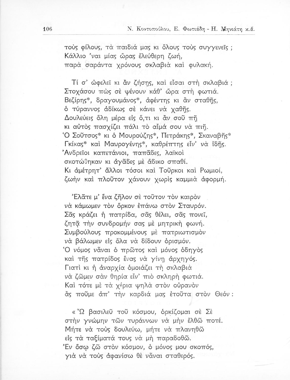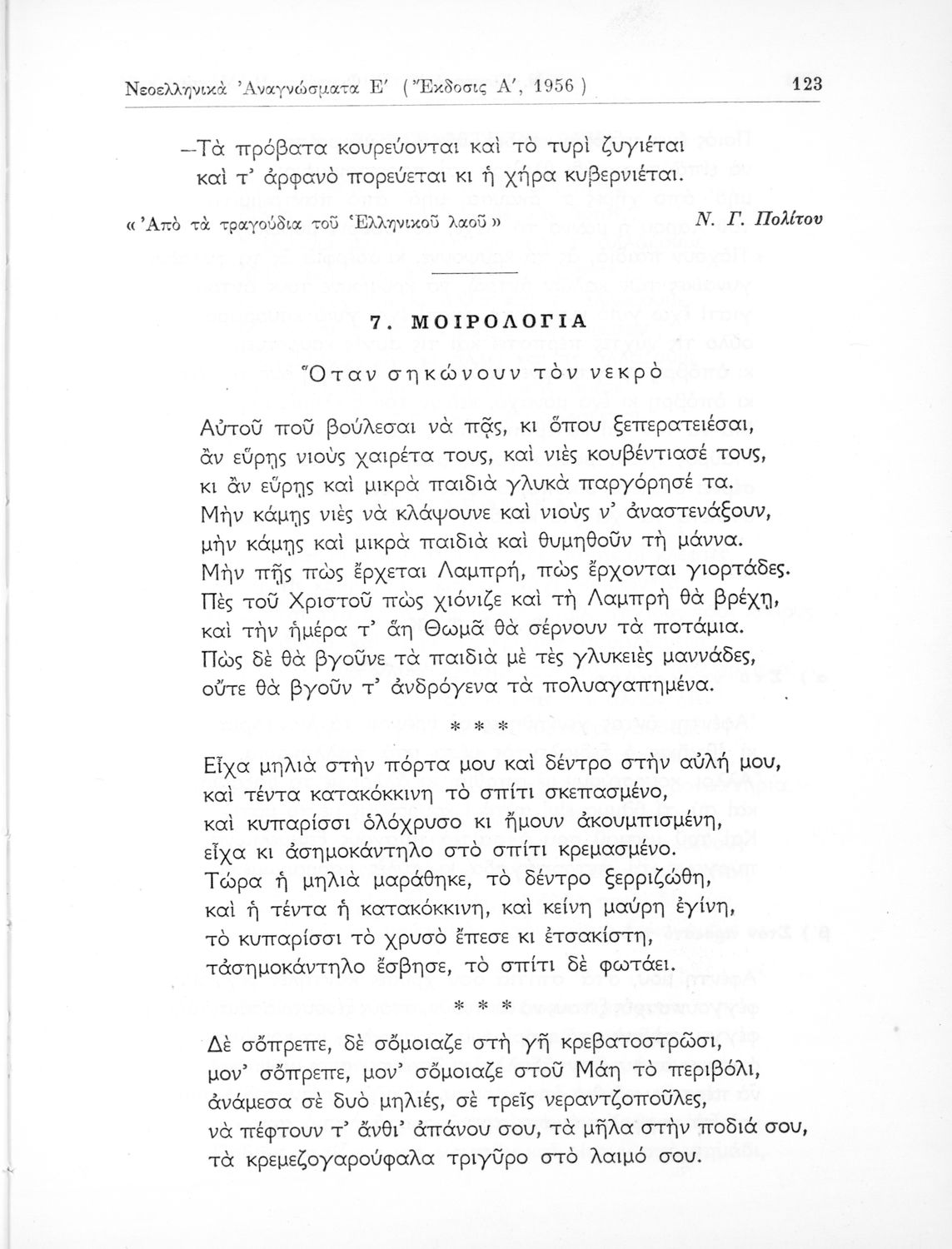 Σχολικό εγχειρίδιο Νέων Ελληνικών Ε΄ Γυμνασίου που περιέχει πεζά και ποιήματα συγγραφέων της βυζαντινής και μεταβυζαντινής περιόδου πατριωτικού και θρησκευτικού περιεχομένου. Περιλαμβάνει και πεζά και ποιήματα Ελλήνων και ξένων συγγραφέων και δημοτικά τραγούδια πατριωτικού περιεχομένου και παράρτημα με βιογραφίες των συγγραφέων και λεξιλόγιο.