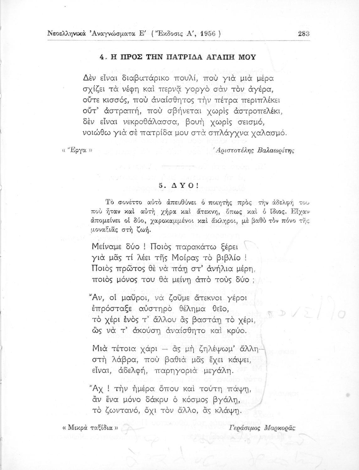 Σχολικό εγχειρίδιο Νέων Ελληνικών Ε΄ Γυμνασίου που περιλαμβάνει κείμενα Ελλήνων συγγραφέων και δημοτικά τραγούδια με θέματα από την σύγχρονη ελληνική ιστορία, τη θρησκευτική παράδοση, την οικογενειακή ζωή, και