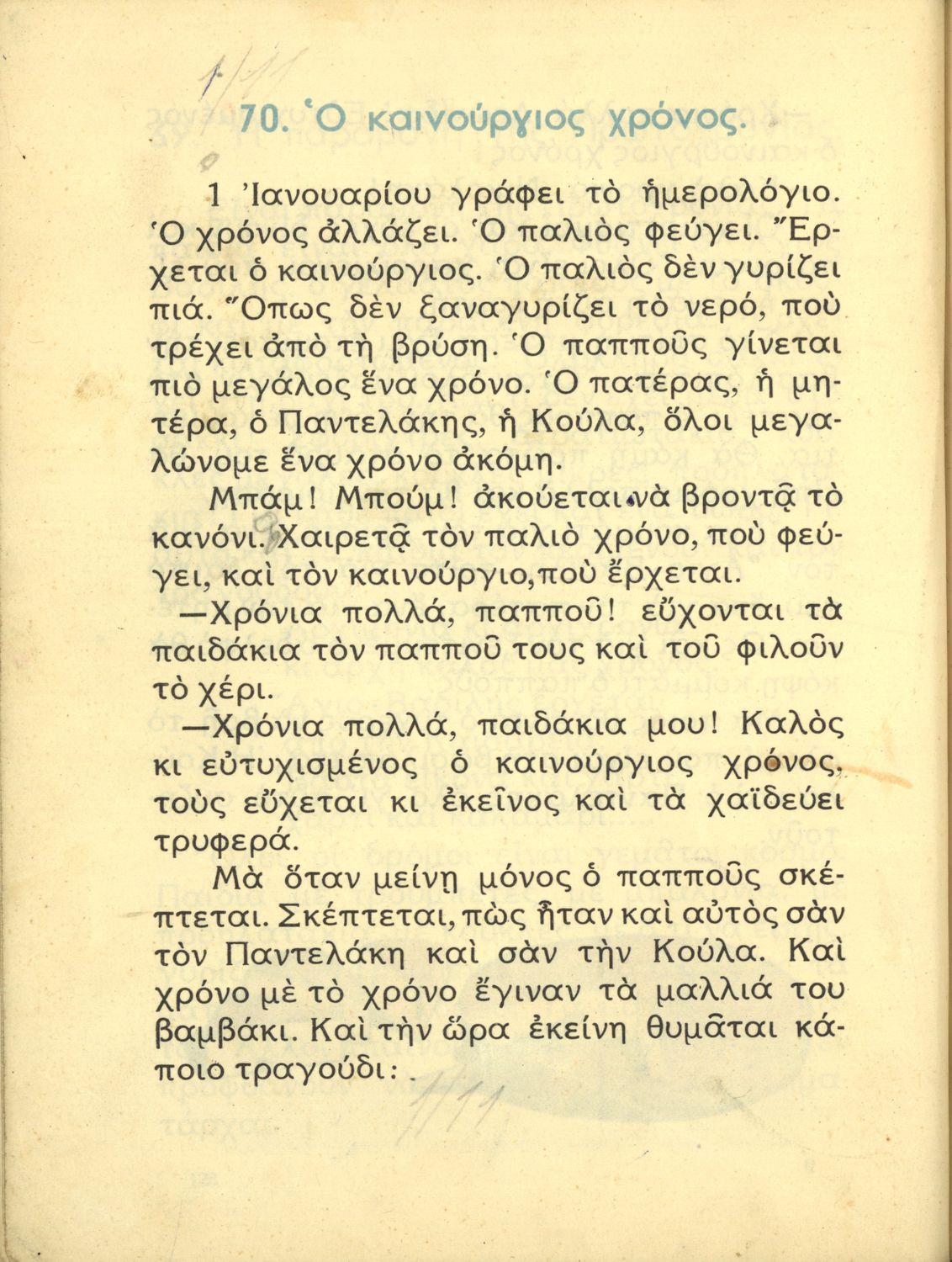 Αναγνωστικό Β΄ Δημοτικού που αποτελείται από πεζά γραμμένα σε καθαρεύουσα και ποιήματα σε δημοτική εμπνευσμένα από την οικογένεια, τη θρησκεία, την πατρίδα, την ελληνική φύση και ύπαιθρο, την αγάπη για τα ζώα,