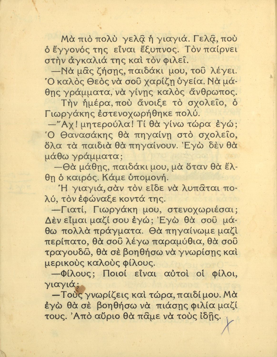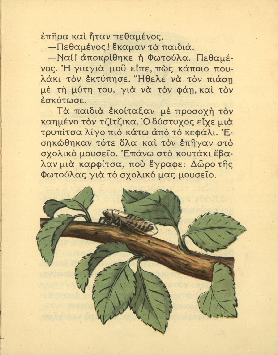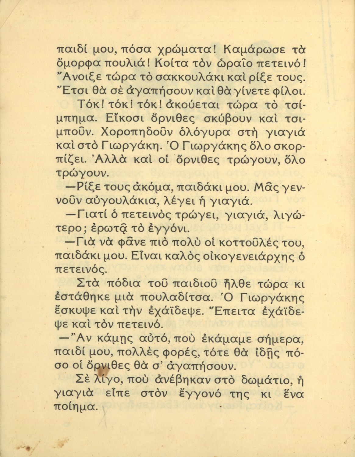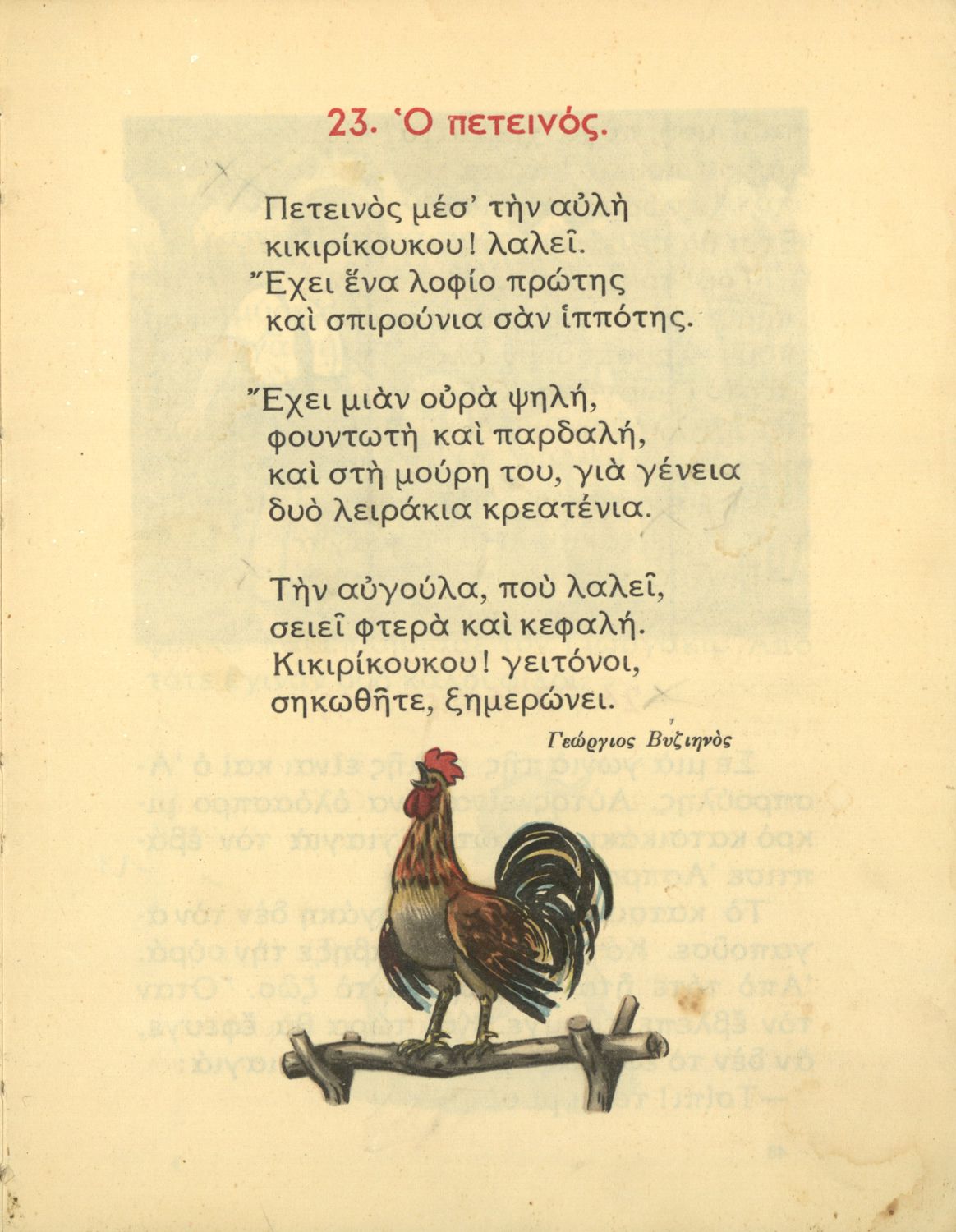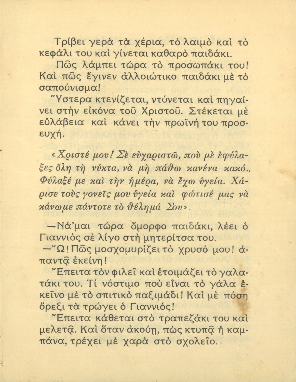 Αναγνωστικό Β΄ Δημοτικού που αποτελείται από πεζά γραμμένα σε καθαρεύουσα και ποιήματα σε δημοτική εμπνευσμένα από την οικογένεια, τη θρησκεία, την πατρίδα, την ελληνική φύση και ύπαιθρο, την αγάπη για τα ζώα,