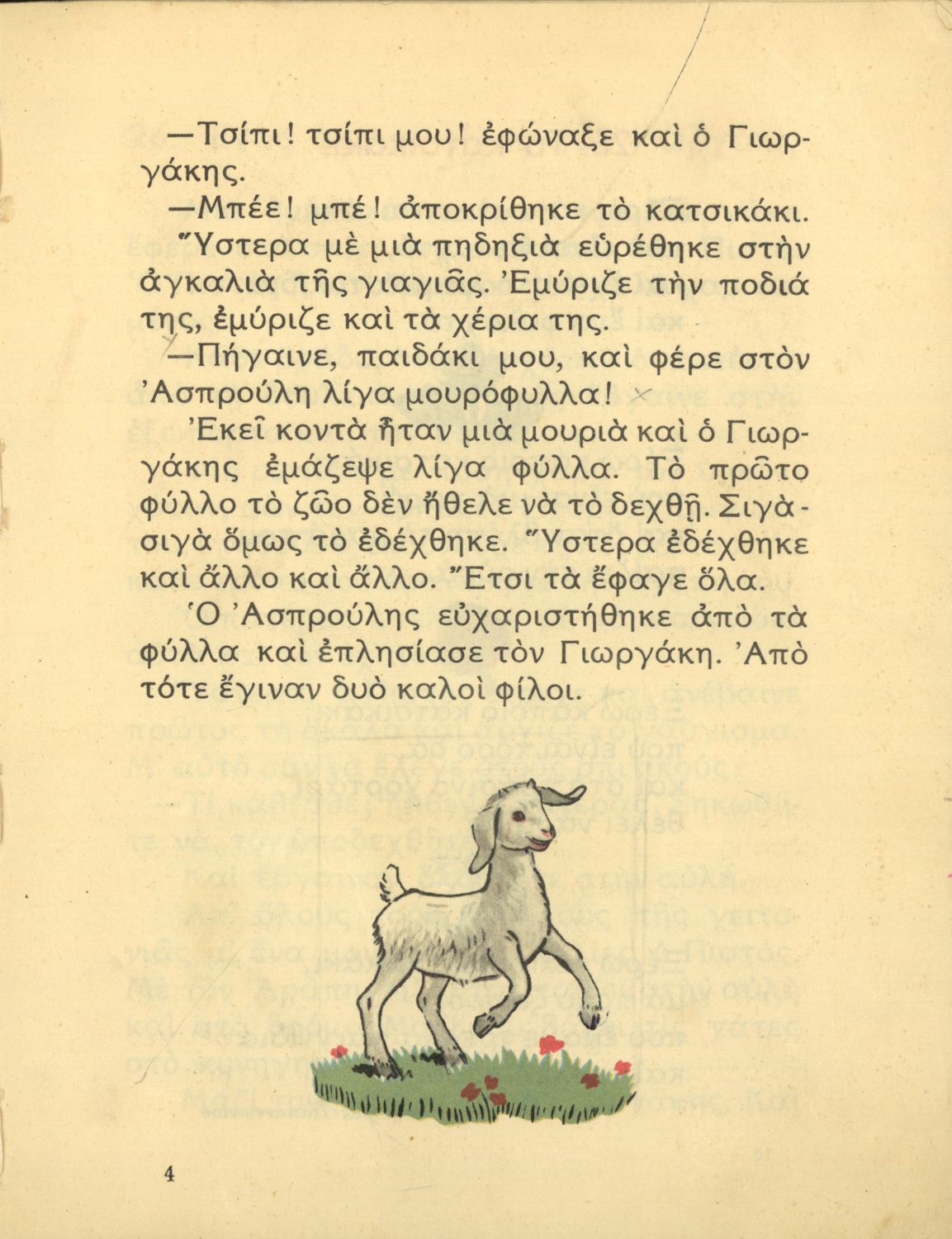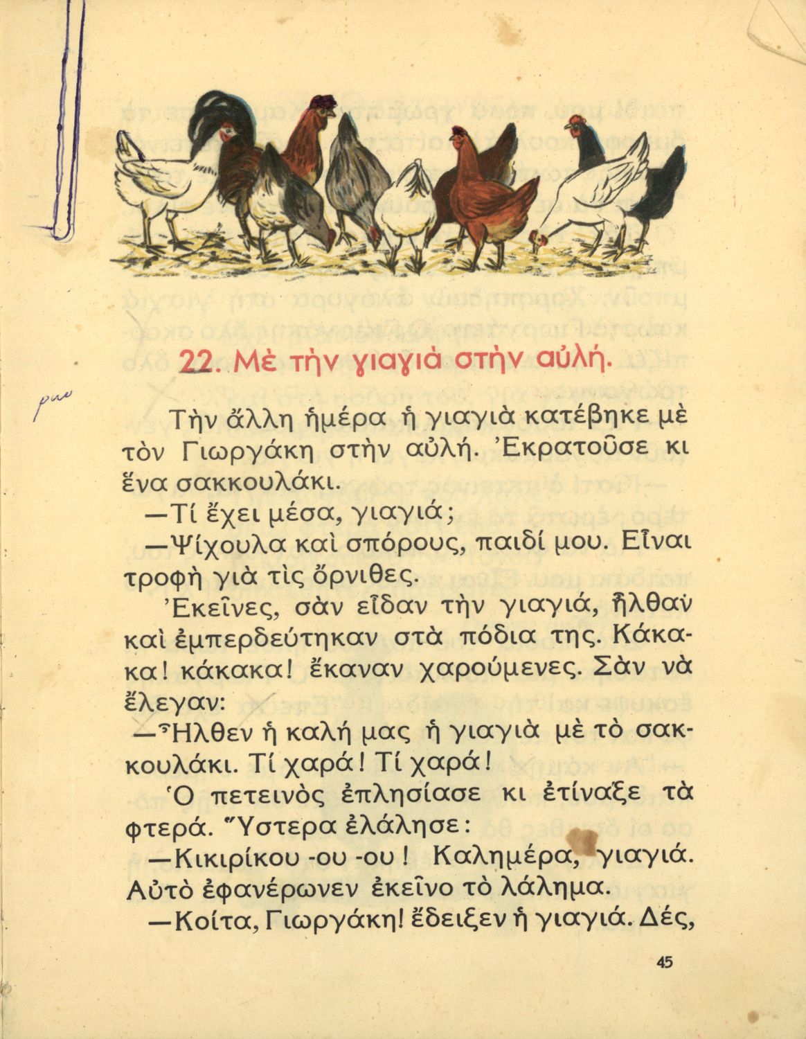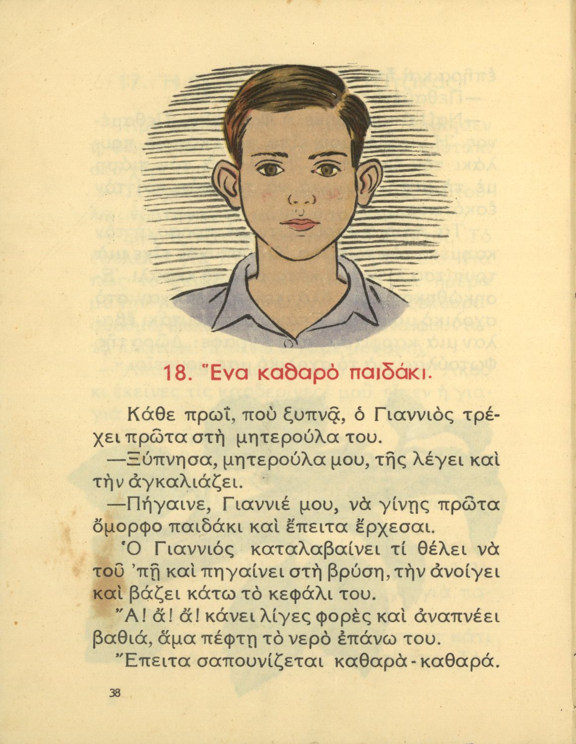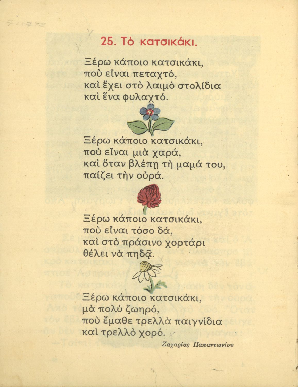 Αναγνωστικό Β΄ Δημοτικού που αποτελείται από πεζά γραμμένα σε καθαρεύουσα και ποιήματα σε δημοτική εμπνευσμένα από την οικογένεια, τη θρησκεία, την πατρίδα, την ελληνική φύση και ύπαιθρο, την αγάπη για τα ζώα,