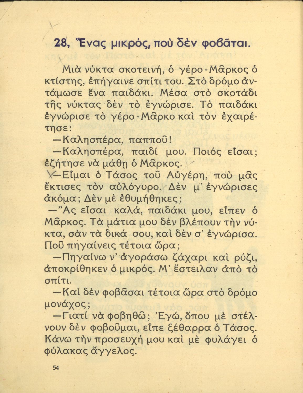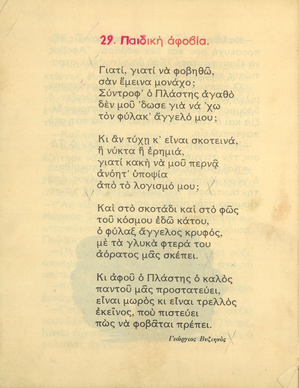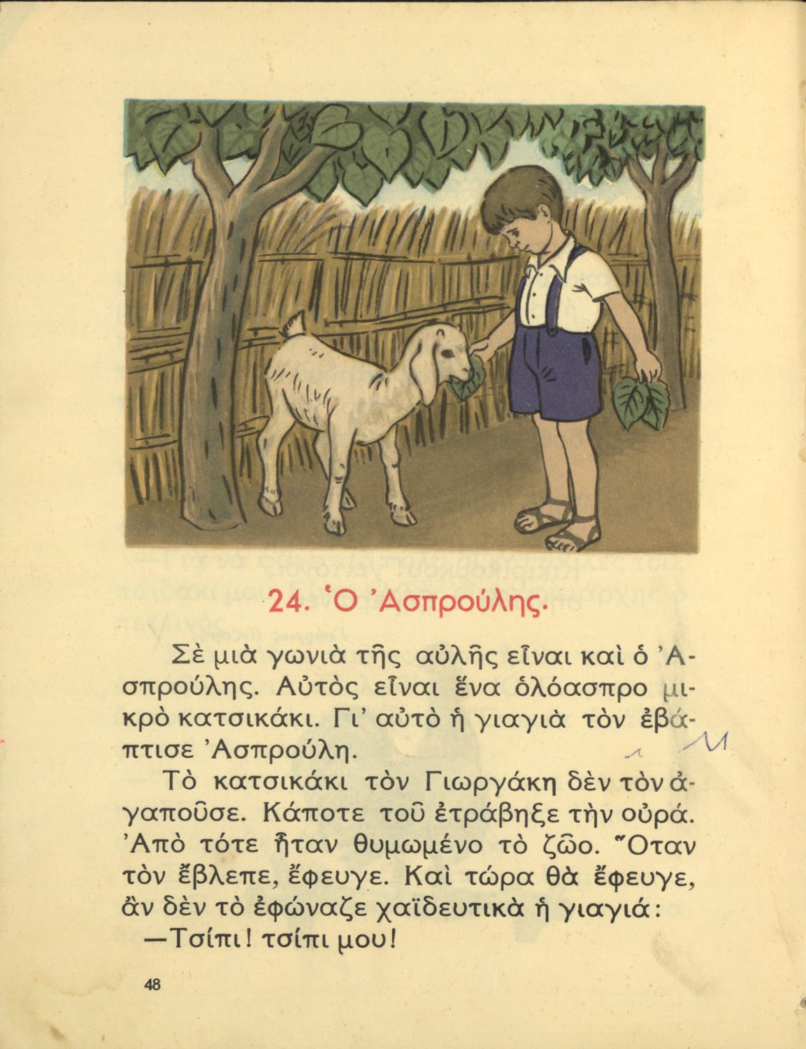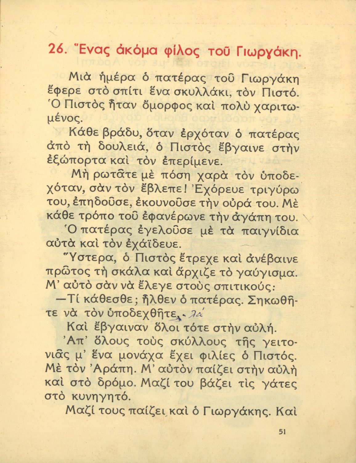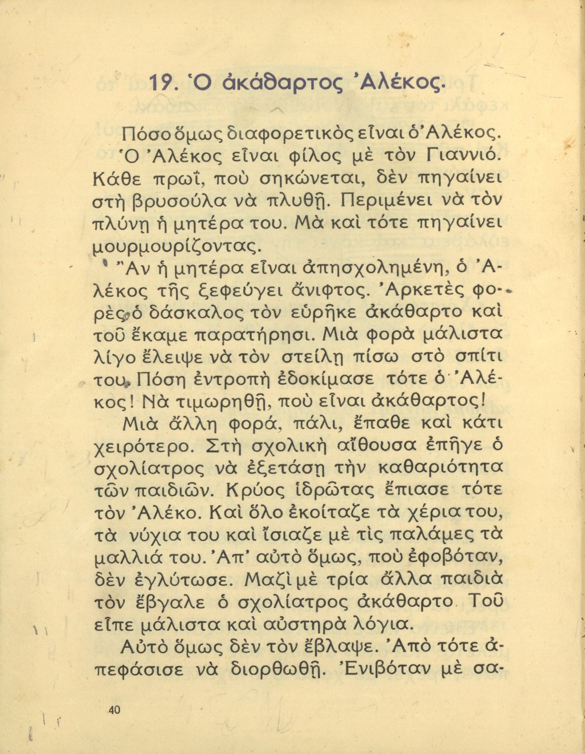 Αναγνωστικό Β΄ Δημοτικού που αποτελείται από πεζά γραμμένα σε καθαρεύουσα και ποιήματα σε δημοτική εμπνευσμένα από την οικογένεια, τη θρησκεία, την πατρίδα, την ελληνική φύση και ύπαιθρο, την αγάπη για τα ζώα,