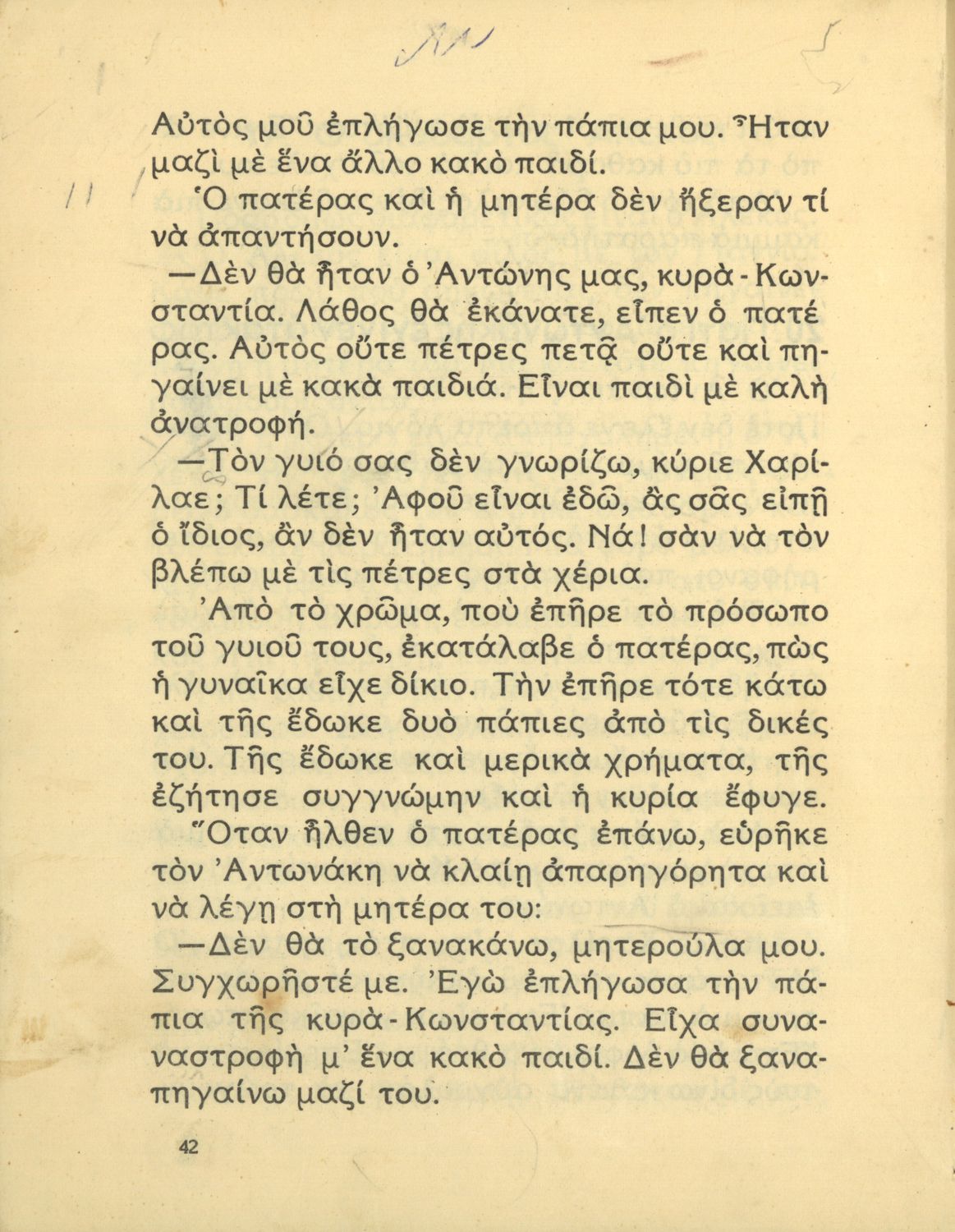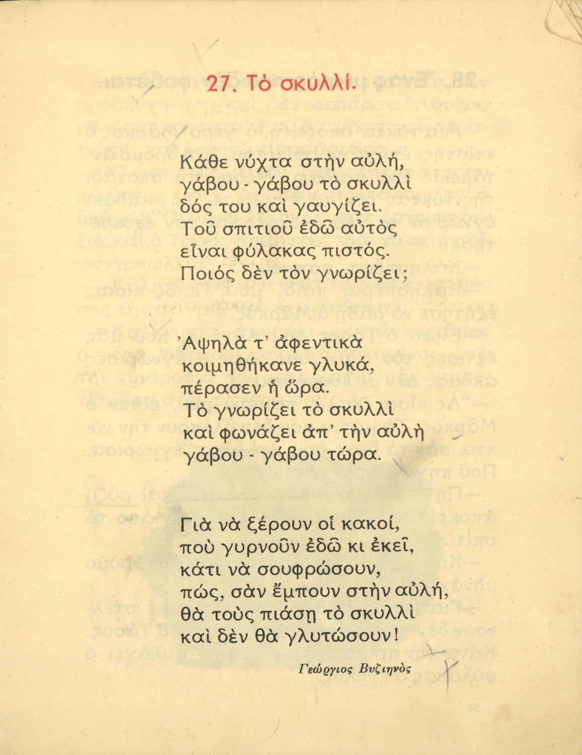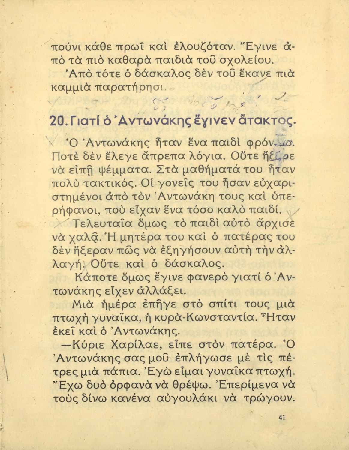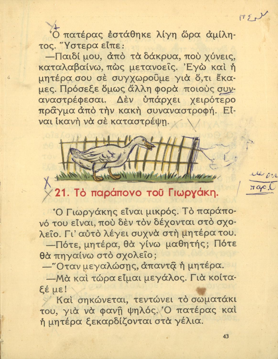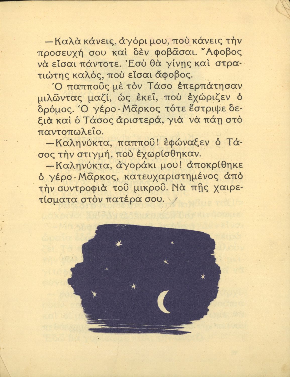 Αναγνωστικό Β΄ Δημοτικού που αποτελείται από πεζά γραμμένα σε καθαρεύουσα και ποιήματα σε δημοτική εμπνευσμένα από την οικογένεια, τη θρησκεία, την πατρίδα, την ελληνική φύση και ύπαιθρο, την αγάπη για τα ζώα,
