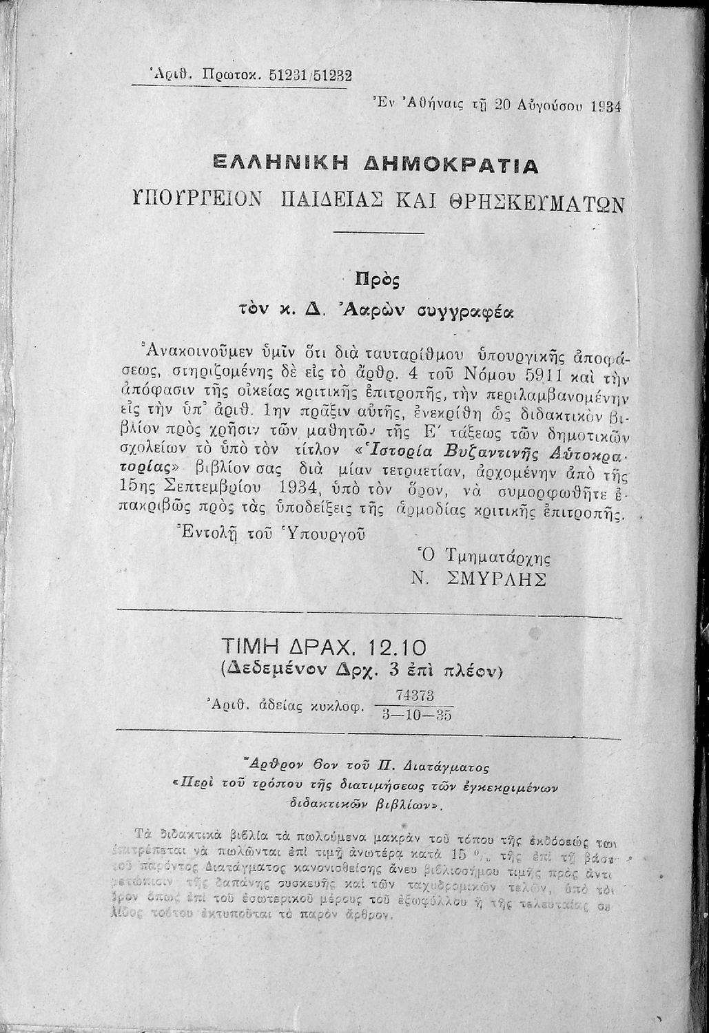 Υπουργική απόφαση / Σύμβαση: 51231/20-8-1934
