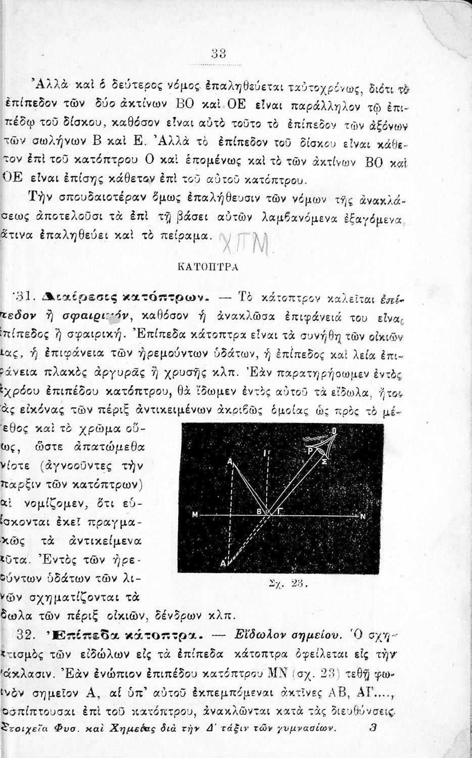 Παρουσίαση περιεχομένου: Σχολικό εγχειρίδιο Φυσικής και Χημείας για τη Δ΄ Γυμνασίου που περιλαμβάνει στοιχεία ακουστικής, οπτικής, μαγνητισμού, ηλεκτρισμού και οργανικής χημείας. Ο συγγραφέας ήταν καθηγητής της Φυσικής στο Εθνικό Πανεπιστήμιο.