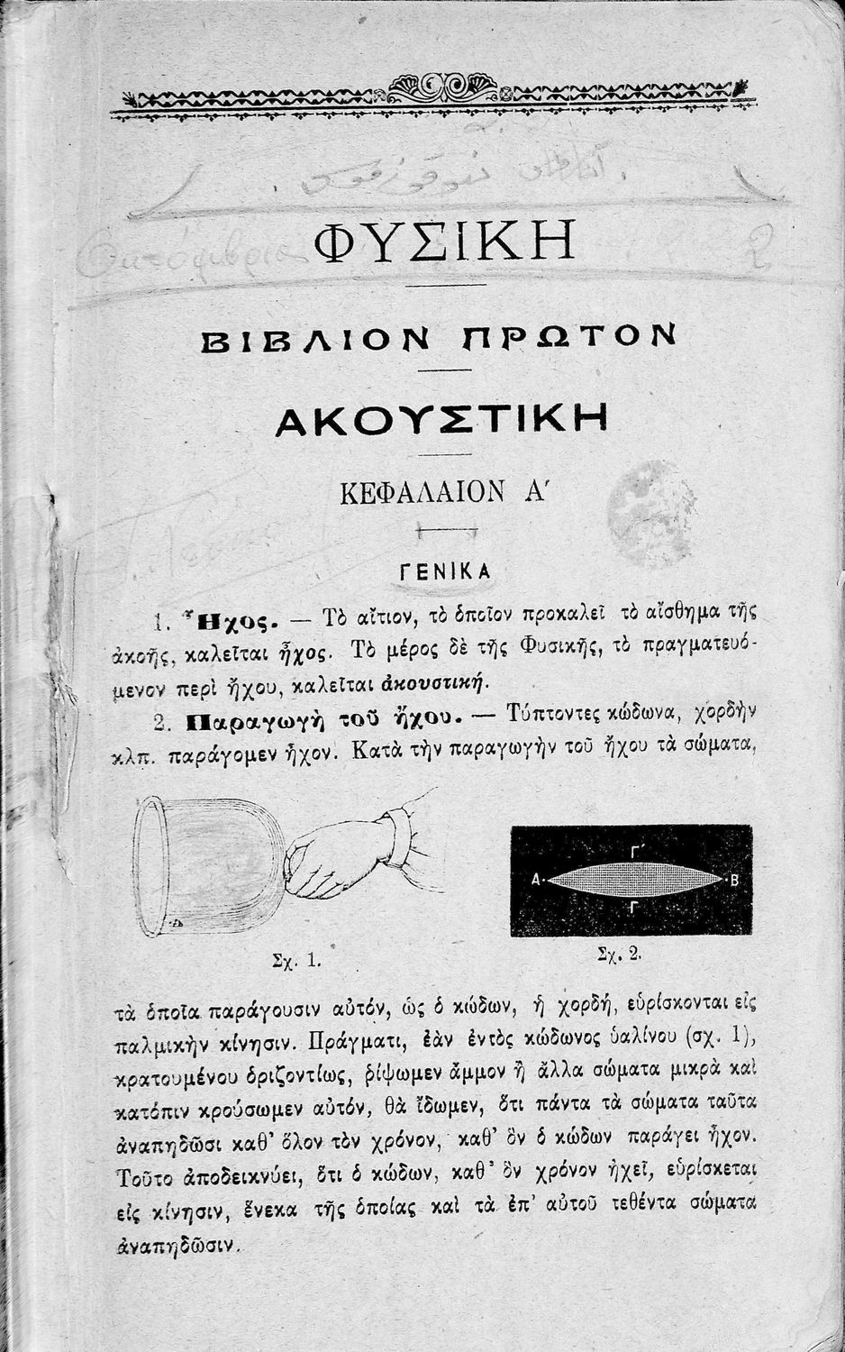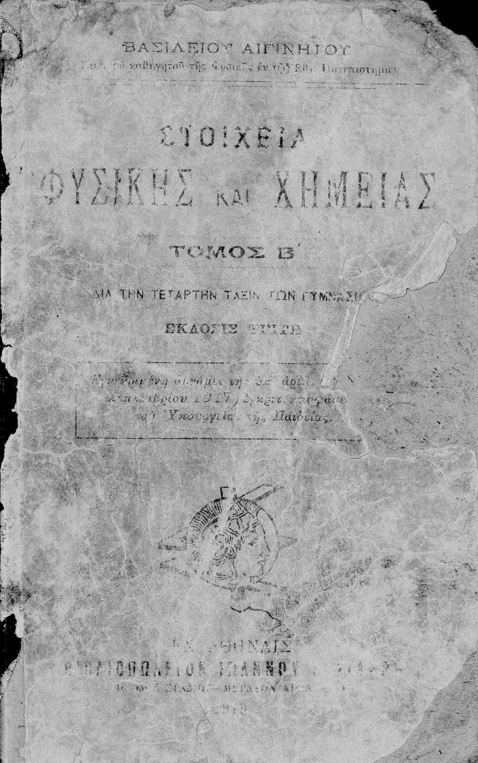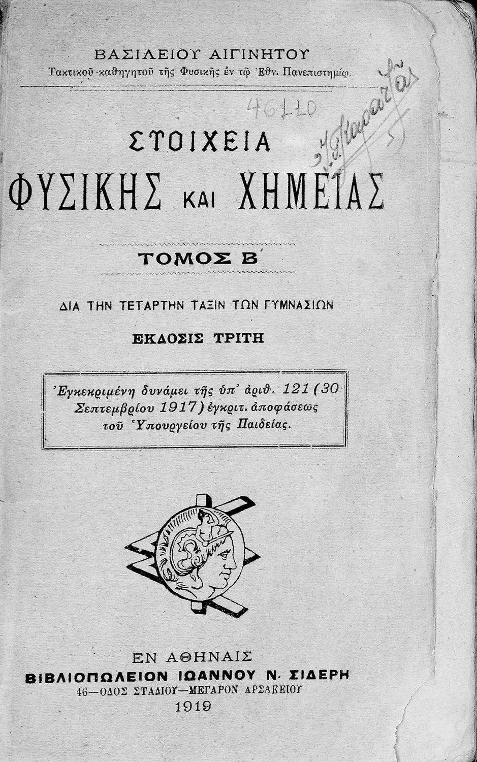 Σχολικό εγχειρίδιο Φυσικής και Χημείας για τη Δ΄ Γυμνασίου που περιλαμβάνει στοιχεία ακουστικής, οπτικής, μαγνητισμού, ηλεκτρισμού και οργανικής χημείας. Ο συγγραφέας ήταν καθηγητής της Φυσικής στο Εθνικό Πανεπιστήμιο.